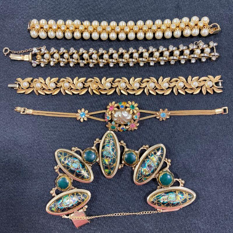 This gorgeous lot has a little bit of everything. Mid-Century rhinestones, Enamel, Faux Pearls and Art Glass. Markings as follows: Left Three (L-R) 1-Unmarked 2-Lustern (Missing Faux Pearl Noted) 3-Avon Center 11 (Top to Bottom) 1-Unmarked 2-Avon 3-Goldette (Victorian Revival With Faux seed Pearls and Faux Turquoise) 4-Kramer 5-Unmarked 6-Coro 7-Unmarked 8-Unmarked 9-Lisner 10-Unmarked 11-Unmarked Right Three (L-R) 1-Unmarked 2-MC 3-Unmarked