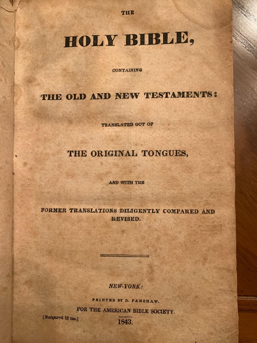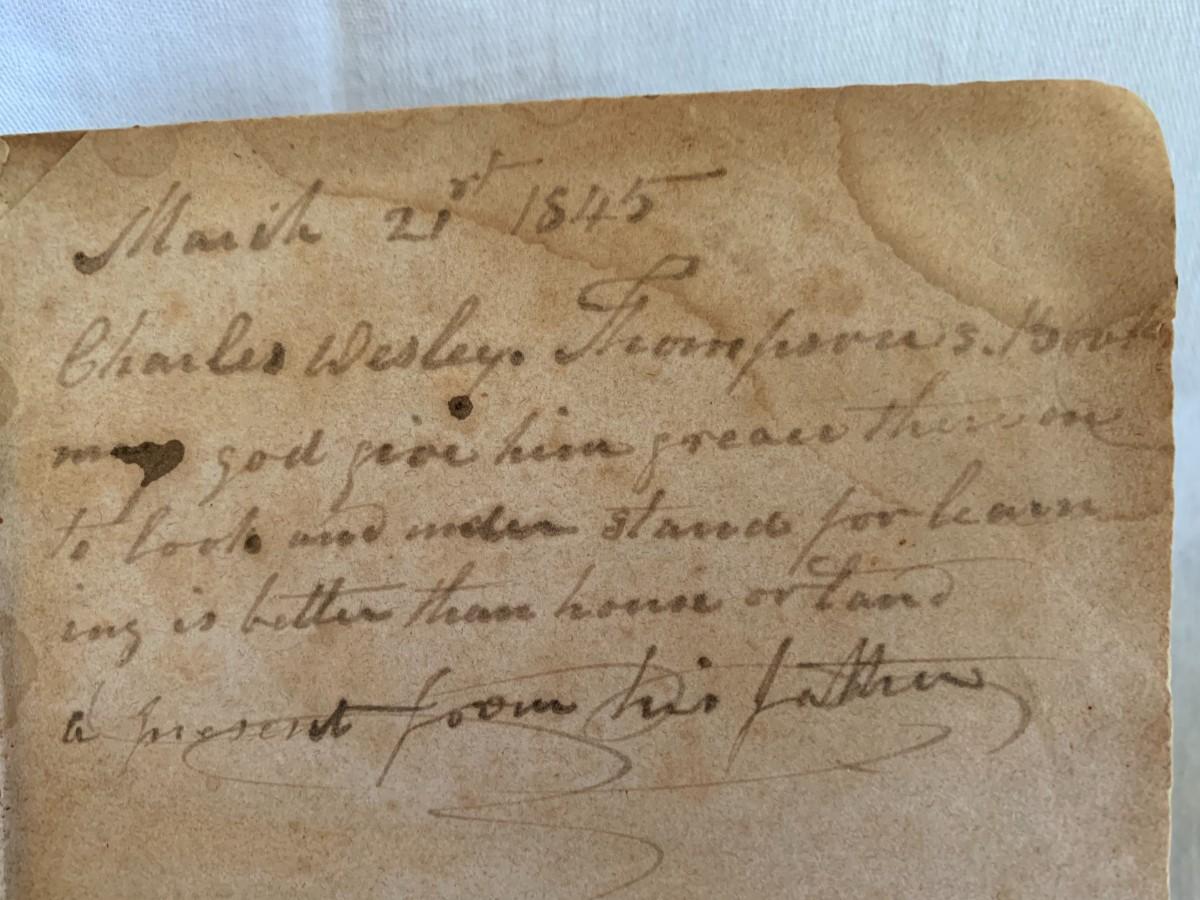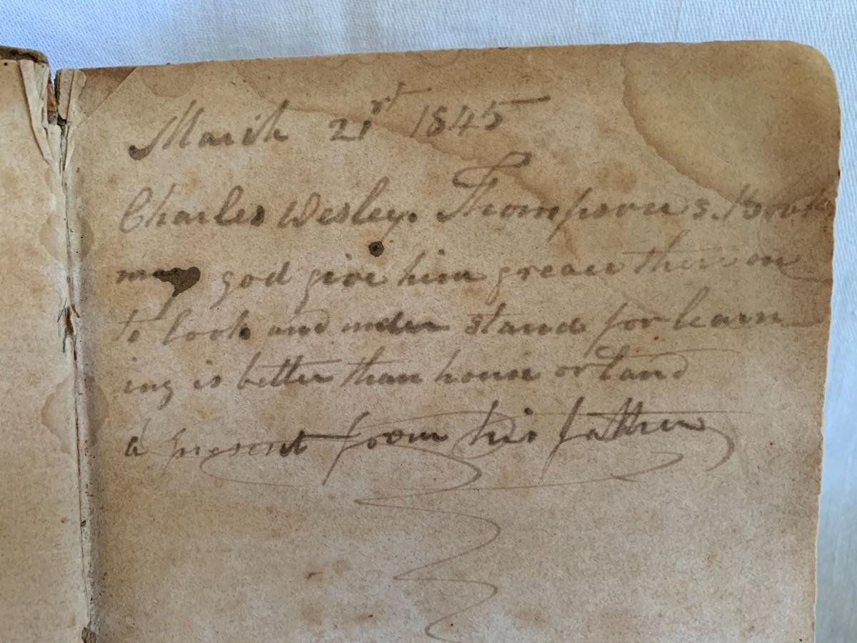 1843 Bible w/ inscription from Charles Wesley to his son.