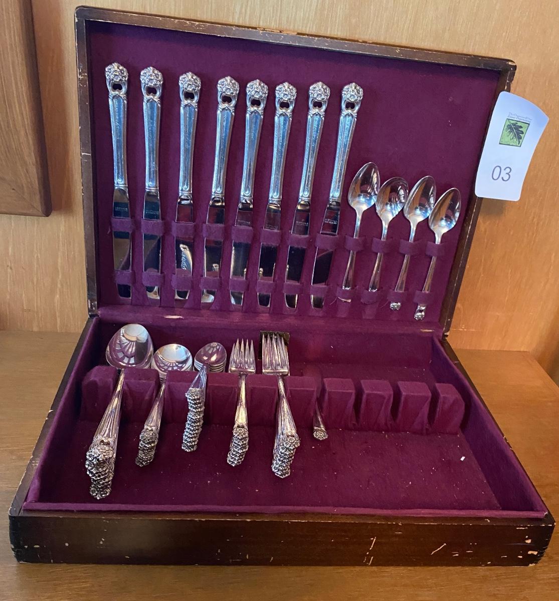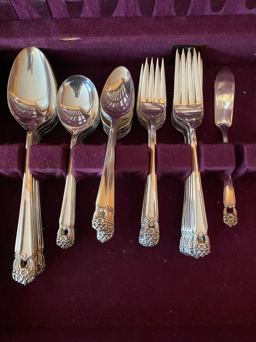 8 knives, 8 large serving spoons, 8 soup spoon, 8 salad fork, 8 dinner fork, 1 butter knife, 16 dessert spoons, 1 serving spoon
