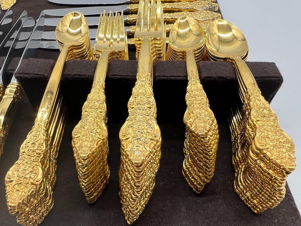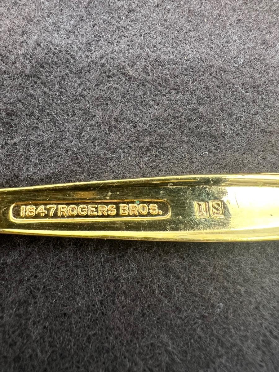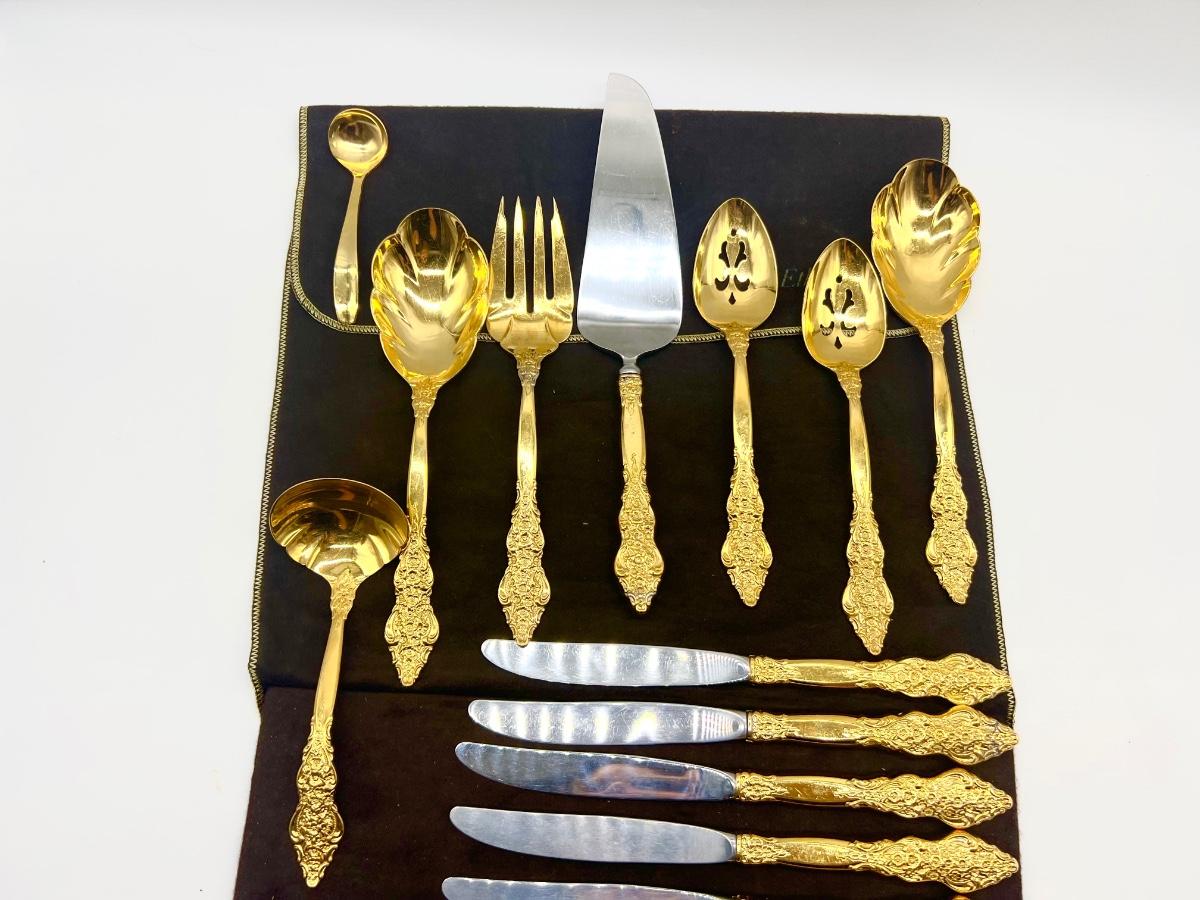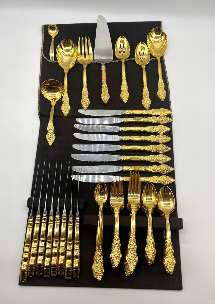 1847 Rogers Bros gold plate, heritage silversmiths set. Includes 16 long handle teaspoons, 16 knives, 16 dinner forks, 15 salad forks, 16 teaspoons, 16 tablespoons, eight piece serving utensils.