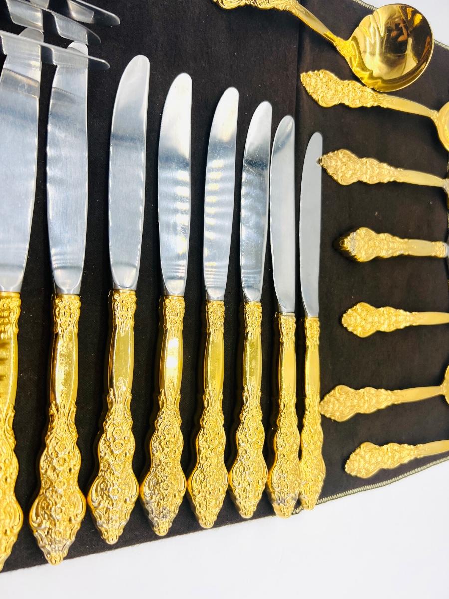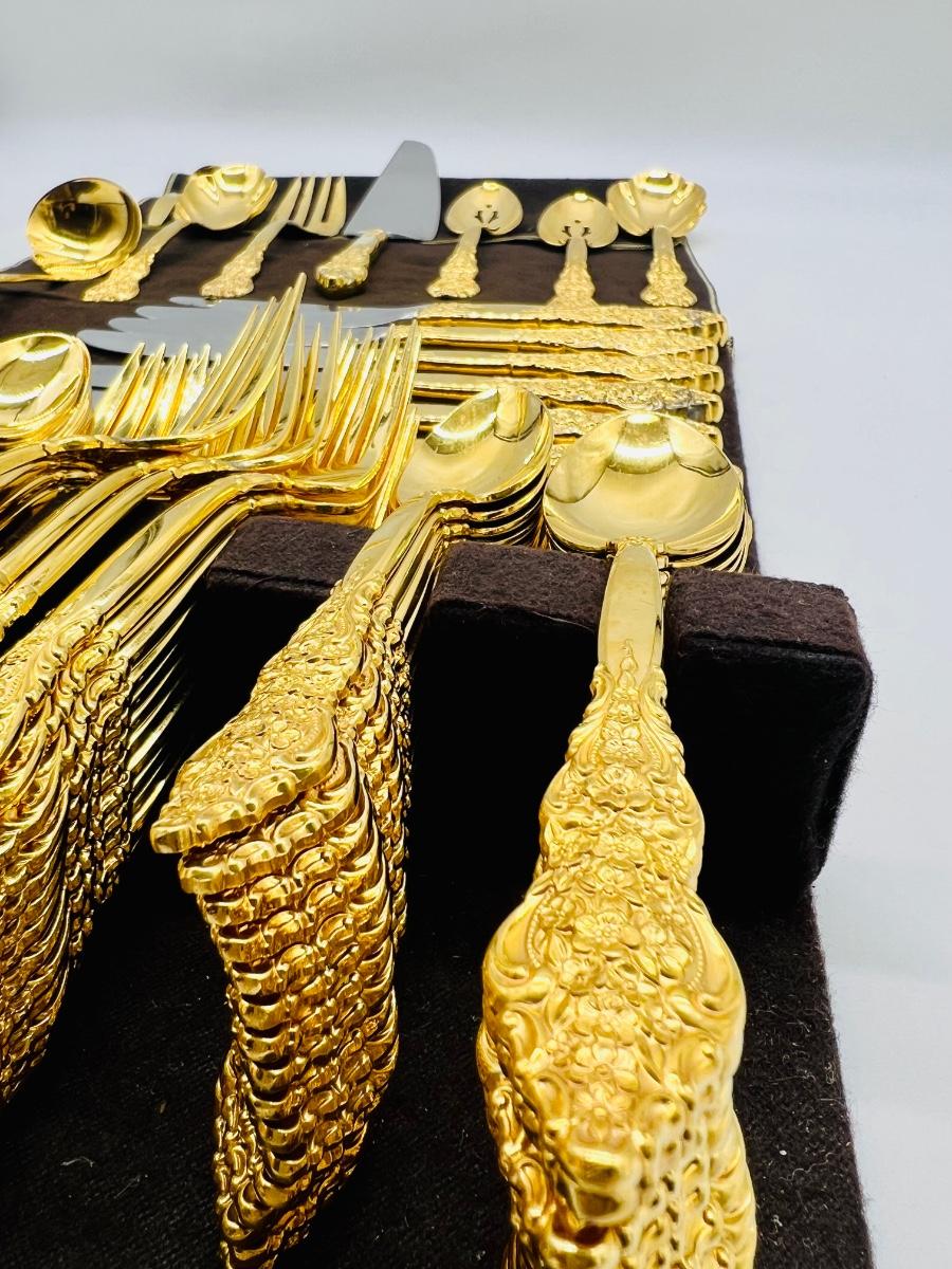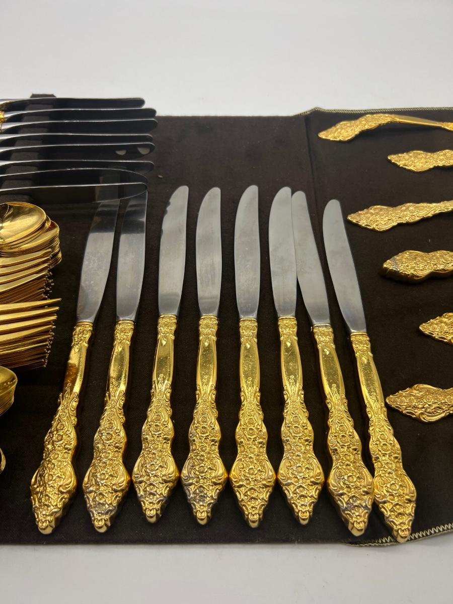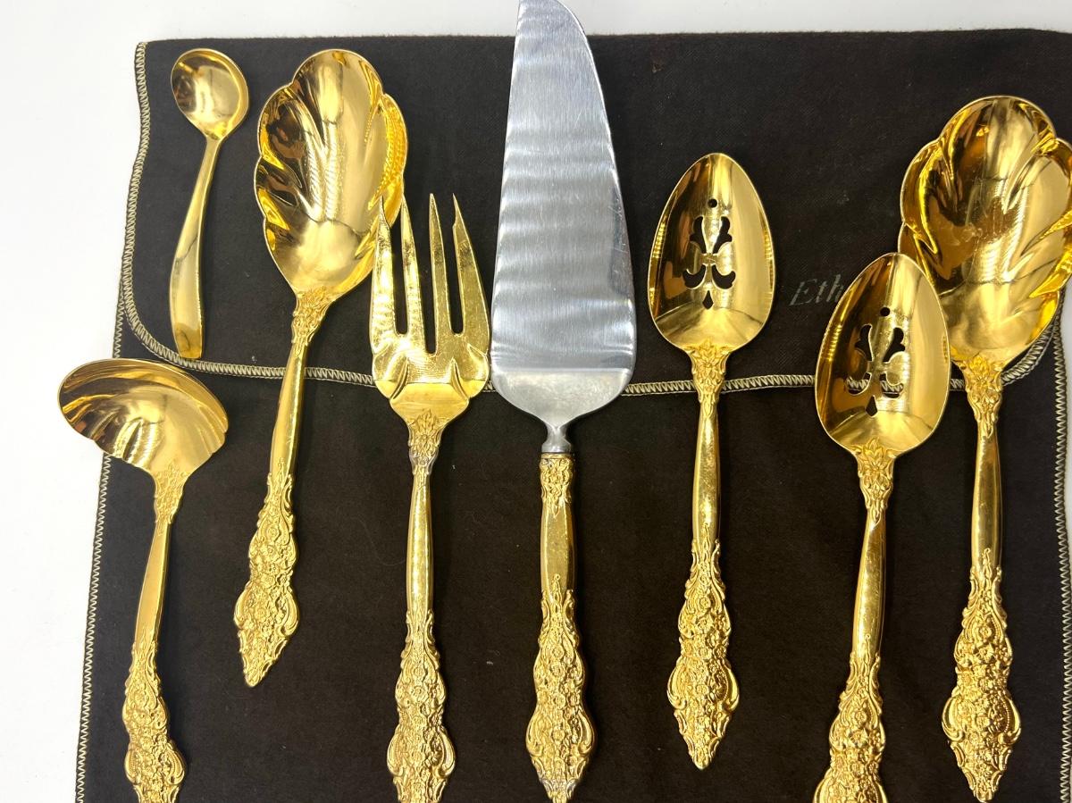 1847 Rogers Bros gold plate, heritage silversmiths set. Includes 16 long handle teaspoons, 16 knives, 16 dinner forks, 15 salad forks, 16 teaspoons, 16 tablespoons, eight piece serving utensils.