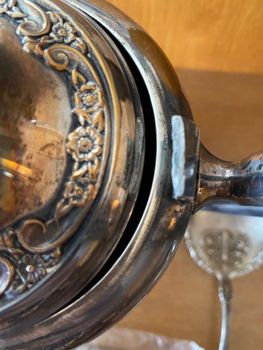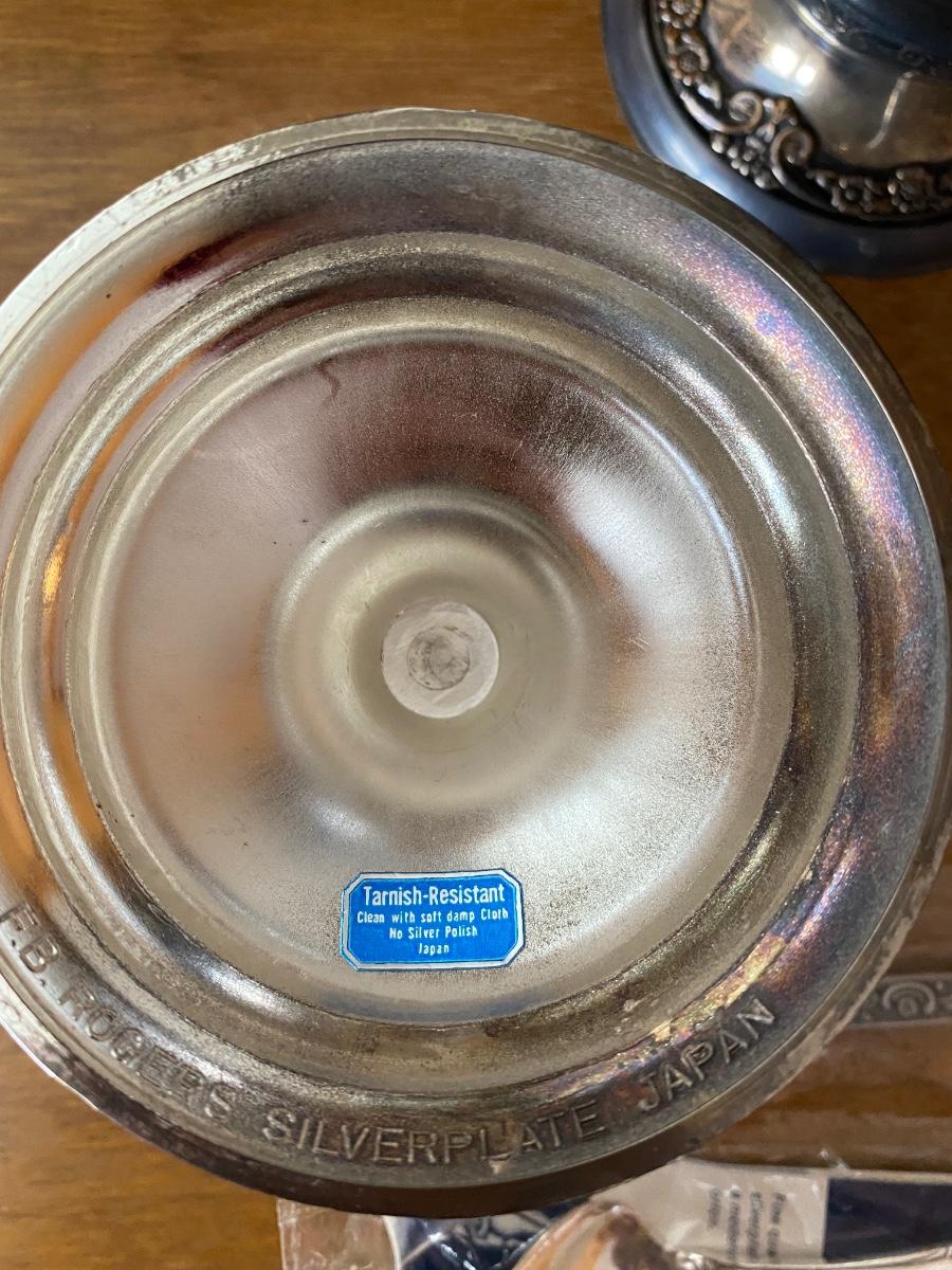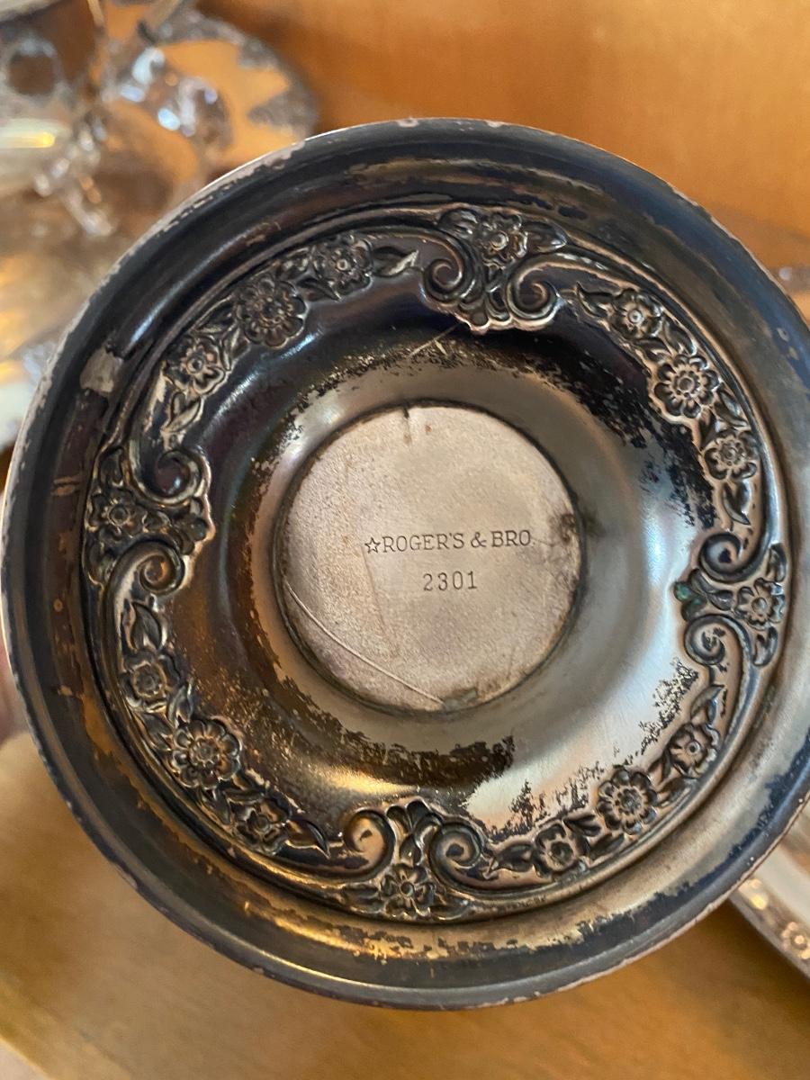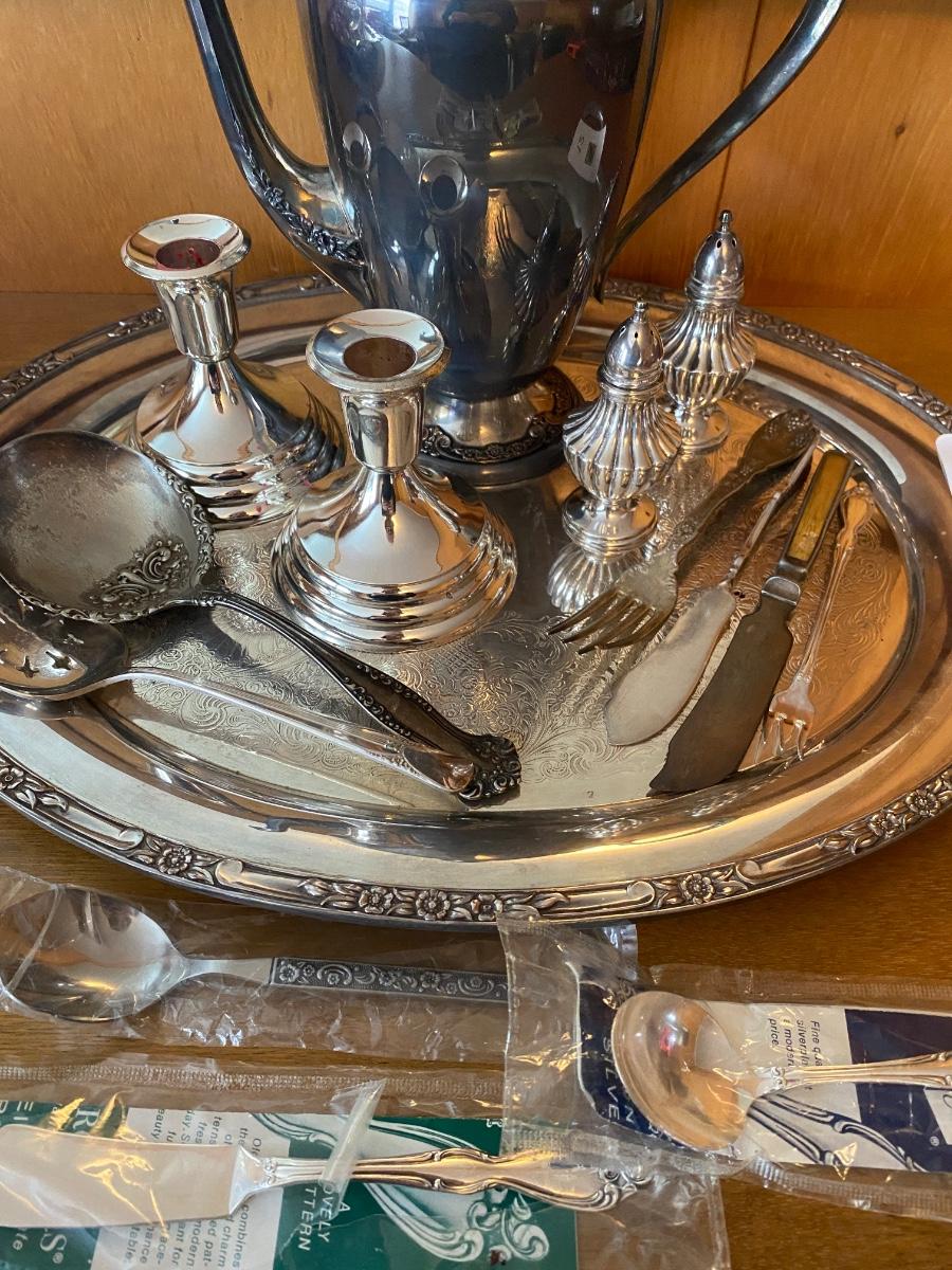 Various items from Rogers Bros. Includes: tray, coffee pot, set of candlesticks, S/P shaker, 9 piece forks/spoons/butter knives.
