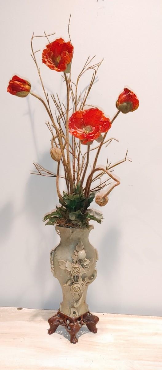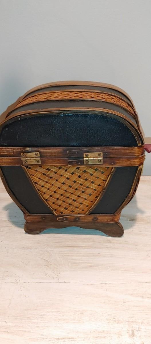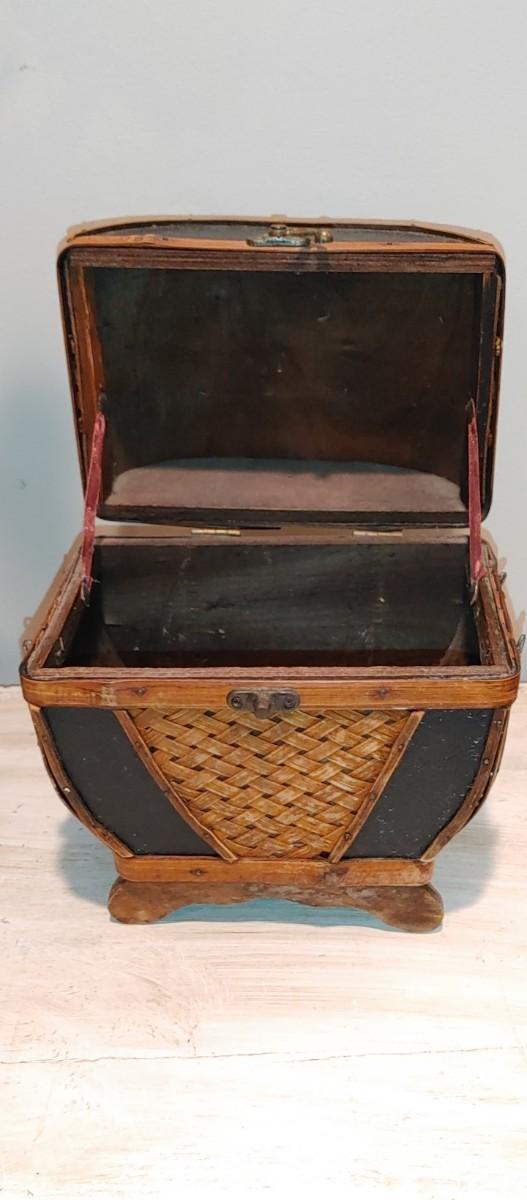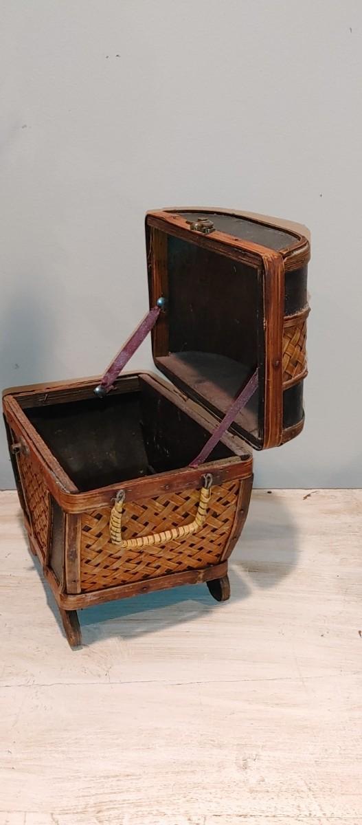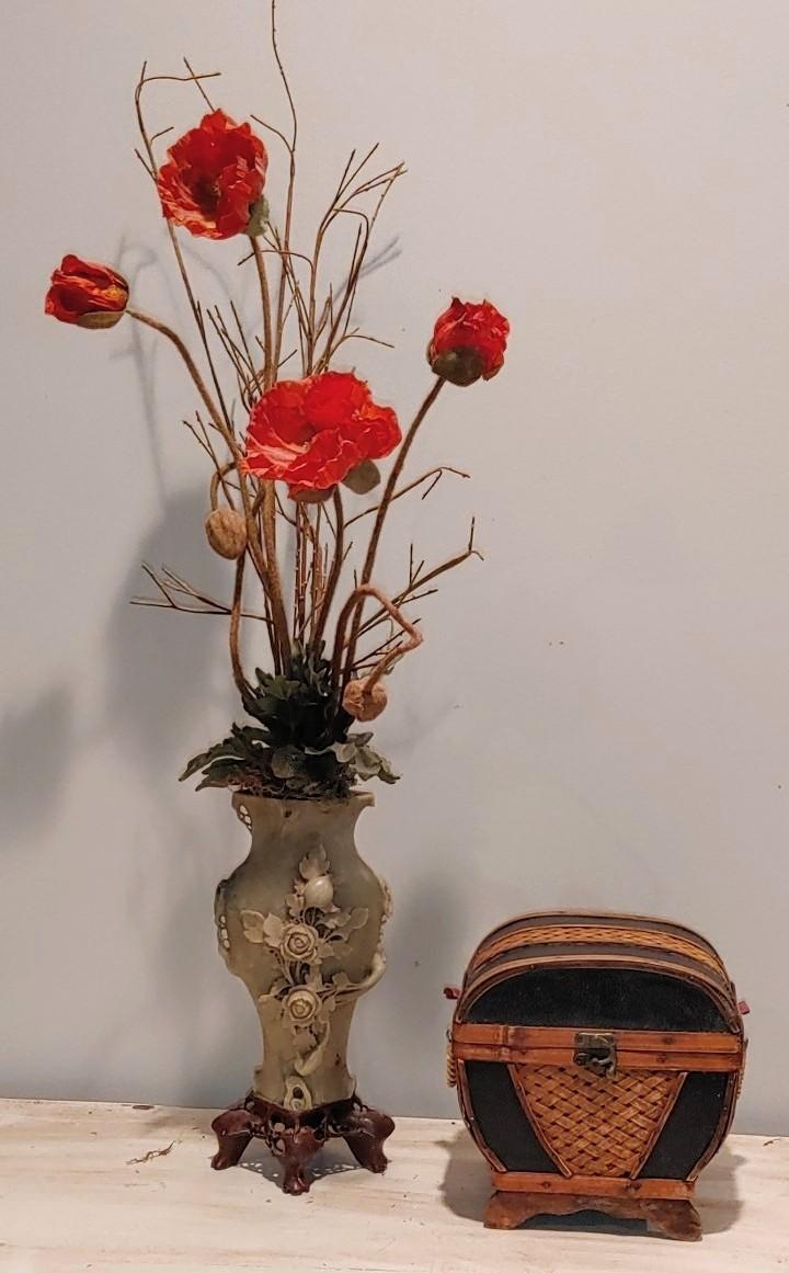 #186 Antique Oriental Carved Soap Stone Vase is so beautiful. Very old part of filigree soap stone carving is missing on one handle I only noticed when I was photographing. Also a beautiful hinged bamboo basket.