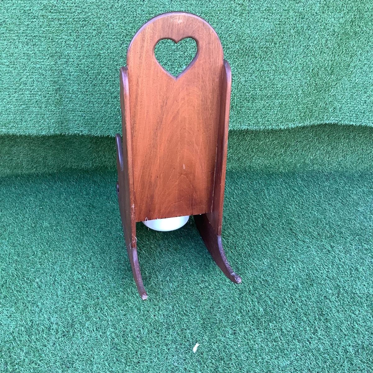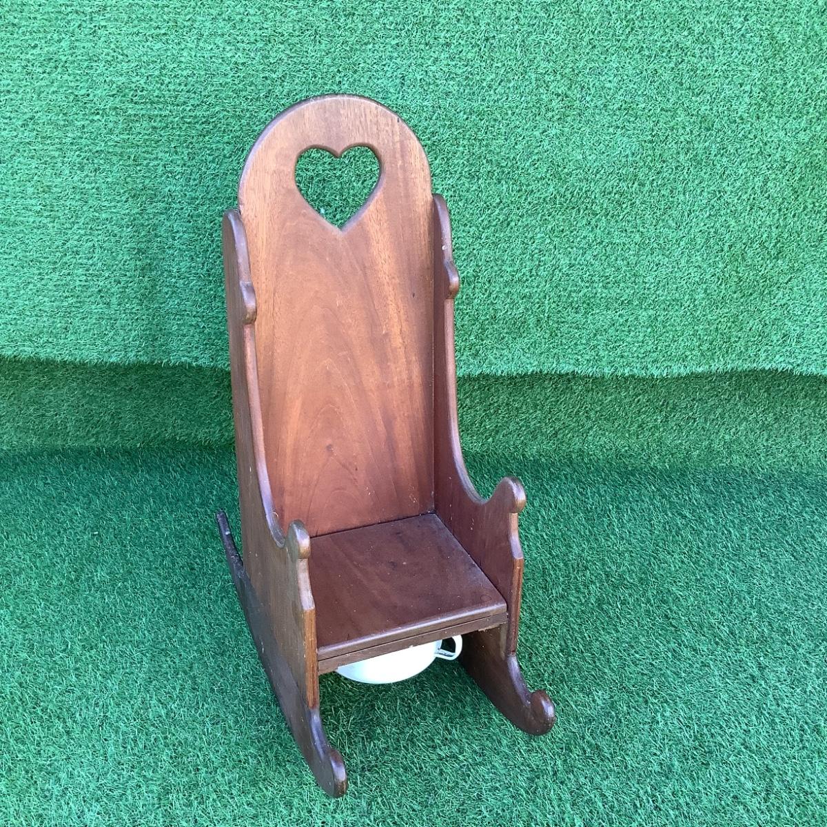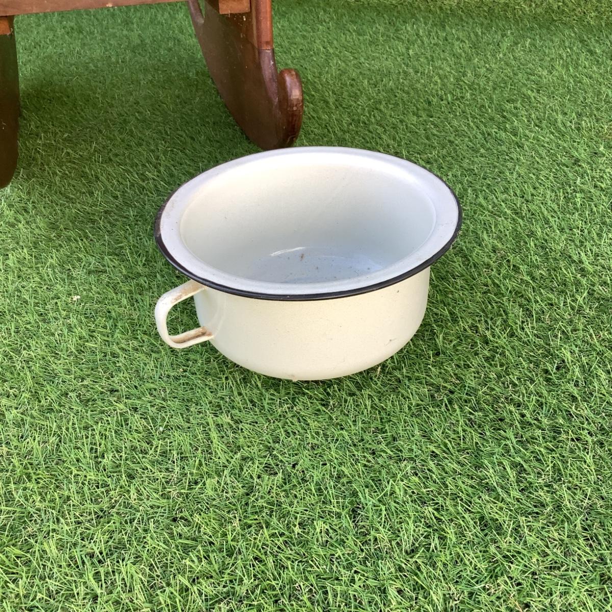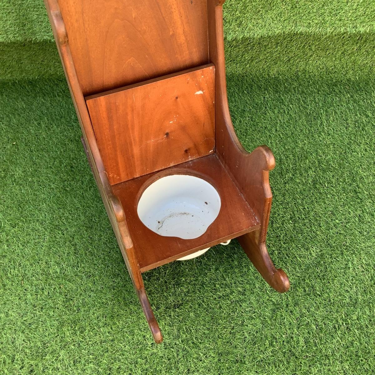 Includes an enamel chamber pot, Measures 31.5"H, 11.5"W, 24.5"D. Age split on wood seat as shown.