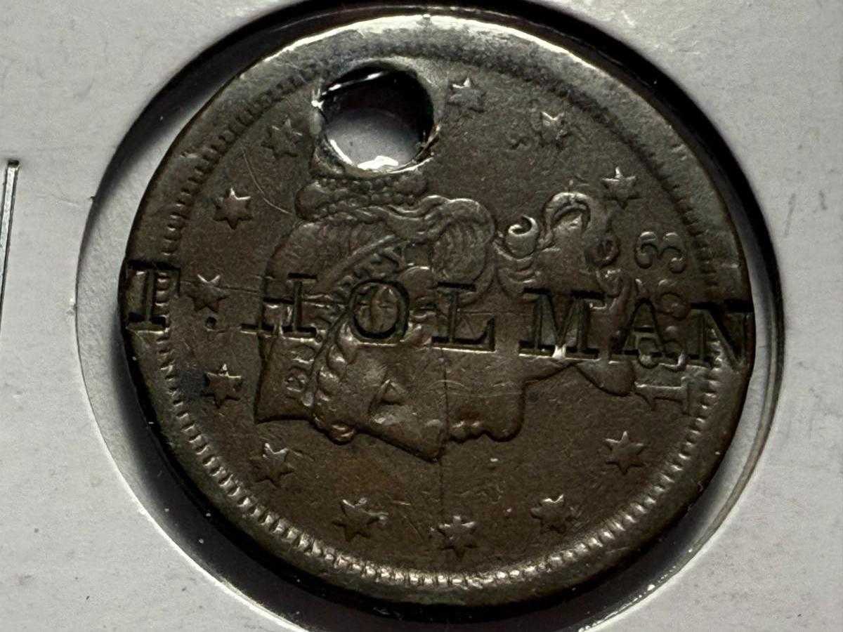 1853 HOLED COUNTERSTAMPED "T. HOLMAN" BRAIDED HAIR LARGE CENT AS PICTURED. $5 DOMESTIC SHIPPING.