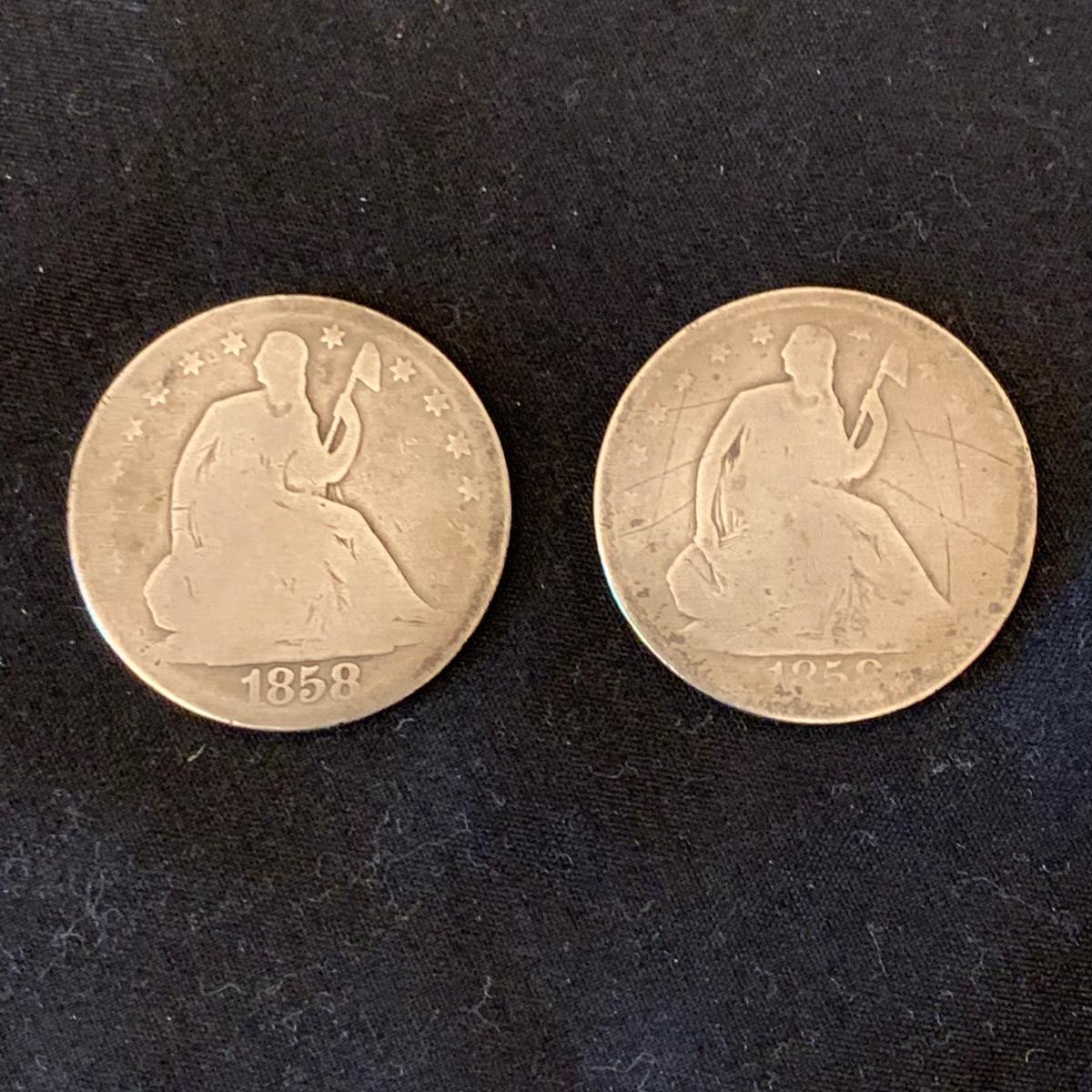 Two 1858 silver Seated Liberty half dollars. Please see photos for condition and other details. Shipping available.