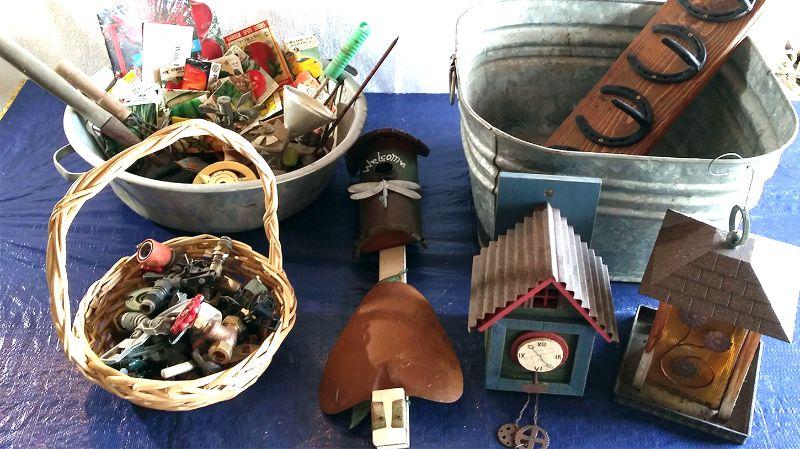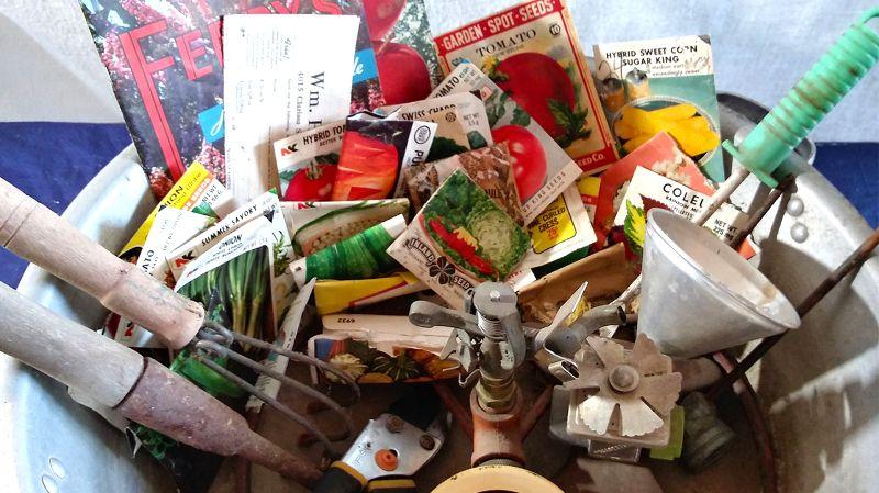 Mirror Aluminum wash pan AGM Co, 2 bird houses, horseshoe hanger, garden stake, old sprinklers, sprinkler heads, old seed packets, square tub, garden tools