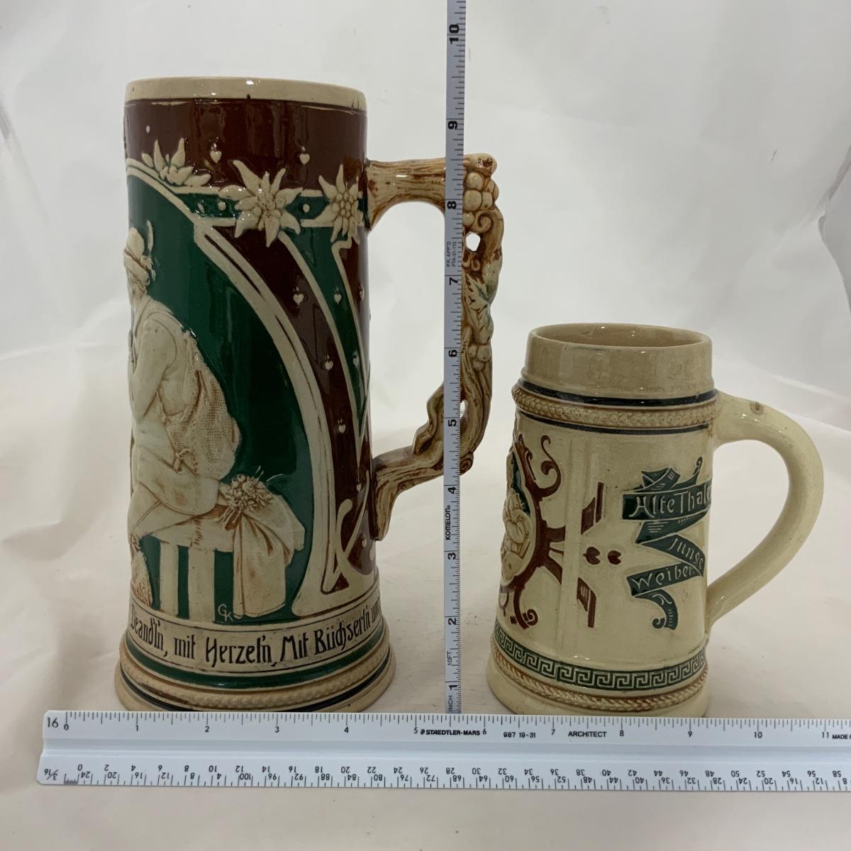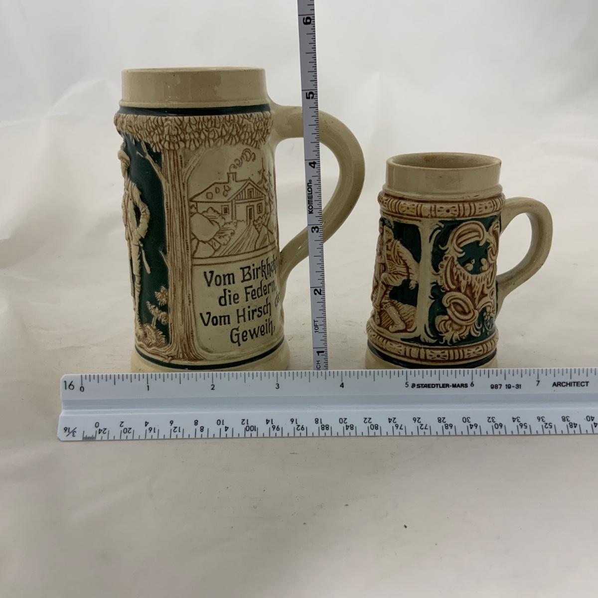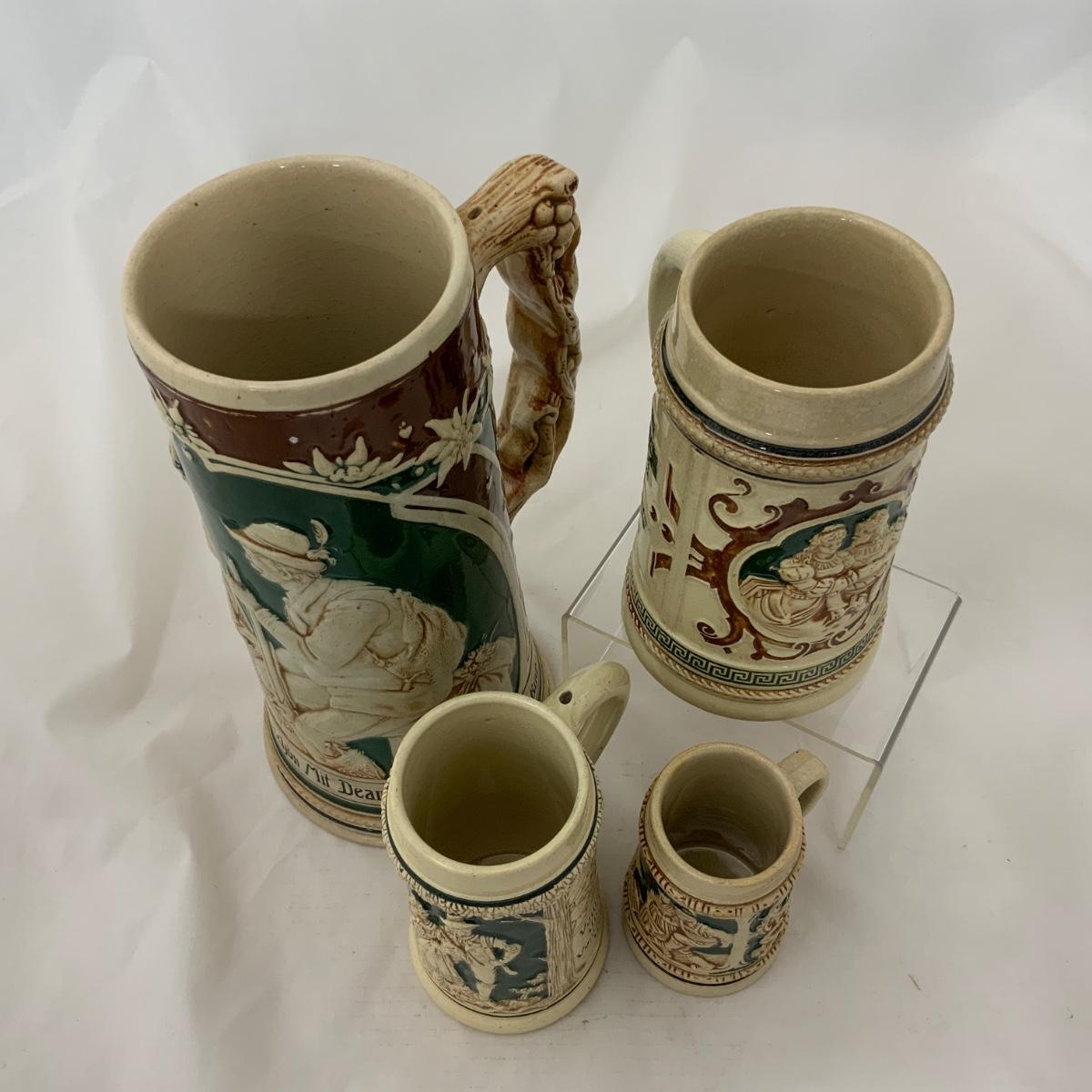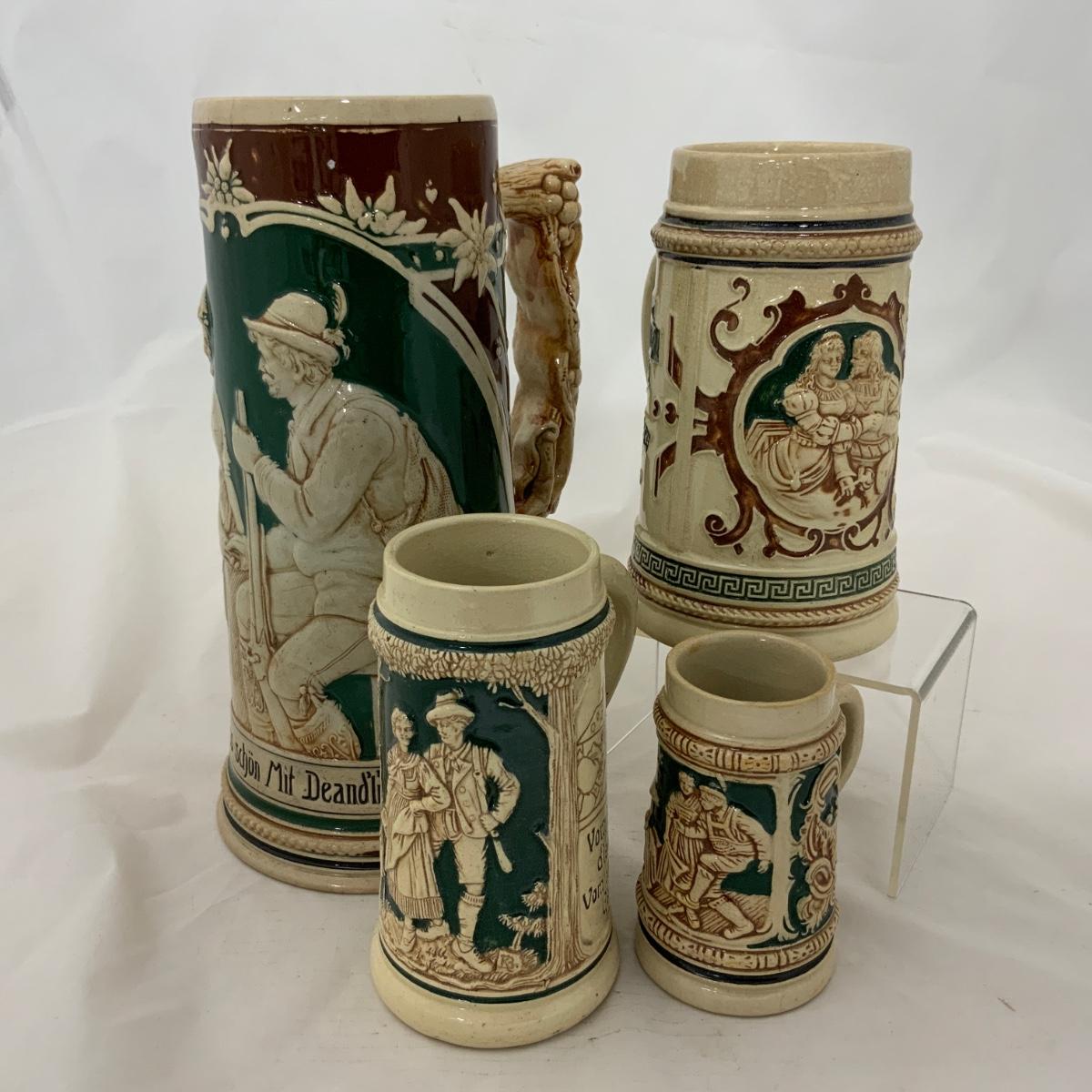 Four attractive Stoneware German Steins. All in exceptional antique condition. Grouped together by color. A nice addition to a collection or a start of one! Please see photos for details and condition. ::: Shipping is available on this lot. If you require shipping you must let us know at the close of the auction. We will coordinate with you after the item has been won. Shipping fees will include insurance up to or exceeding the value of all items being mailed. If you have any questions regarding this lot please contact the auctioneer either via this website, by direct email or by phone. PICK UP TIMES and other important information can be found in the TERMS and DESCRIPTION of the auction. Please take a look for pertinent information. Thanks!