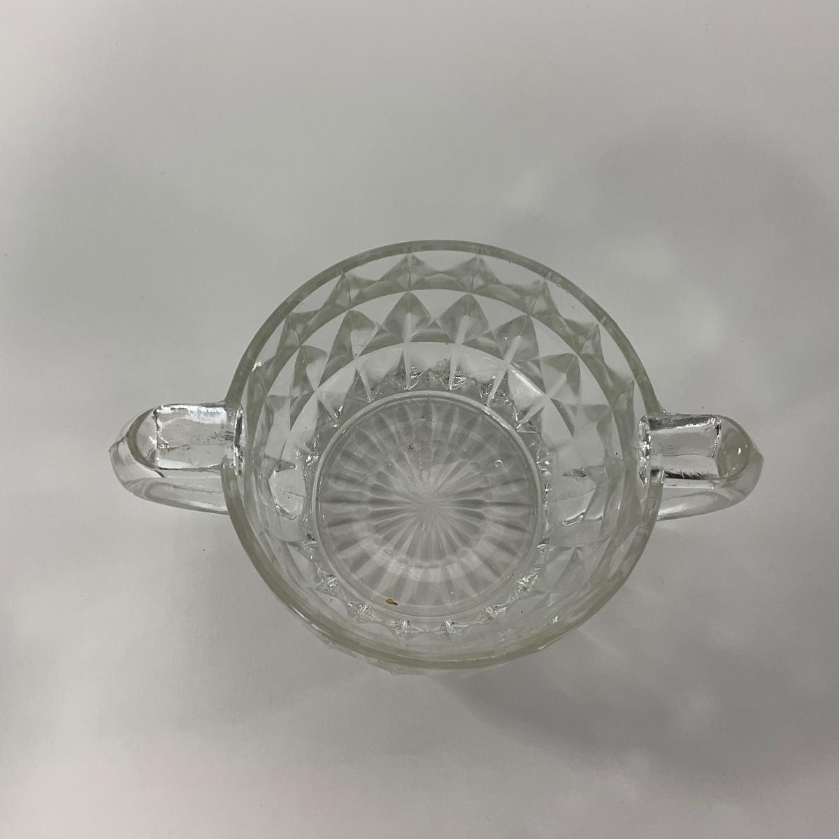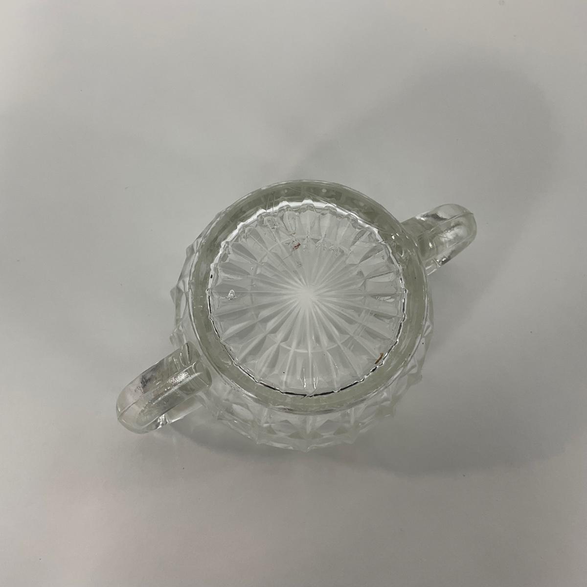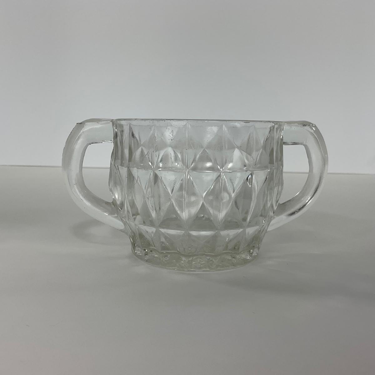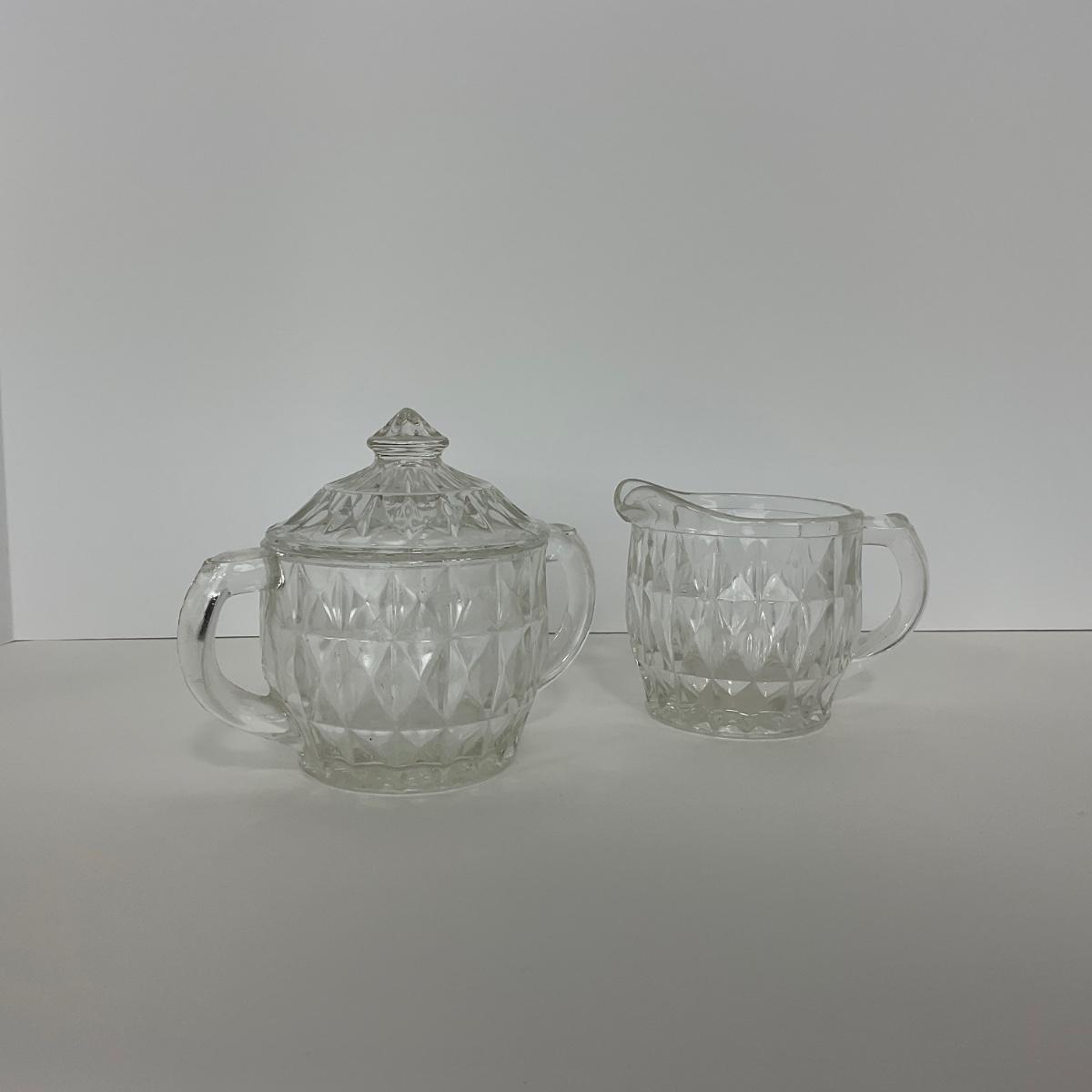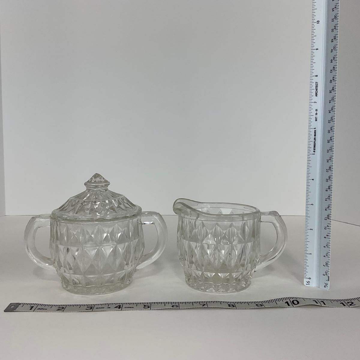 Two clear glass Windsor Diamond Jeanette Glass Co. (1932-1946) pieces including one lidded sugar and one creamer. Please see photos for details and condition. ::: Shipping is available on this lot. If you require shipping you must let us know at the close of the auction. We will coordinate with you after the item has been won. Shipping fees will include insurance up to or exceeding the value of all items being mailed. If you have any questions regarding this lot please contact the auctioneer either via this website, by direct email or by phone. PICK UP TIMES and other important information can be found in the TERMS and DESCRIPTION of the auction. Please take a look for pertinent information. Thanks!