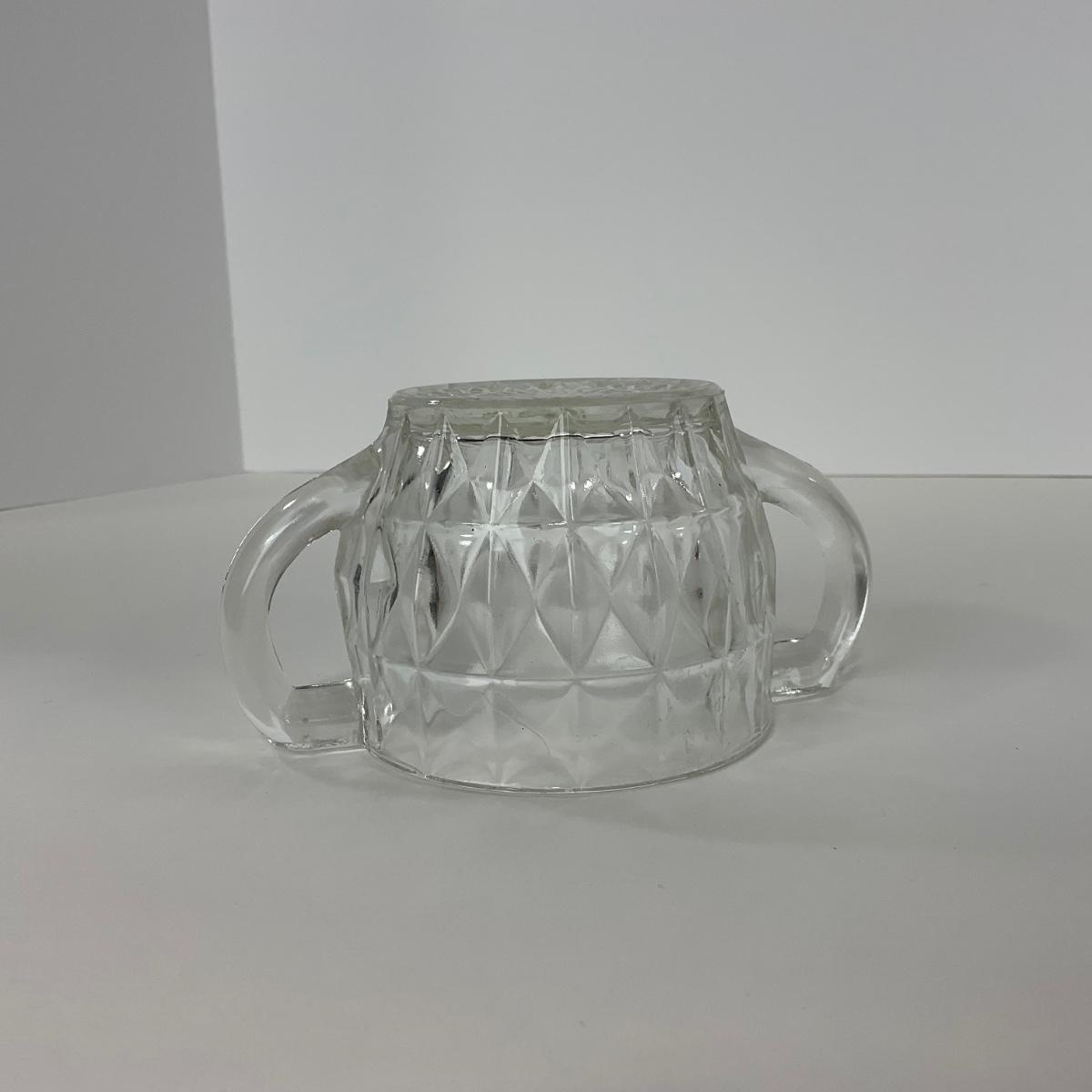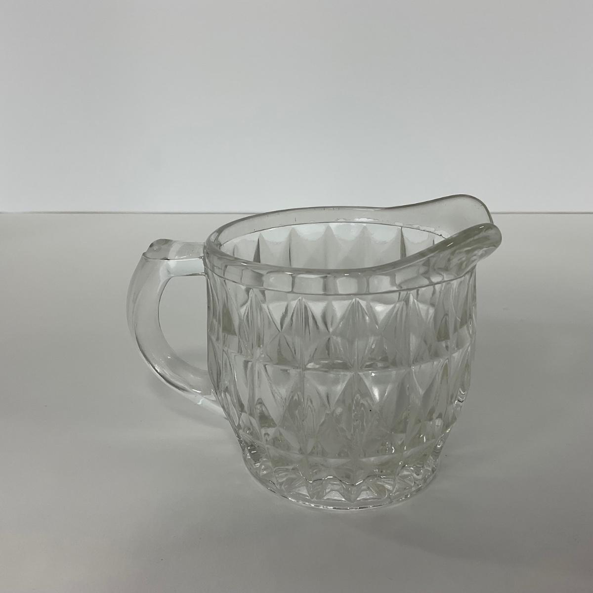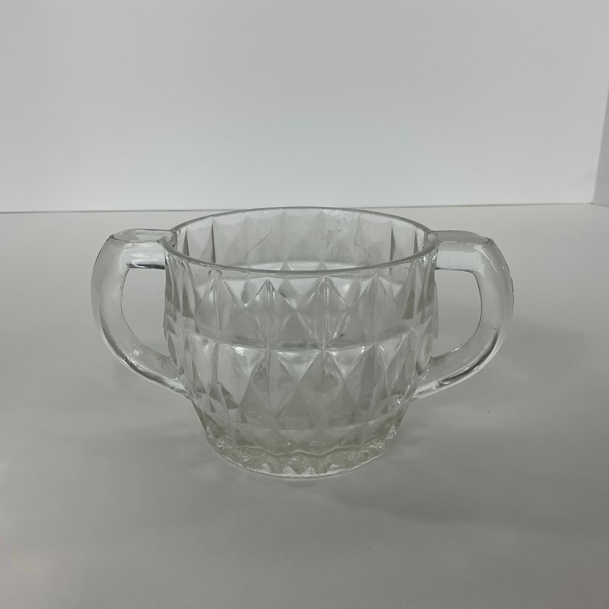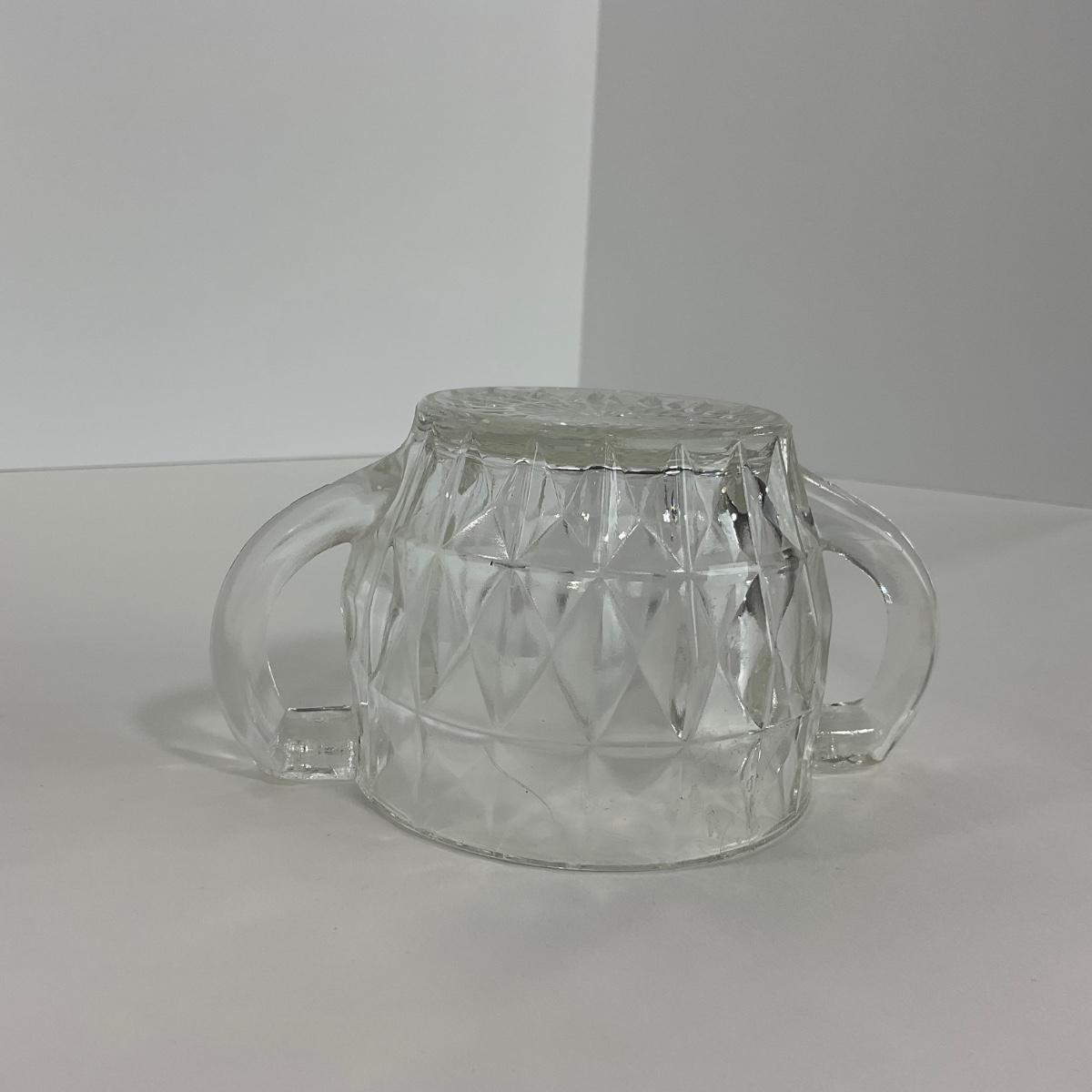 Two clear glass Windsor Diamond Jeanette Glass Co. (1932-1946) pieces including one lidded sugar and one creamer. Please see photos for details and condition. ::: Shipping is available on this lot. If you require shipping you must let us know at the close of the auction. We will coordinate with you after the item has been won. Shipping fees will include insurance up to or exceeding the value of all items being mailed. If you have any questions regarding this lot please contact the auctioneer either via this website, by direct email or by phone. PICK UP TIMES and other important information can be found in the TERMS and DESCRIPTION of the auction. Please take a look for pertinent information. Thanks!