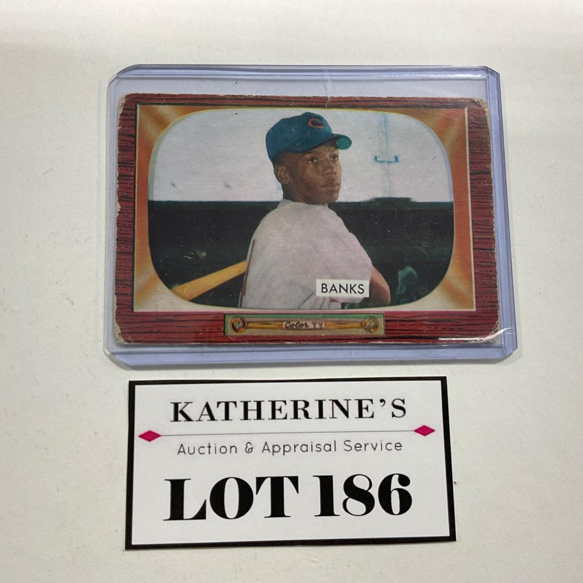 One 1955 Bowman Ernie Banks Original not a reprint card. Please see photos for details and condition. ::: Shipping is available on this lot. If you require shipping you must let us know at the close of the auction. We will coordinate with you after the item has been won. Shipping fees will include insurance up to or exceeding the value of all items being mailed. If you have any questions regarding this lot please contact the auctioneer either via this website, by direct email or by phone. PICK UP TIMES and other important information can be found in the TERMS and DESCRIPTION of the auction. Please take a look for pertinent information. Thanks!