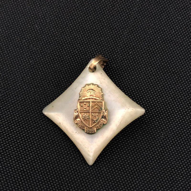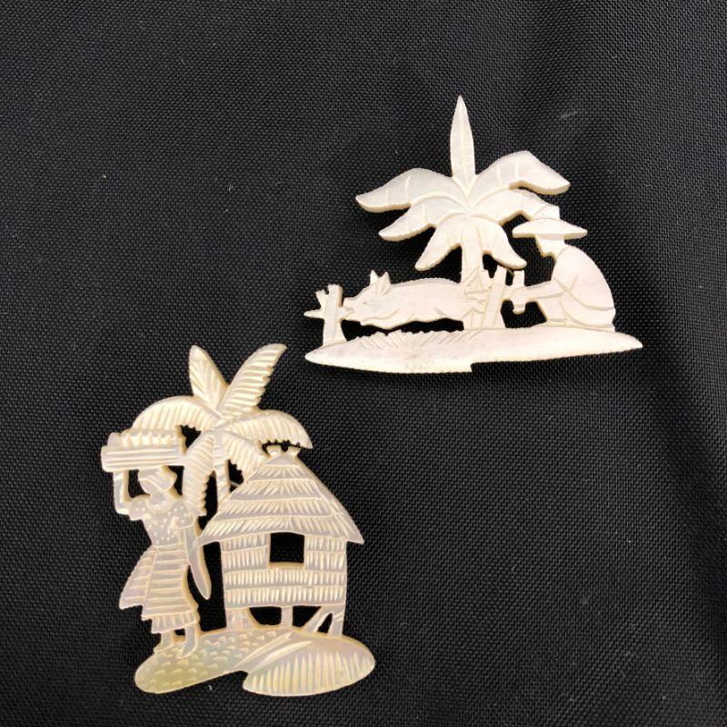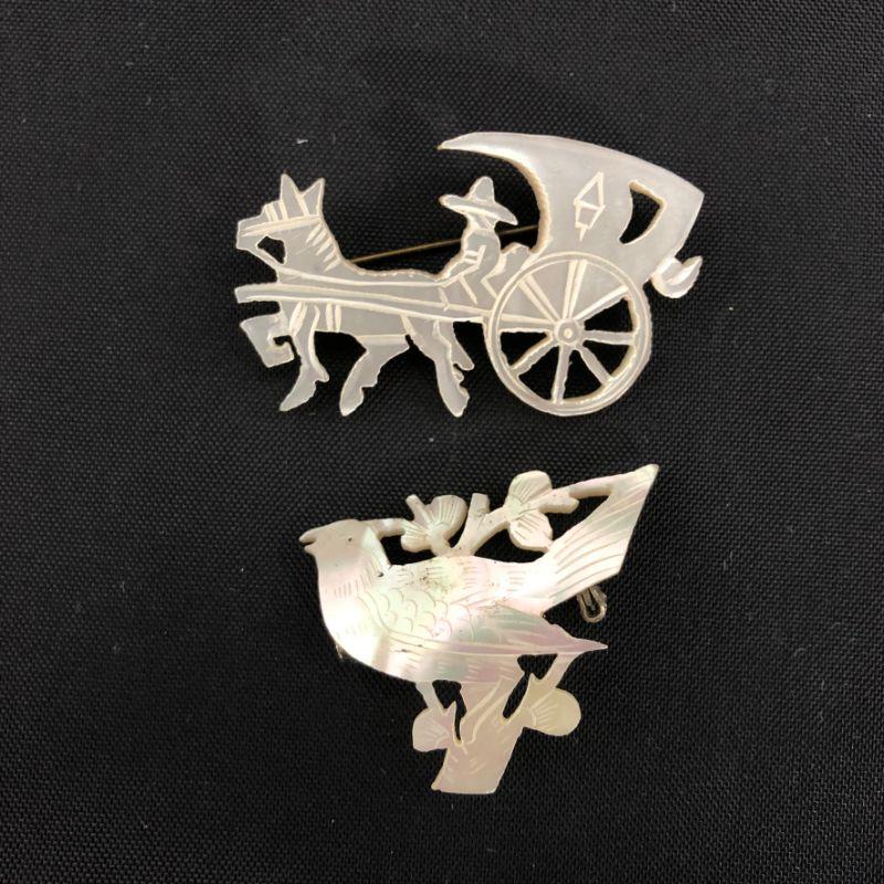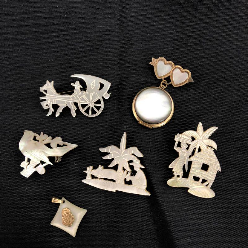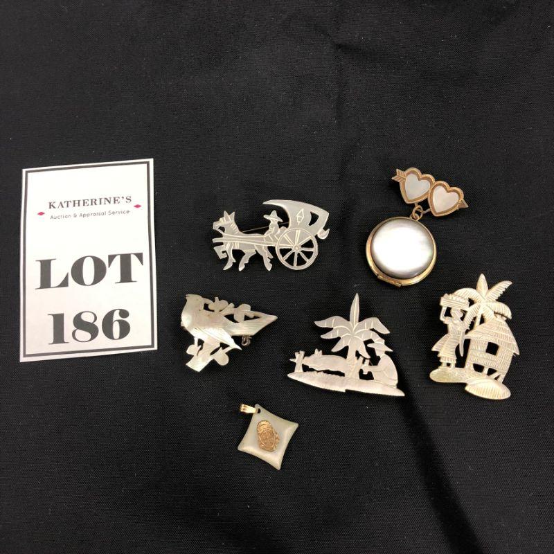 Beautiful Sweetheart Brooch, left empty for your own personalization, Four carved Mother of Pearl figural brooches and sorority pendant.