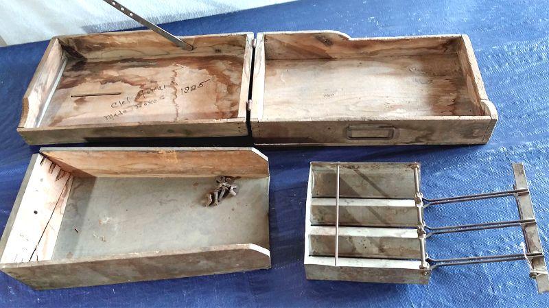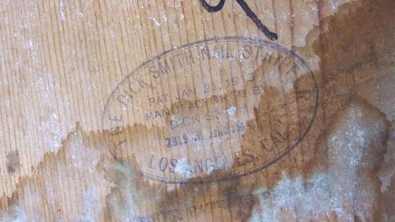 This item is called The Dick Smith Nail Stripper. About the turn of the century, especially in California, the growth of commercial agriculture began to boom. Both fruits and vegetables were packed in wooden crates and lots of crates were needed. Today most of the boxes are cardboard or plastic. There were no nail guns or power staplers in those days as it was all done by hand labor. The crates were assembled and nailed by hand. When nails were purchased, they were furnished in kegs filled with bulk nails. If you've ever tried to use bulk nails, they are slow to pull out of the pile and they will wipe your hands out in short order. In 1913, a man named Dick Smith invented this nail stripper. You dumped a handful of the bulk nails into it, shook it a little and the nails dropped into several slots with the heads all up top. If you lifted the slotted unit up fast enough on its pivot, the nails would drop into two more slots ready to be grabbed and hammered into the crates. This is a simple idea, but when you look at this unit, youâe(tm)ll really appreciate the amount of precision fabrication and soldering that it took to build it. It even has an adjustment for the size of the nails. The entire thing is enclosed in a self-contained folding box that measures 8 by 17 inches. The second part that you see in the photo that looks like an elongated dustpan with a tin bottom, sits under the slots and catches any nails that might escape when youâe(tm)re working fast. When you catch enough nails, you pull the pan out and dump them back into the slots. It also can be used to clean up the nails on the workbench.