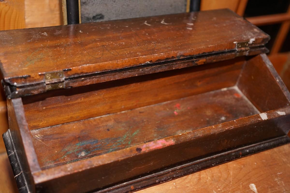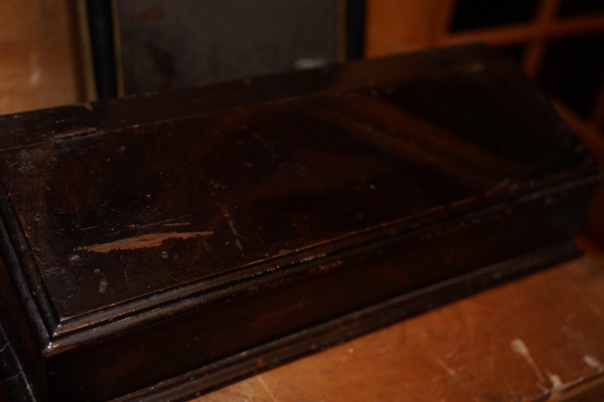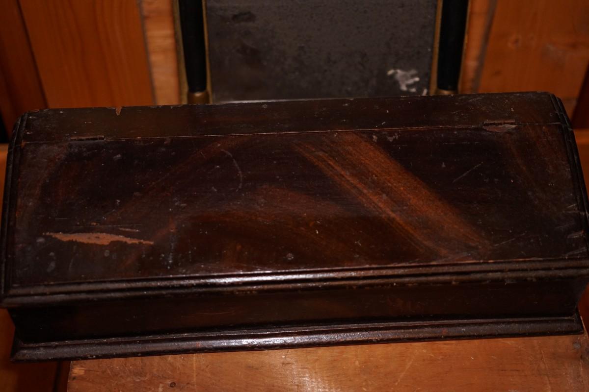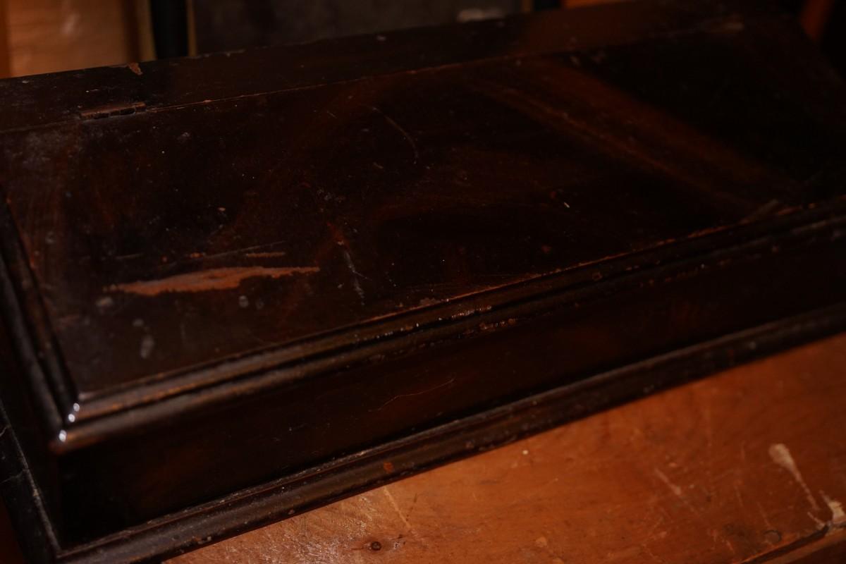 The document box is a grain painted lift top. the box measures: Length of 7 1/2" Height " 5" ( back ) / 3" at the front of the box. and the width 5" good conditon