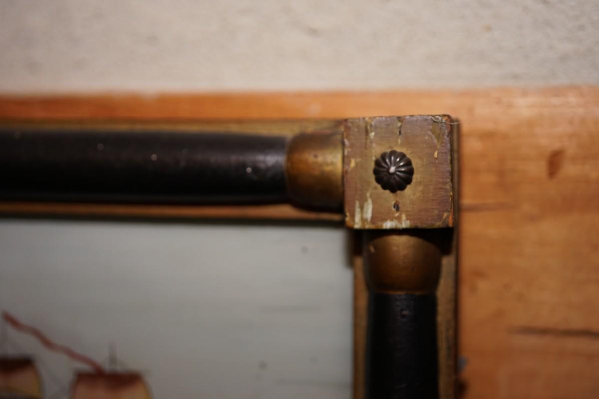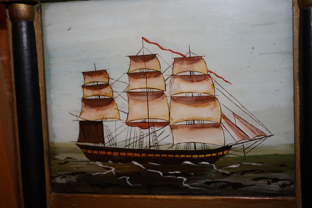 two 19th century antiques. The wall mirror is an original empire style reverse painted mirror with schooner , The mirror is old and the silver has worn off most of it typical with age. The frame is wooden with florettes in the corner.