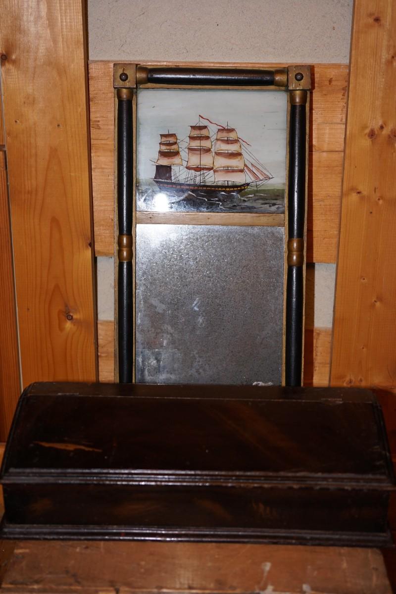 1860'S REVERSE PAINTED MIRROR W/ SCHOONER & GRAIN PAINTED DOCUMENT BOX.