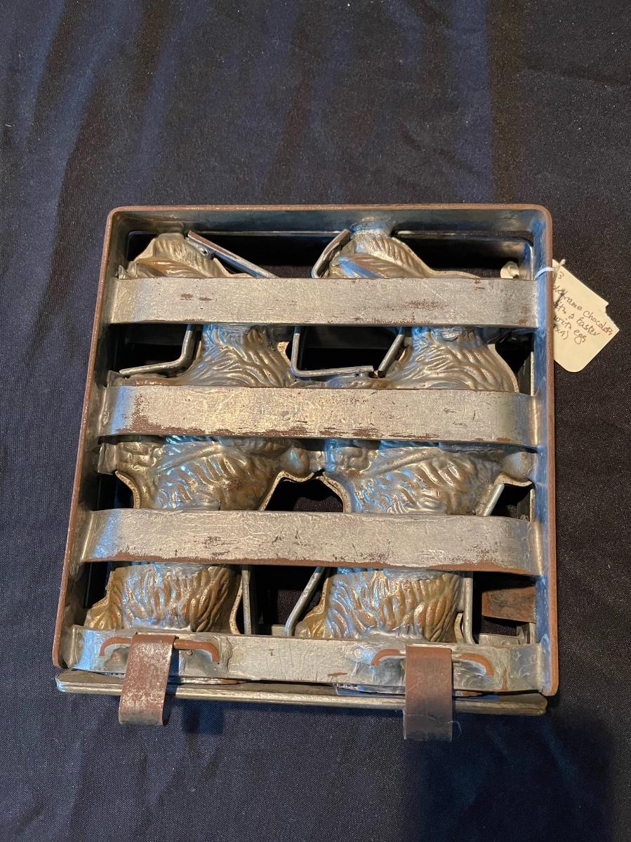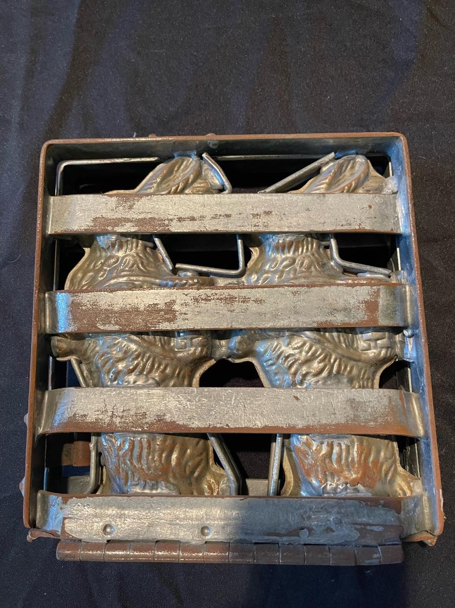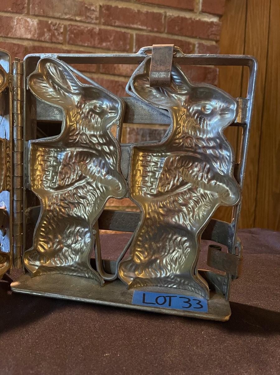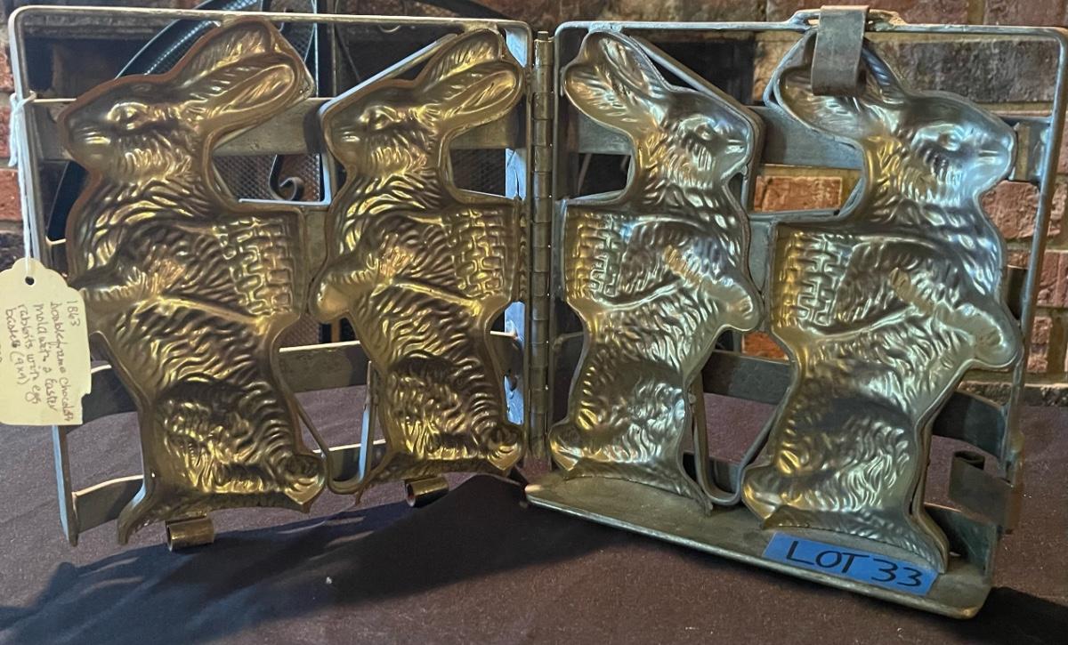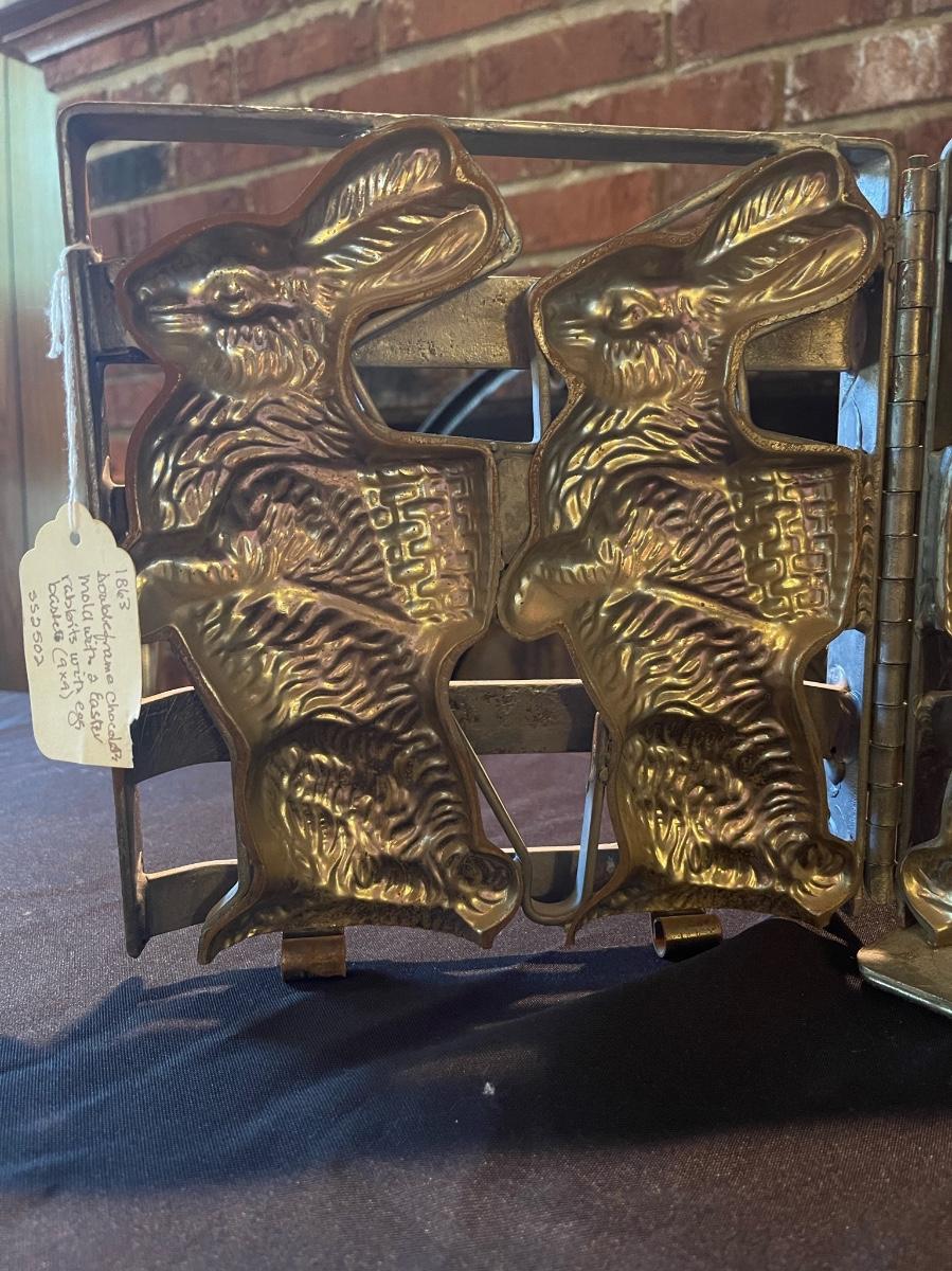 1863 Antique double chocolate mold with Easter Bunnies holding baskets