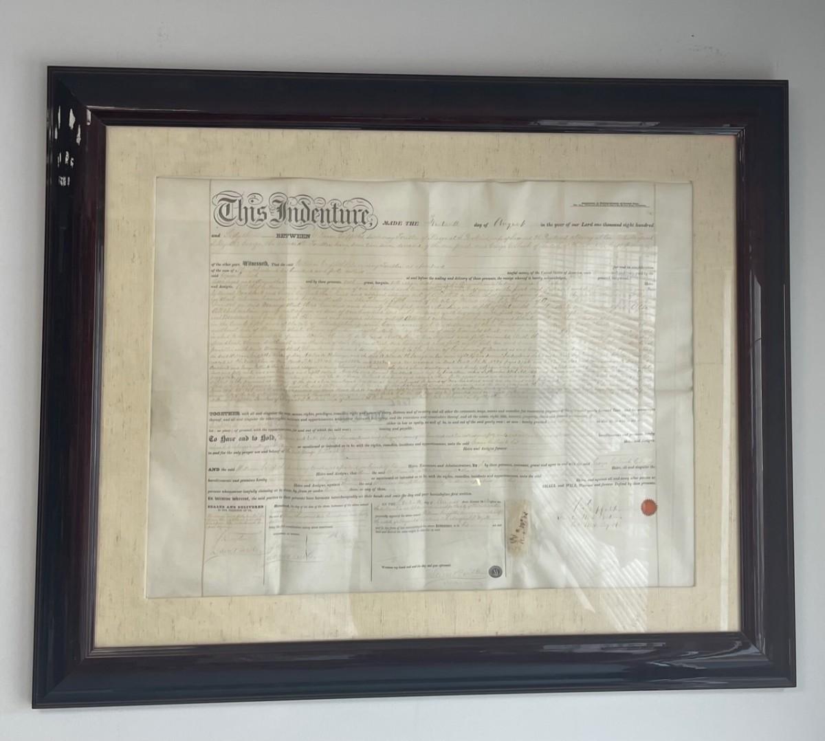 Description: 1863 Civil War Era Indenture / Land saleMeasurement approximate: 32”x27” (framed); 27”x22” (image); Material: Paper