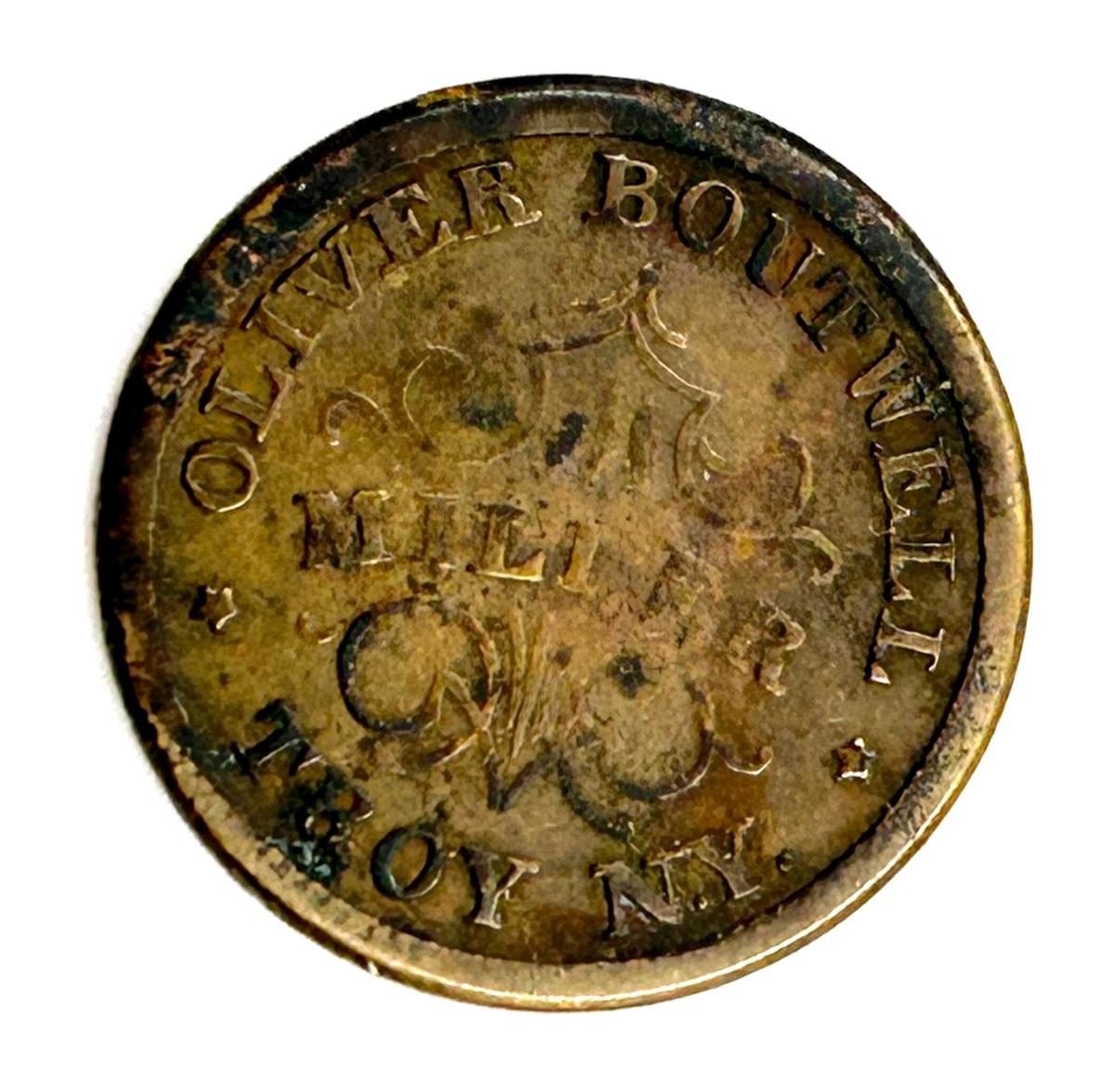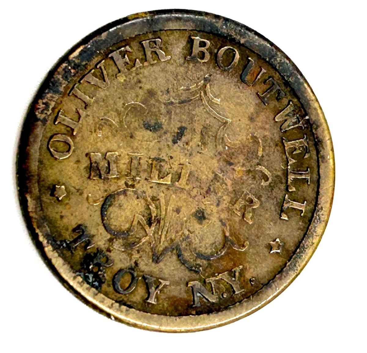 Token says “Redeemed at my Office 1863” on one side andsats “Oliver Boutwell” on the reverse. Very good condition considering.