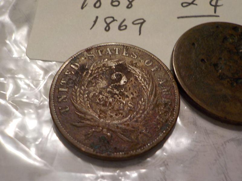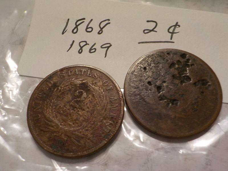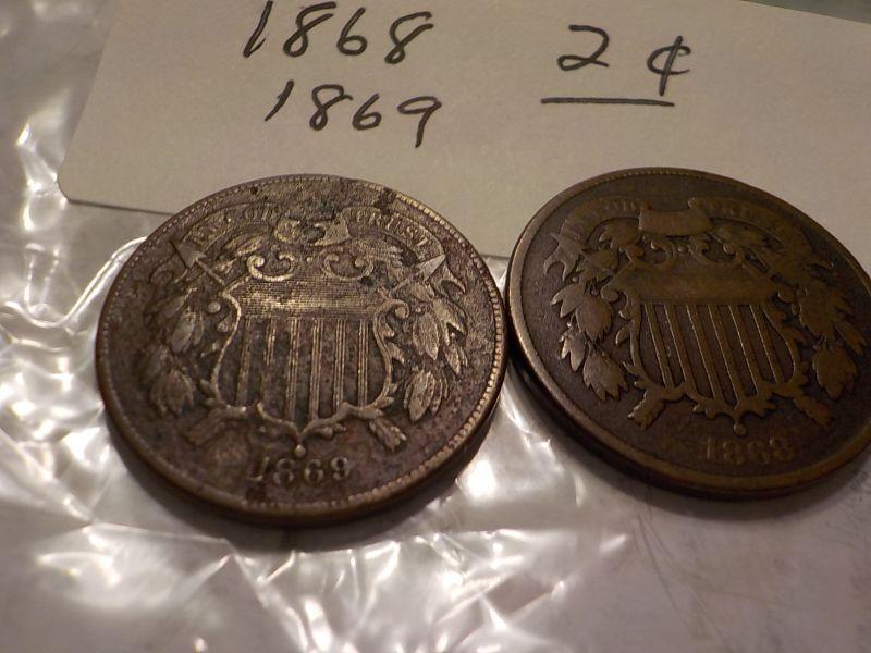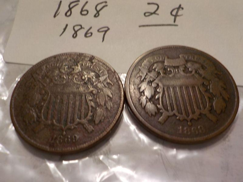 1868 - 2 cent coin and 1869 - 2 cent coin.