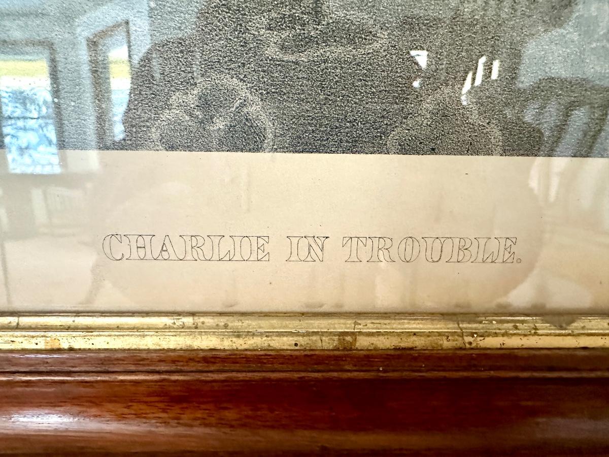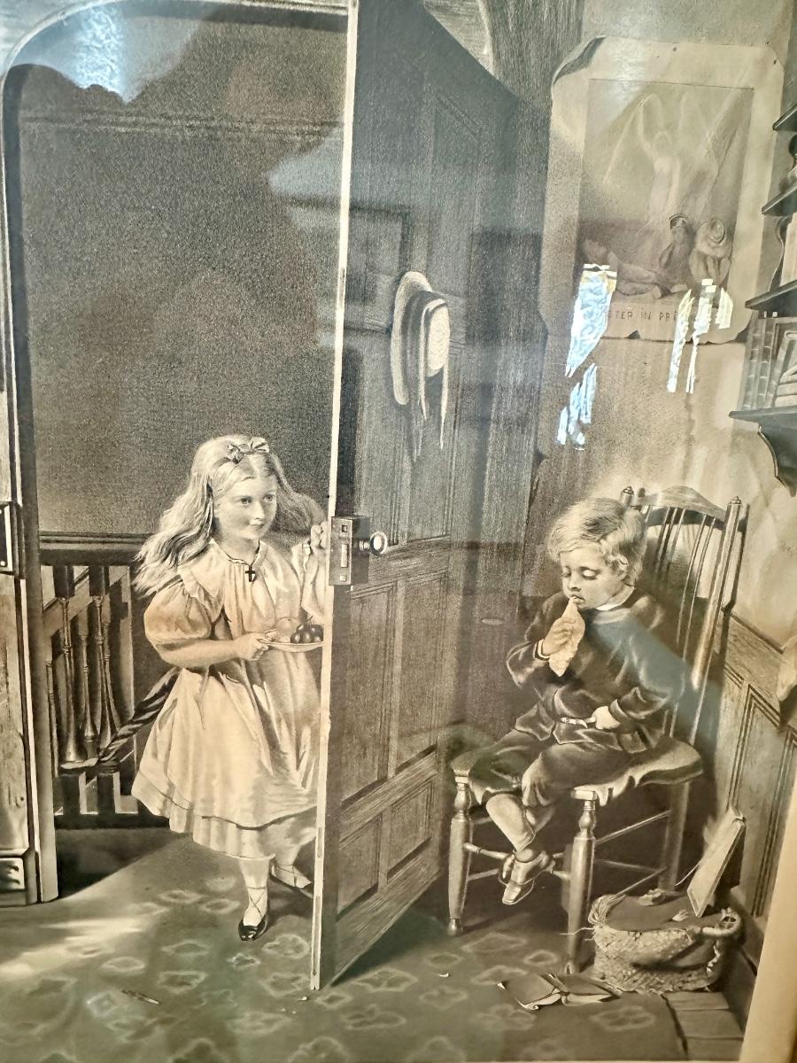 Disgraced Charlie sitting in the corner with a St. Peter in prison print behind him. Little girl coming in with fruit.
