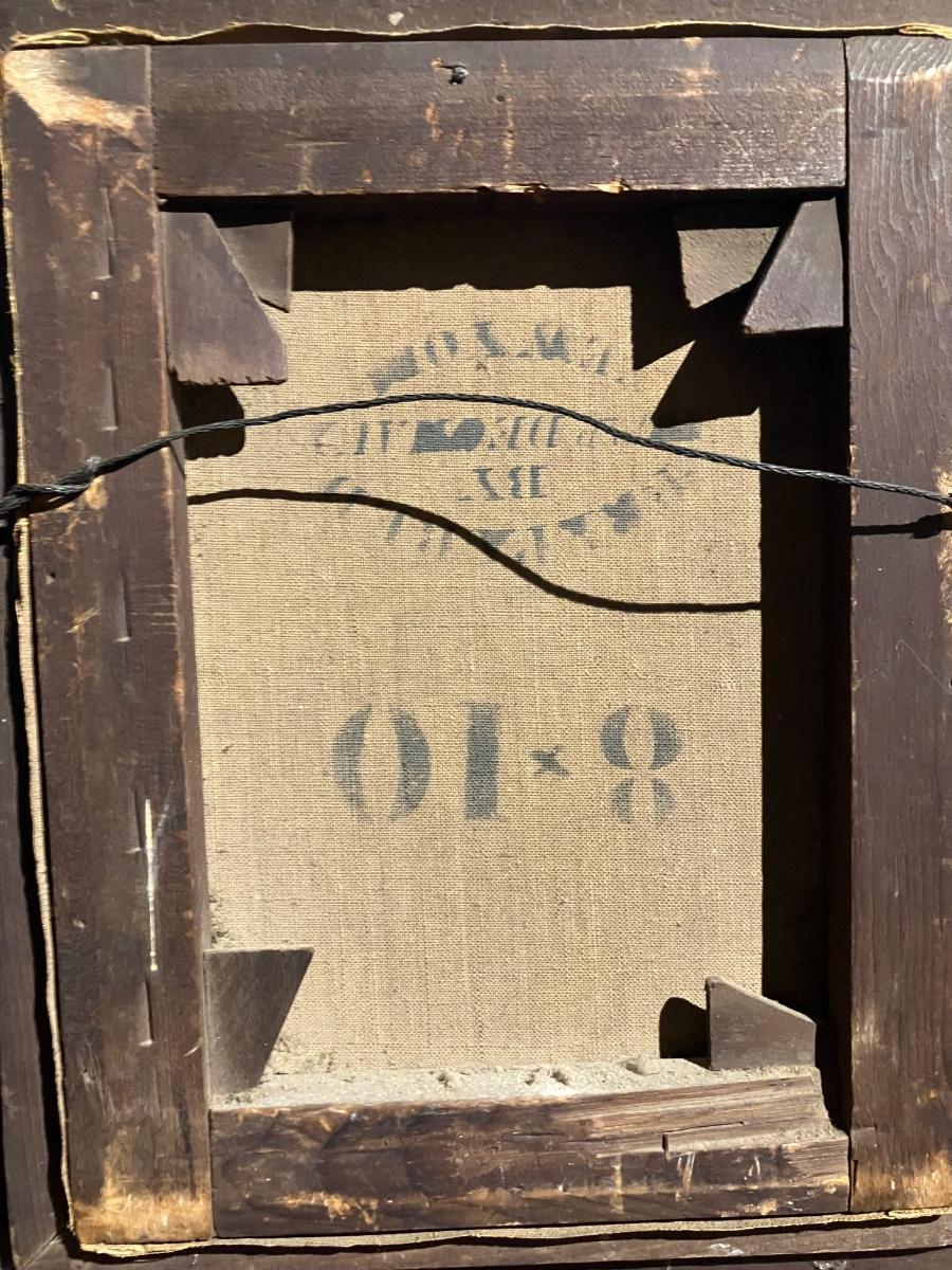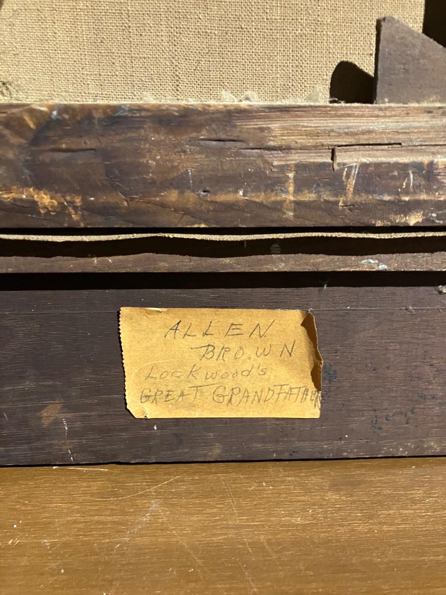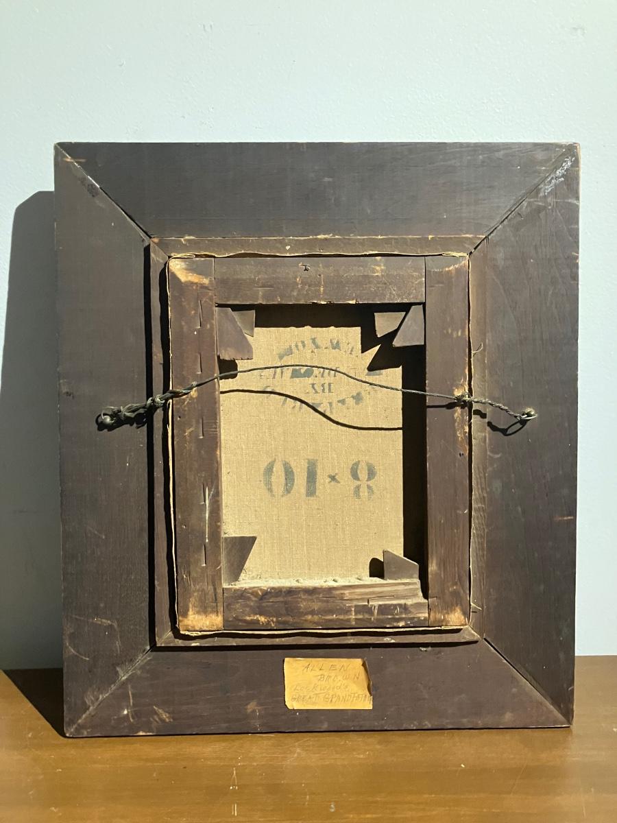 Canvas measures 8" x 10" (sight), overall with original deep molded wood frame: 14" x 16.5". Back of canvas has period 'Prepared by [illegible] New York' stamp, mounted on old stretcher with hand-forged nails and over 100 years of attic dust. Tape label reads 'Alan Brown Lockwood great grandfather' — direct from a rural Pennsylvania estate.