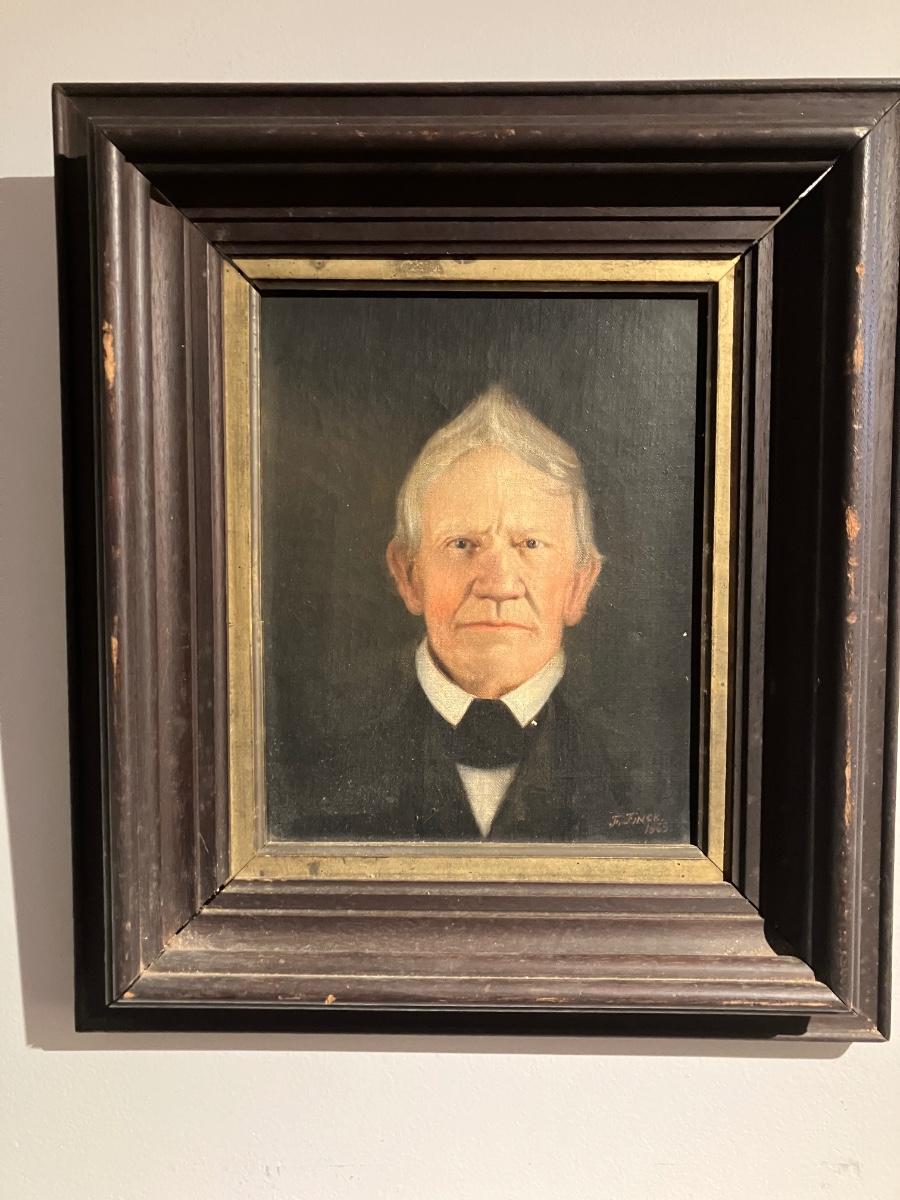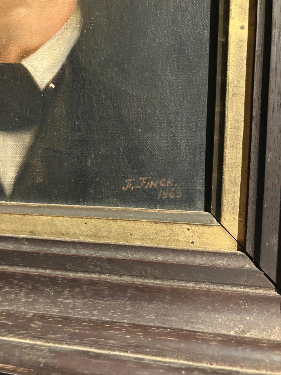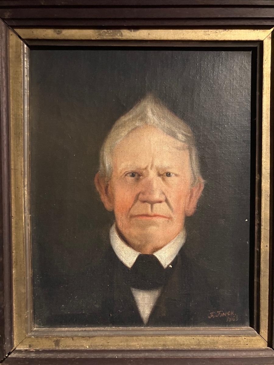 1869 Antique Oil Portrait Painting by F. Finck – Victorian Gentleman Ancestor in Original Frame