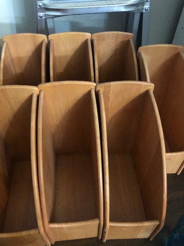 Bundle includes eight heavy duty wood magazine holders extra wide very sturdy. This is an ONSITE Auction all items will need to be picked up on location. Please see auction description for pick up procedures