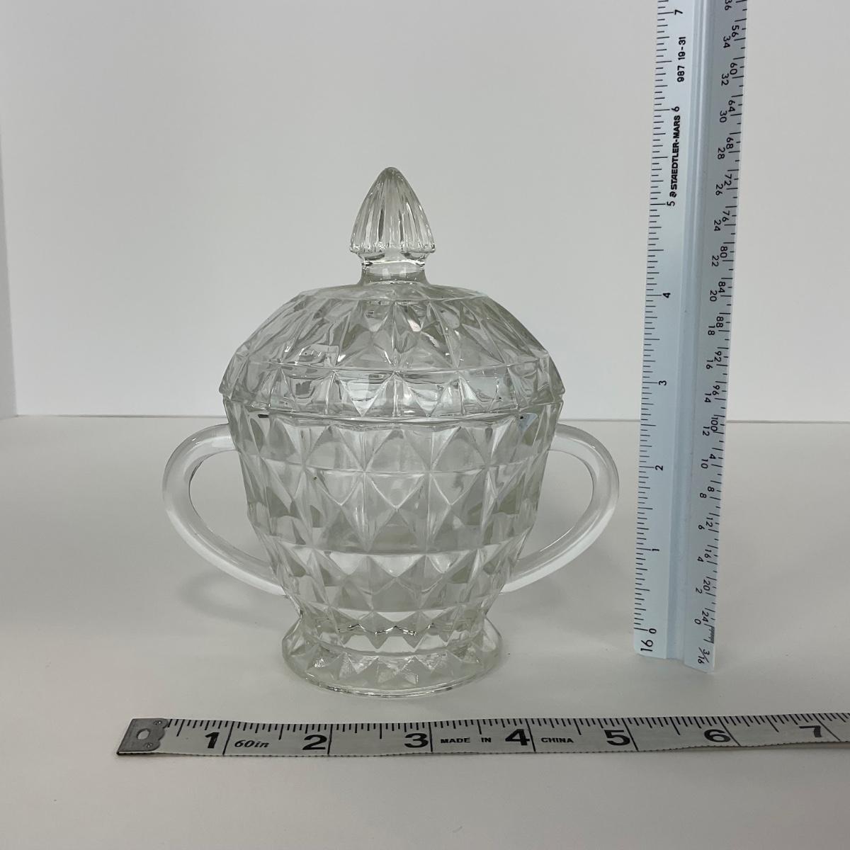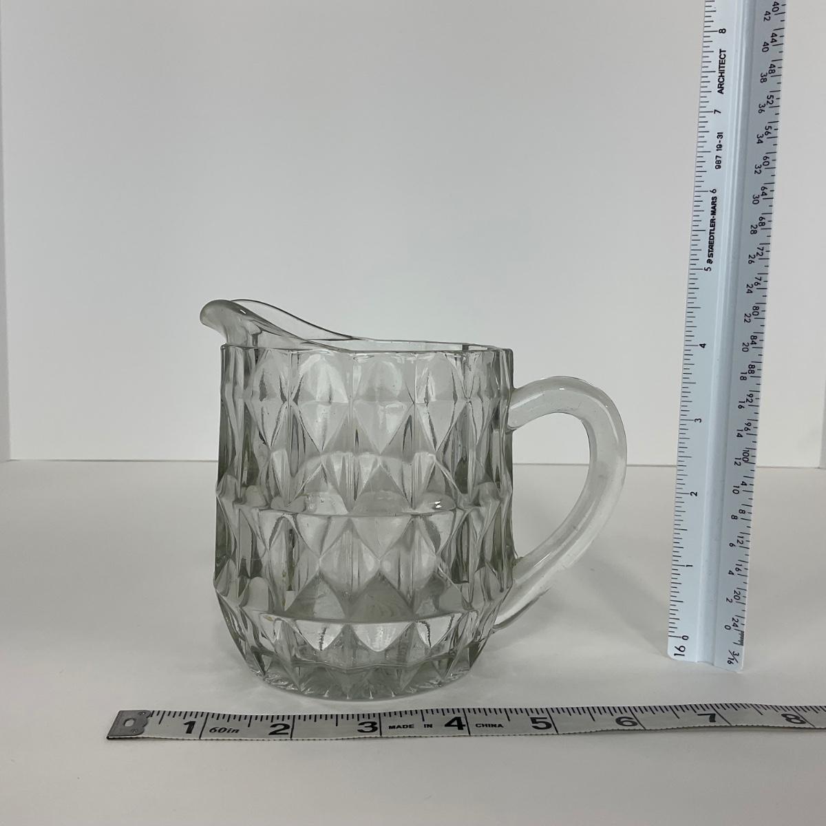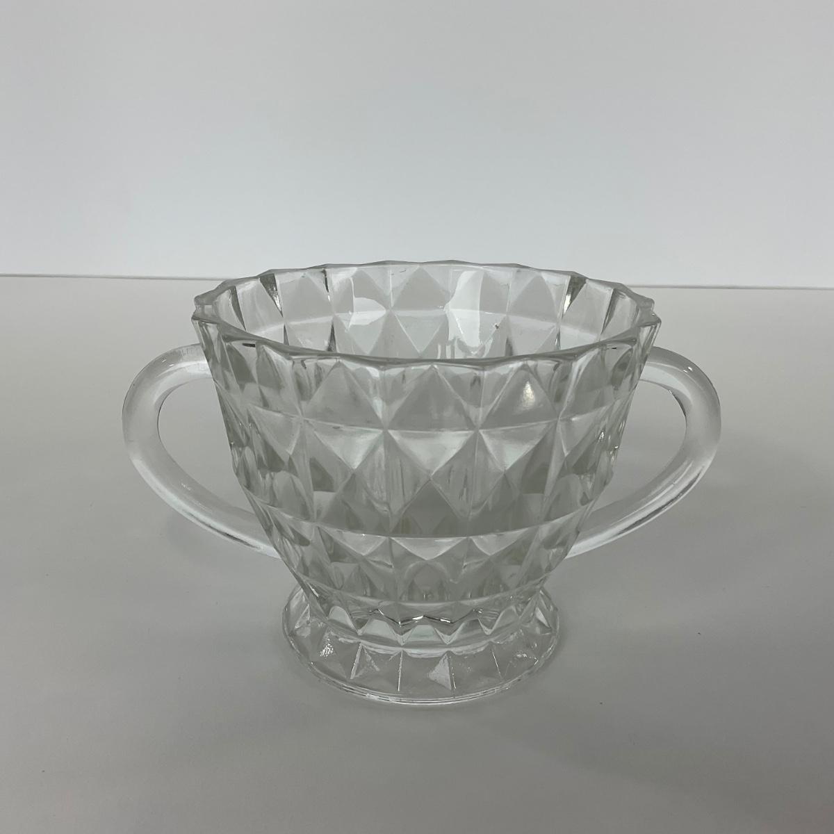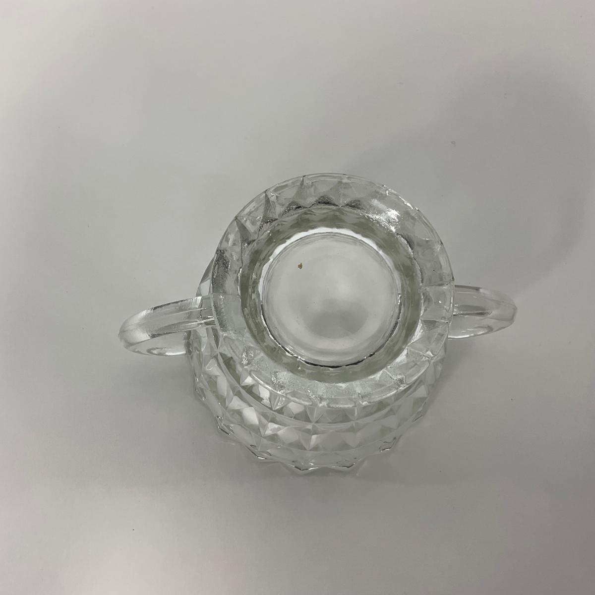 Five pieces of clear glass Windsor Diamond Jeanette Glass Co. (1932-1946) including one creamer, one lidded sugar, and one covered butter dish. Please see photos for details and condition. ::: Shipping is available on this lot. If you require shipping you must let us know at the close of the auction. We will coordinate with you after the item has been won. Shipping fees will include insurance up to or exceeding the value of all items being mailed. If you have any questions regarding this lot please contact the auctioneer either via this website, by direct email or by phone. PICK UP TIMES and other important information can be found in the TERMS and DESCRIPTION of the auction. Please take a look for pertinent information. Thanks!