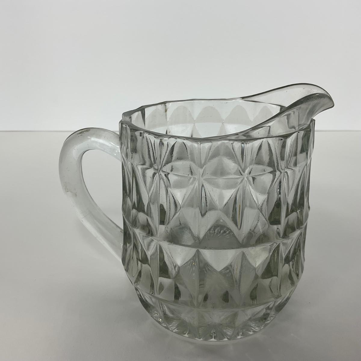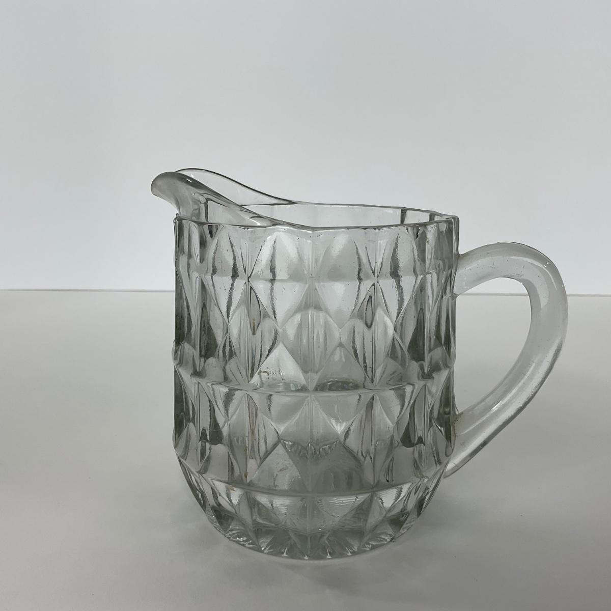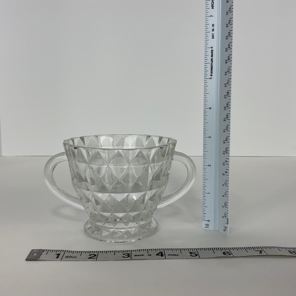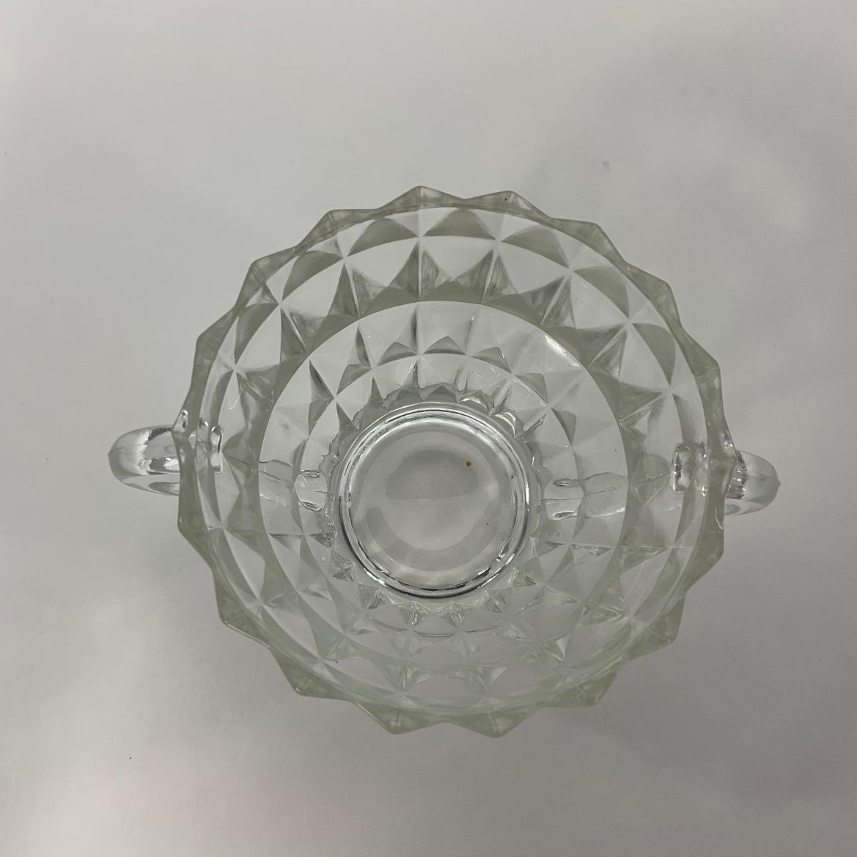 Five pieces of clear glass Windsor Diamond Jeanette Glass Co. (1932-1946) including one creamer, one lidded sugar, and one covered butter dish. Please see photos for details and condition. ::: Shipping is available on this lot. If you require shipping you must let us know at the close of the auction. We will coordinate with you after the item has been won. Shipping fees will include insurance up to or exceeding the value of all items being mailed. If you have any questions regarding this lot please contact the auctioneer either via this website, by direct email or by phone. PICK UP TIMES and other important information can be found in the TERMS and DESCRIPTION of the auction. Please take a look for pertinent information. Thanks!