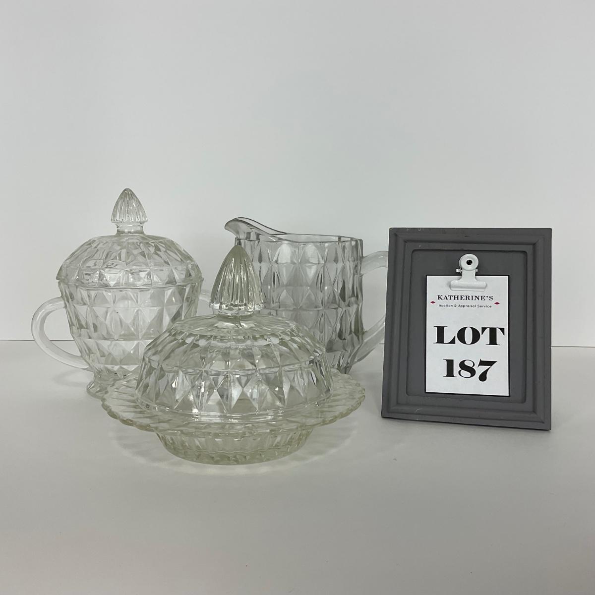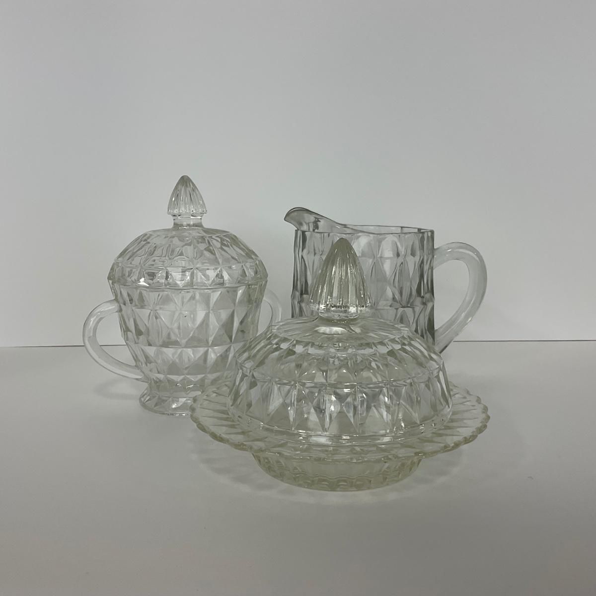 -187- GLASSWARE | Windsor Diamond Jeanette Glass Co. | Creamer, Sugar, & Butter Dish