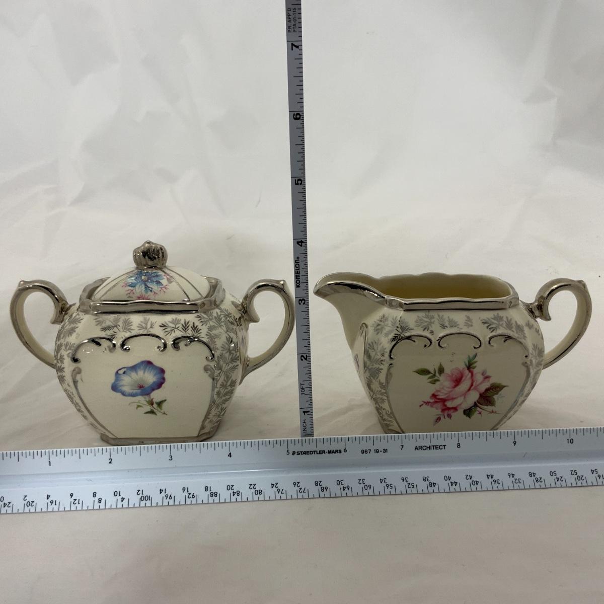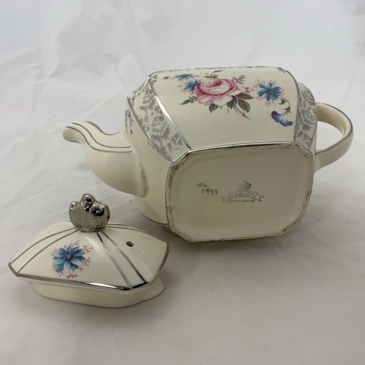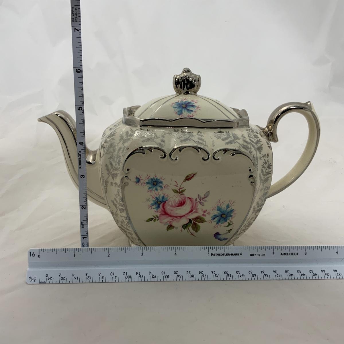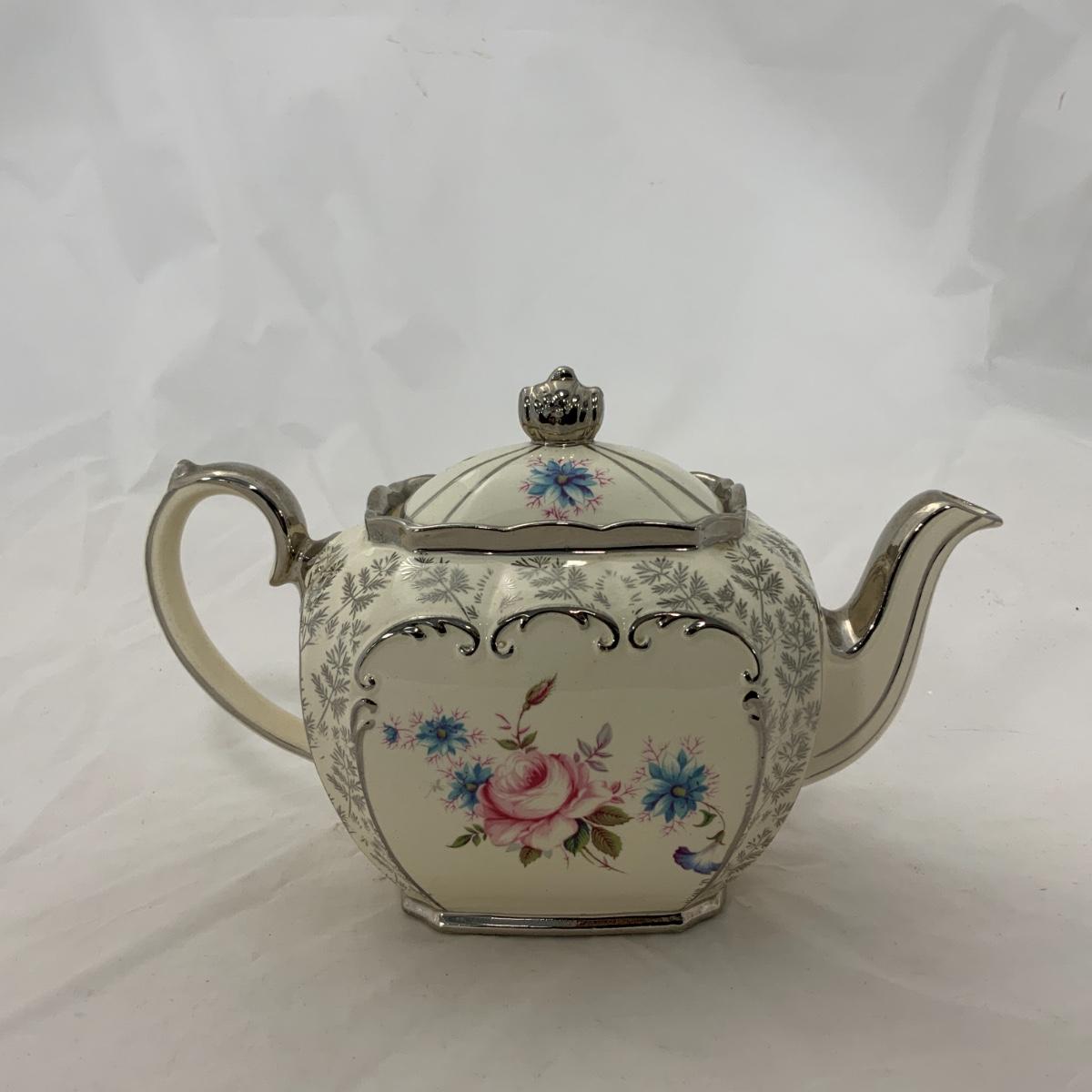 From the Estate of Peter and Alice Radovanovich: Elegant Three Piece Tea Set from Sadler of England. Nice floral design with silver accent. All in good vintage condition. Please see photos for details and condition. ::: Shipping is available on this lot. If you require shipping you must let us know at the close of the auction. We will coordinate with you after the item has been won. Shipping fees will include insurance up to or exceeding the value of all items being mailed. If you have any questions regarding this lot please contact the auctioneer either via this website, by direct email or by phone. PICK UP TIMES and other important information can be found in the TERMS and DESCRIPTION of the auction. Please take a look for pertinent information. Thanks!