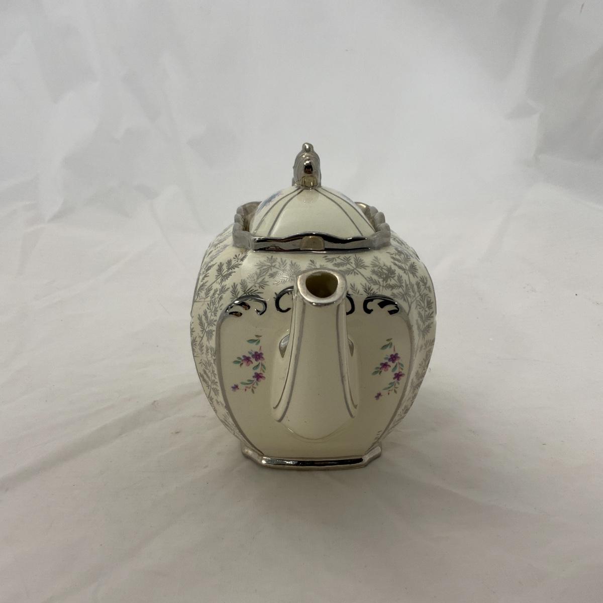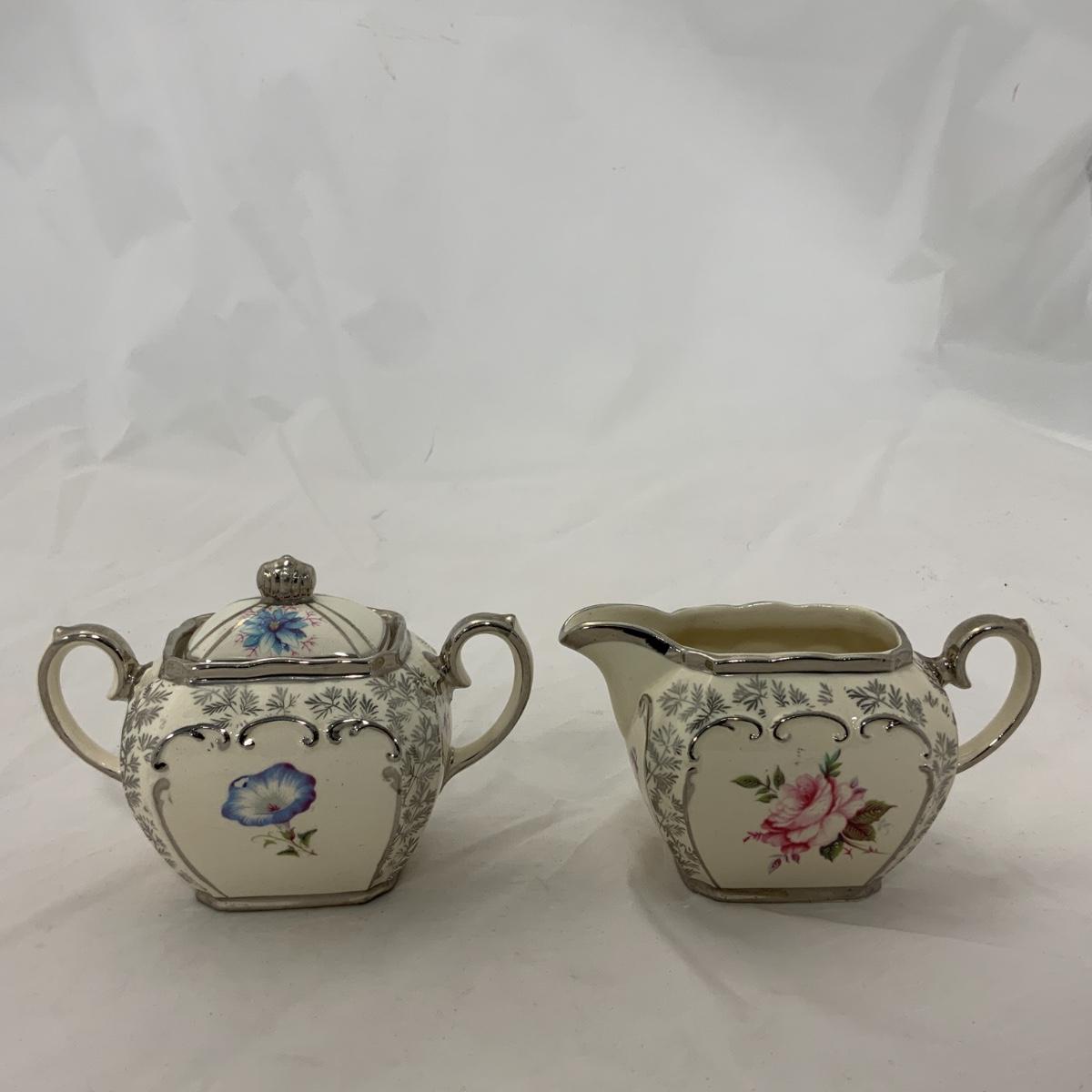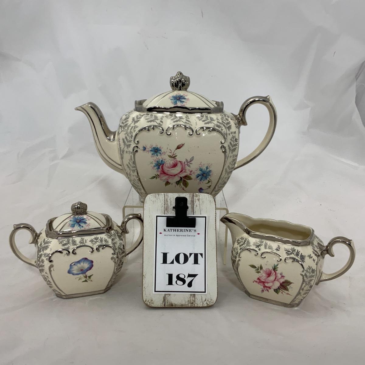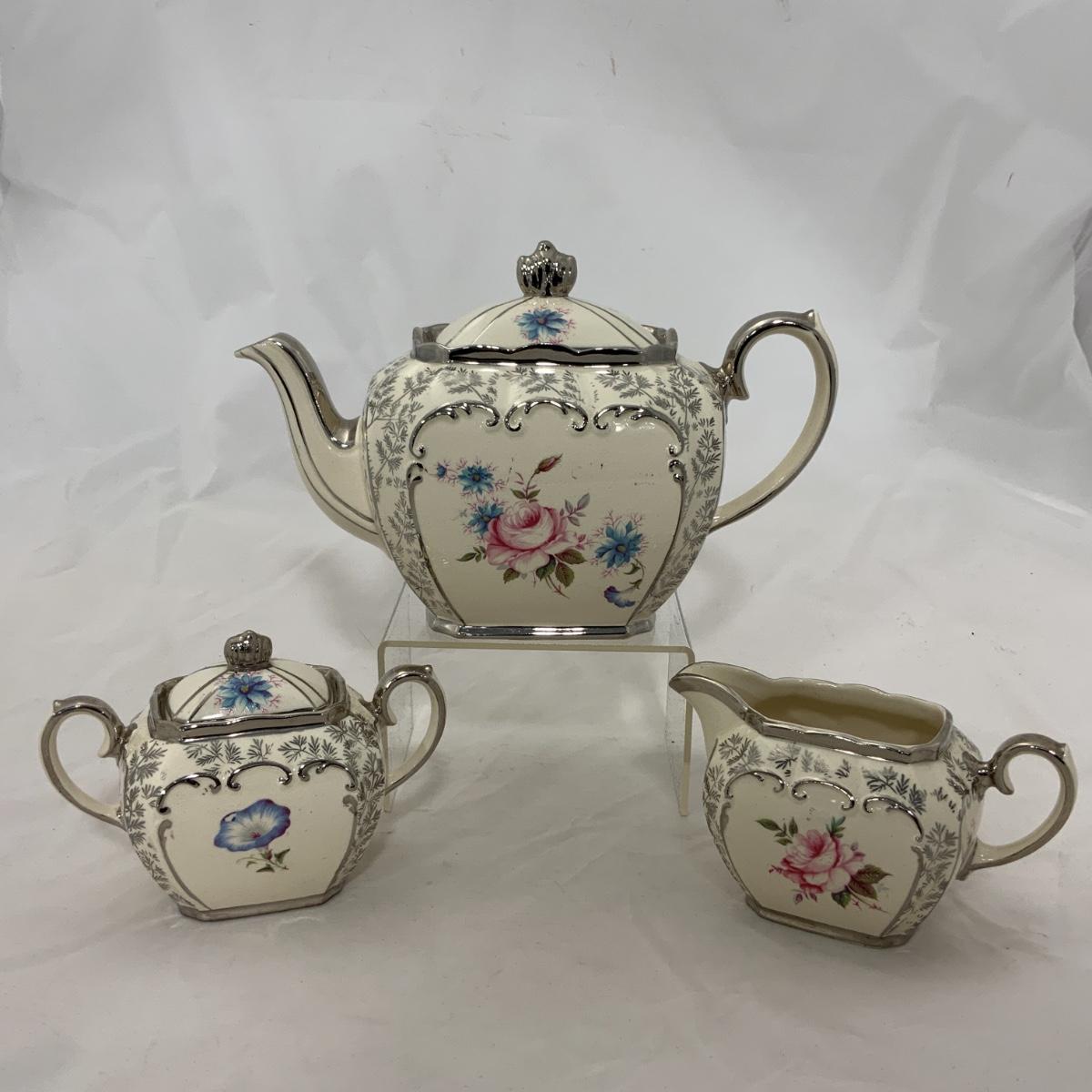From the Estate of Peter and Alice Radovanovich: Elegant Three Piece Tea Set from Sadler of England. Nice floral design with silver accent. All in good vintage condition. Please see photos for details and condition. ::: Shipping is available on this lot. If you require shipping you must let us know at the close of the auction. We will coordinate with you after the item has been won. Shipping fees will include insurance up to or exceeding the value of all items being mailed. If you have any questions regarding this lot please contact the auctioneer either via this website, by direct email or by phone. PICK UP TIMES and other important information can be found in the TERMS and DESCRIPTION of the auction. Please take a look for pertinent information. Thanks!