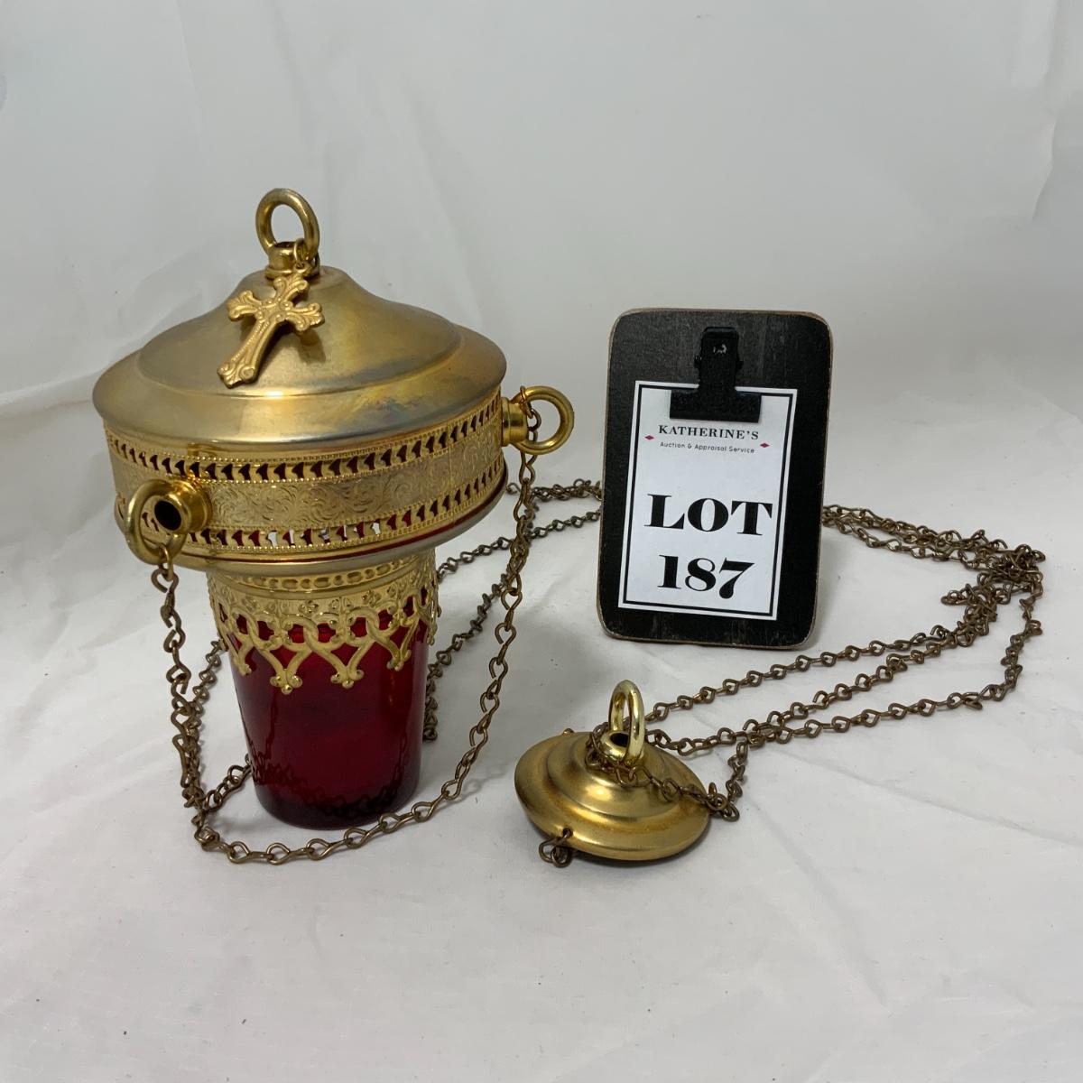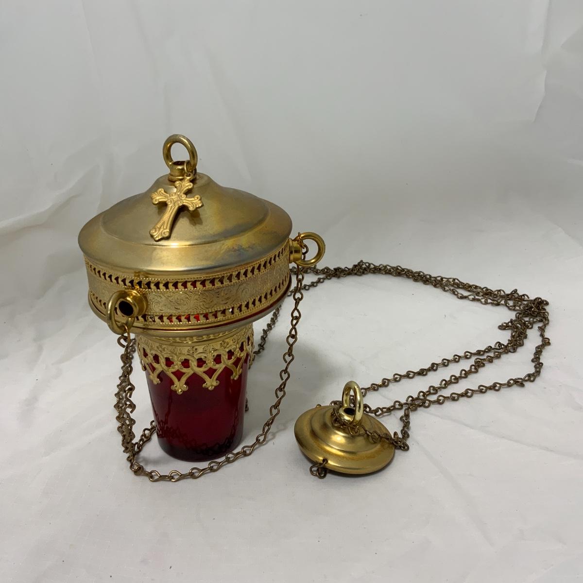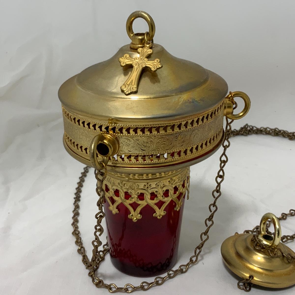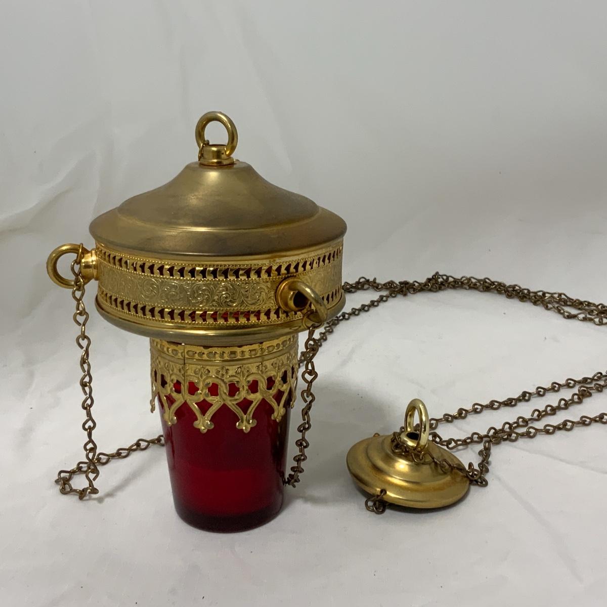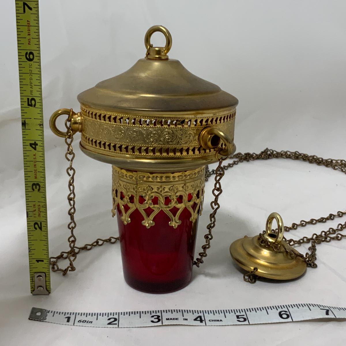 From the Estate of Peter Radovanovich: Beautiful and ornate Sanctuary Lamp to hang in your home. Holds a votive candle and is protected by the cover to burn brightly and illuminate the idols that you have hanging in your home. Please see photos for details and condition. ::: Shipping is available on this lot. If you require shipping you must let us know at the close of the auction. We will coordinate with you after the item has been won. Shipping fees will include insurance up to or exceeding the value of all items being mailed. If you have any questions regarding this lot please contact the auctioneer either via this website, by direct email or by phone. PICK UP TIMES and other important information can be found in the TERMS and DESCRIPTION of the auction. Please take a look for pertinent information. Thanks!