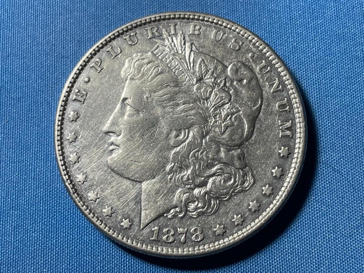 1878-P 8-TF VF CONDITION BRUSHED MORGAN SILVER DOLLAR AS PICTURED. $5 DOMESTIC SHIPPING.