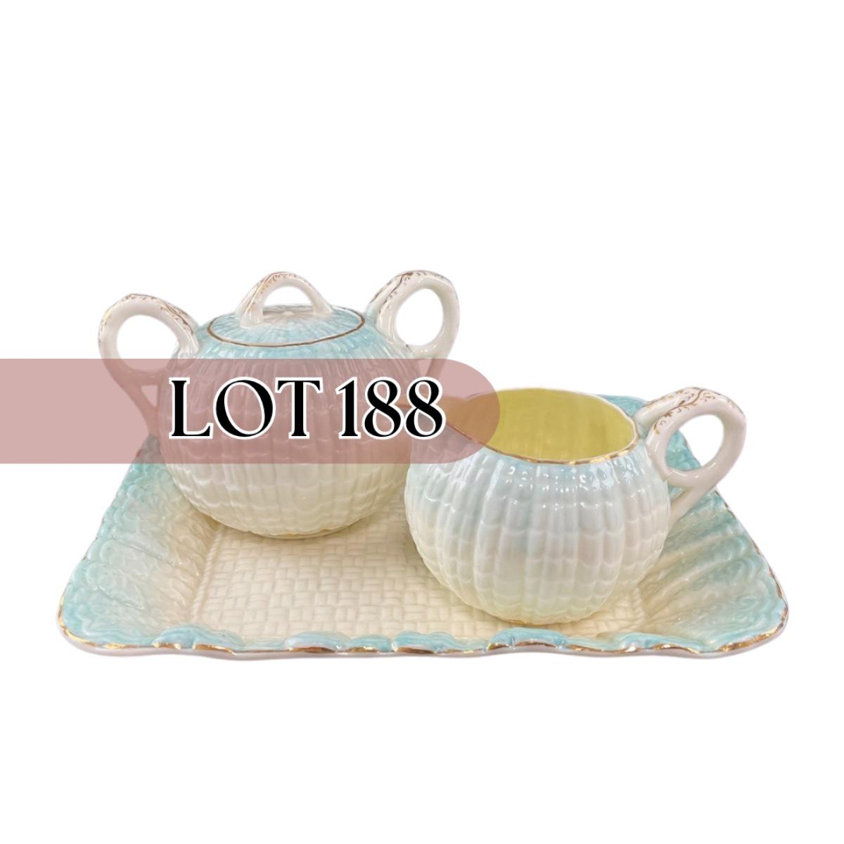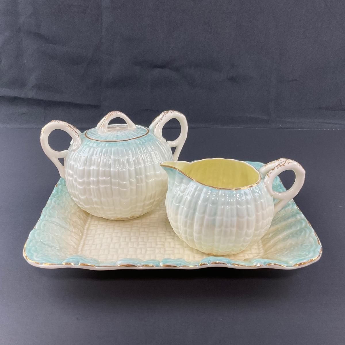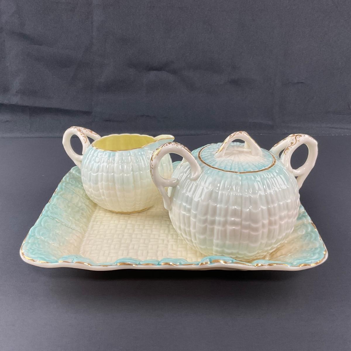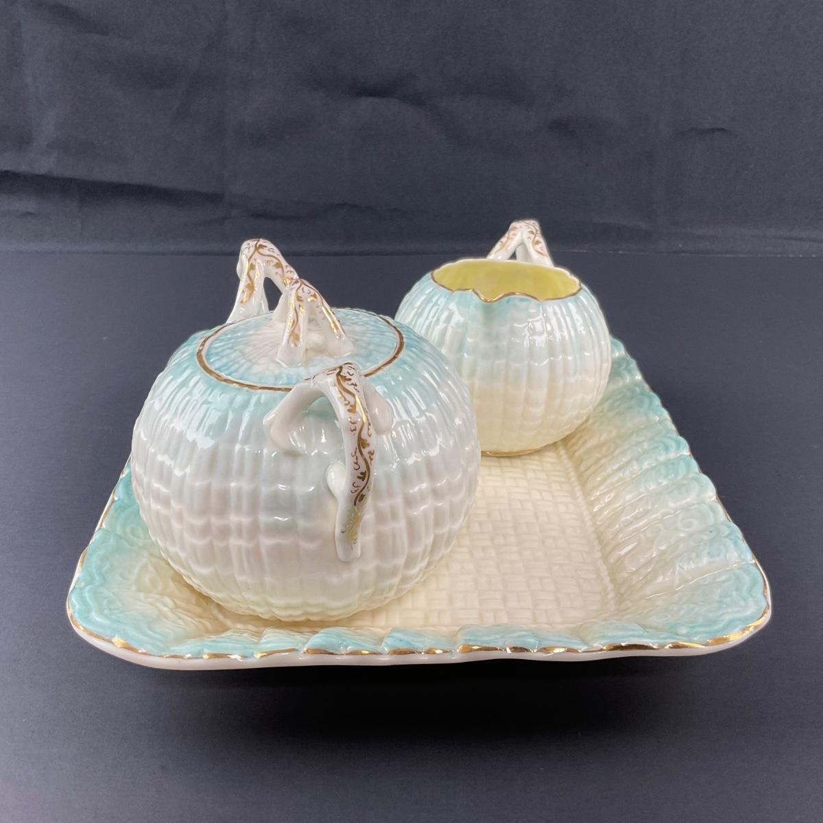 -188- BELLEEK | Blue Neptune Tray, Creamer, & Covered Sugar | Marked