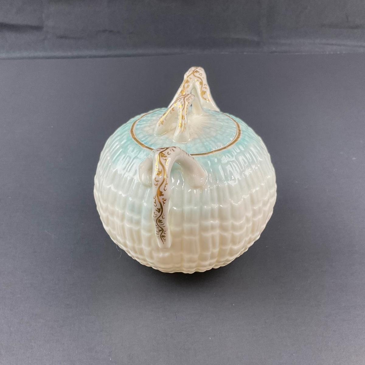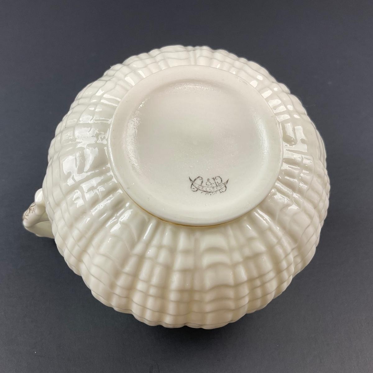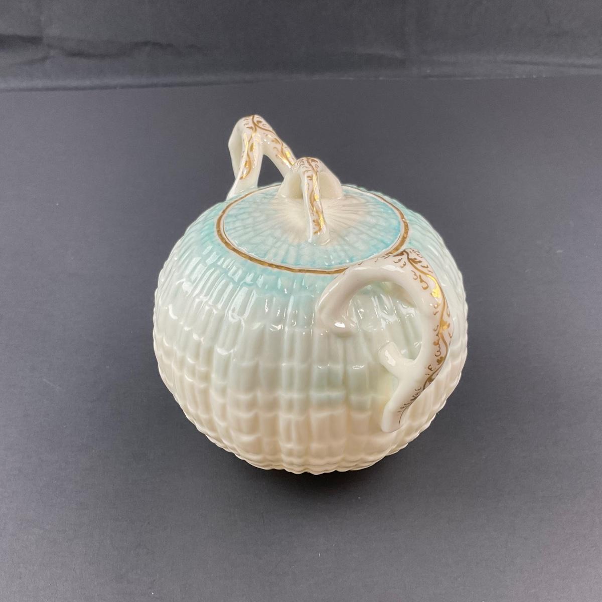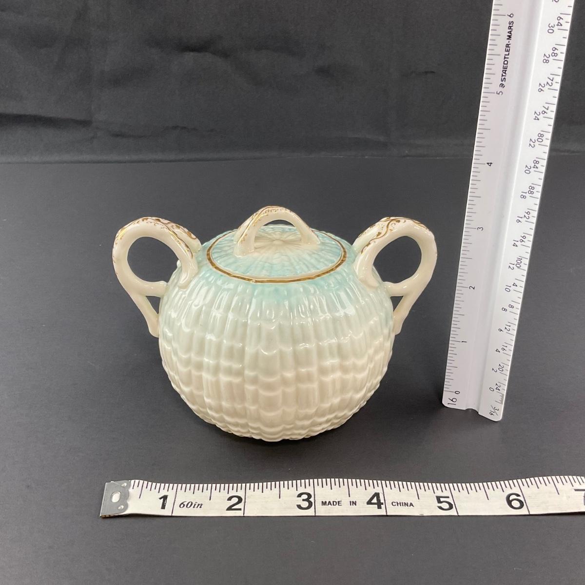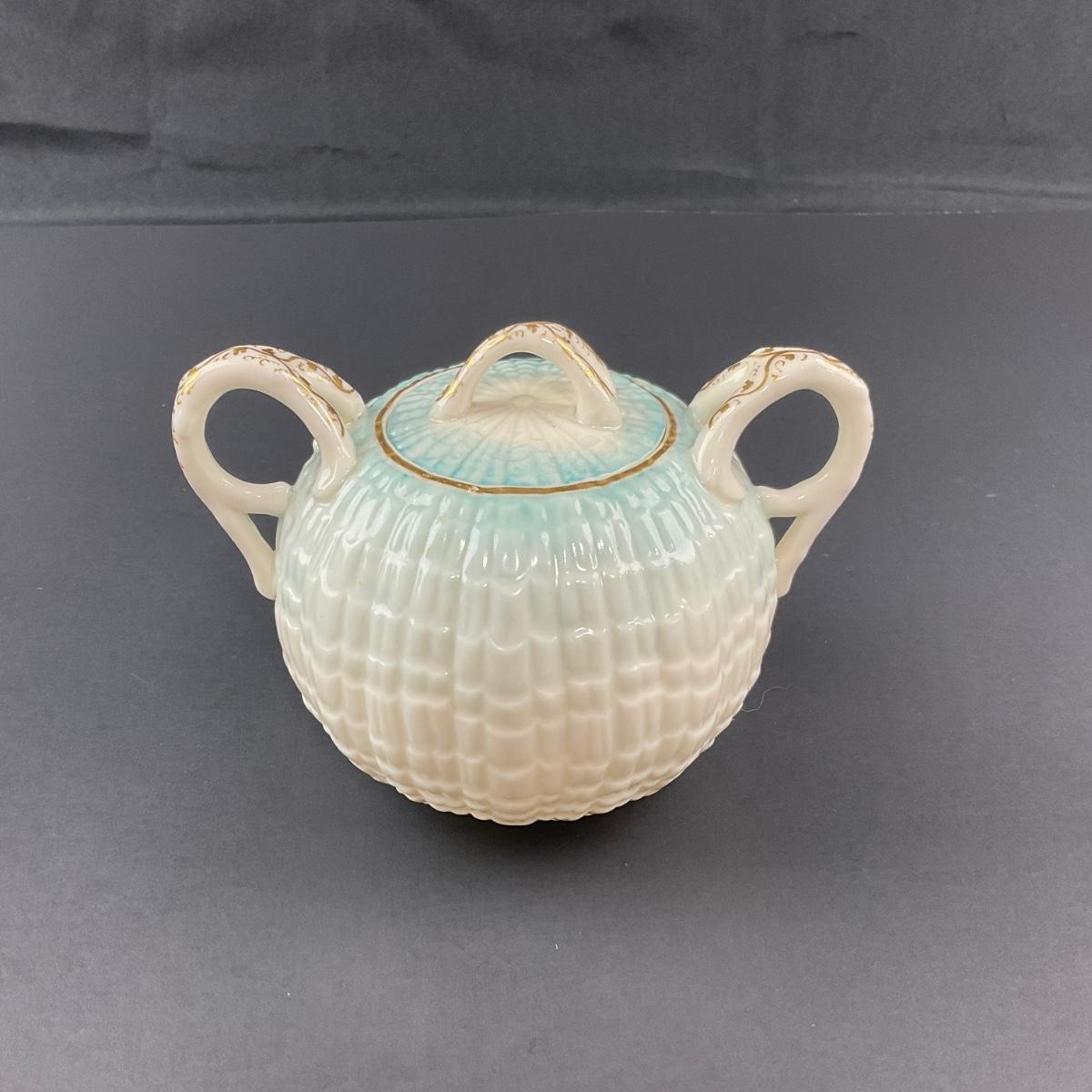 Four pieces total of what is believed to be Blue Neptune Belleek. The covered sugar and creamer have older 1890’s makers marks and the tray has a newer Belleek 6th mark. All pieces have no damage, and appear to be in great shape with no visable chips, cracks, or broken pieces. Please see photos for details and condition. Any condition statement is given as a courtesy to a client, is an opinion, and should not be treated as a statement of fact. Reference to condition written, oral or within a condition report shall not be regarded as a full account of condition and may not include all defects, alterations, or restorations. Absence of a condition report does not imply a lot is flawless or lacking imperfections or damage. Katherine’s Auction & Appraisal Service shall have no responsibility for any error or omission. Returns shall not be accepted on the basis of condition. ::: Shipping is available on this lot. If you require shipping you must let us know at the close of the auction. We will coordinate with you after the item has been won. Shipping fees will include insurance up to or exceeding the value of all items being mailed. If you have any questions regarding this lot please contact the auctioneer either via this website, by direct email or by phone. PICK UP TIMES and other important information can be found in the TERMS and DESCRIPTION of the auction. Please take a look for pertinent information. Thanks!