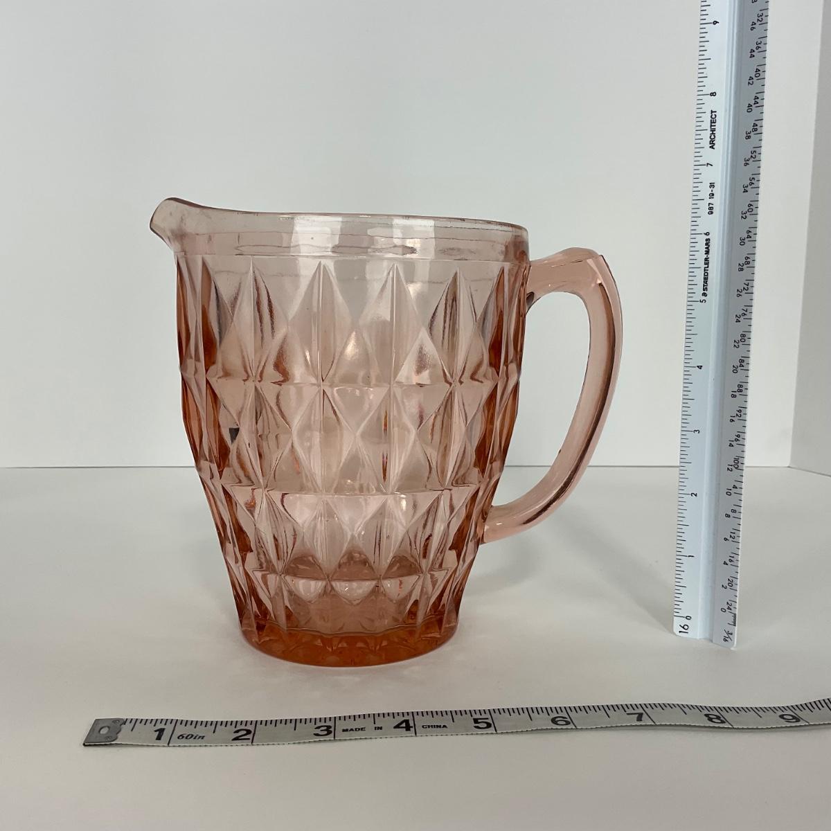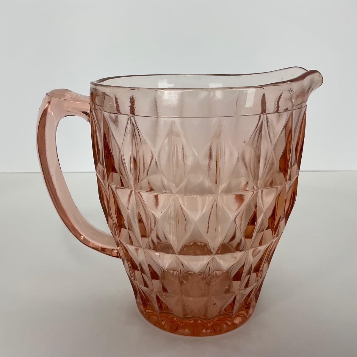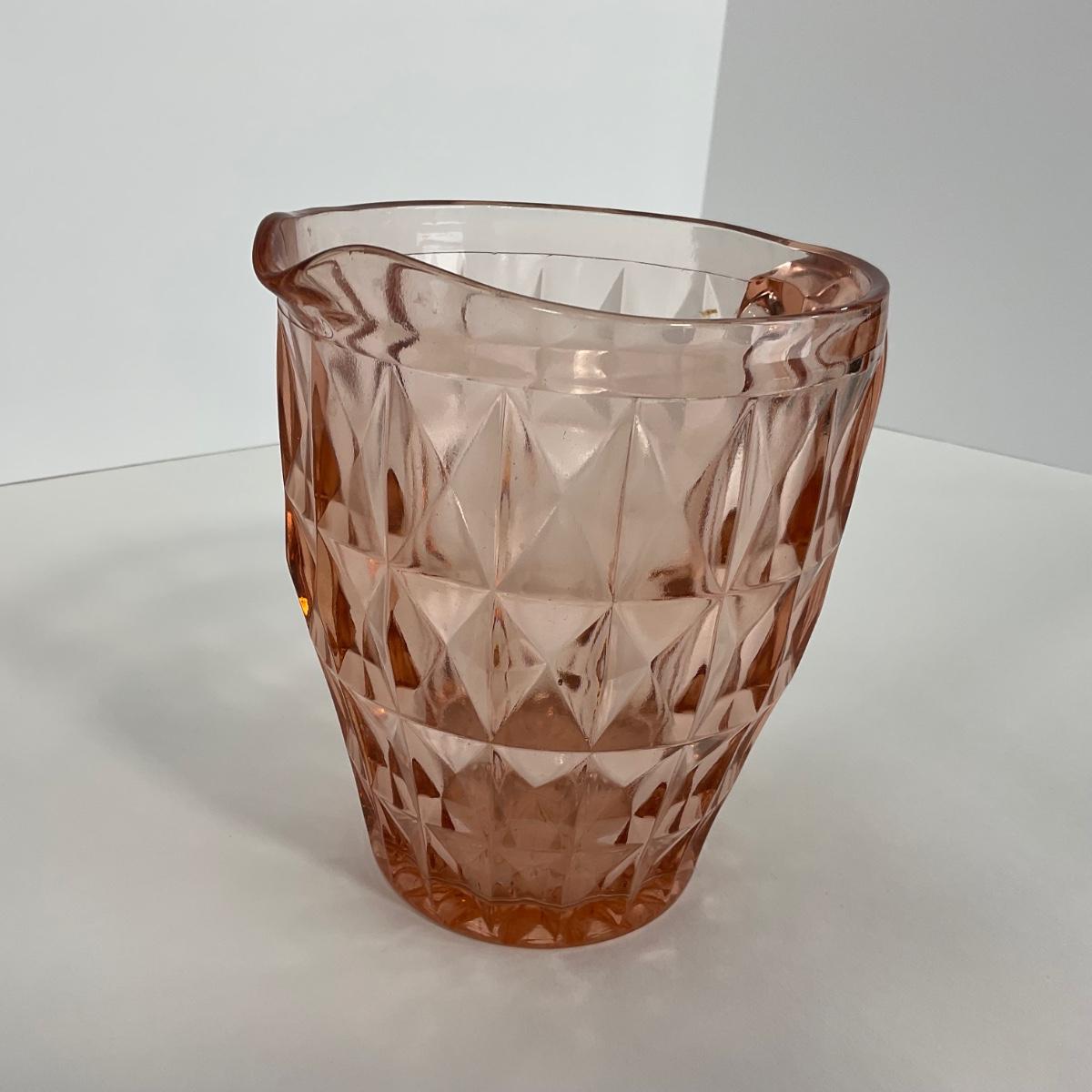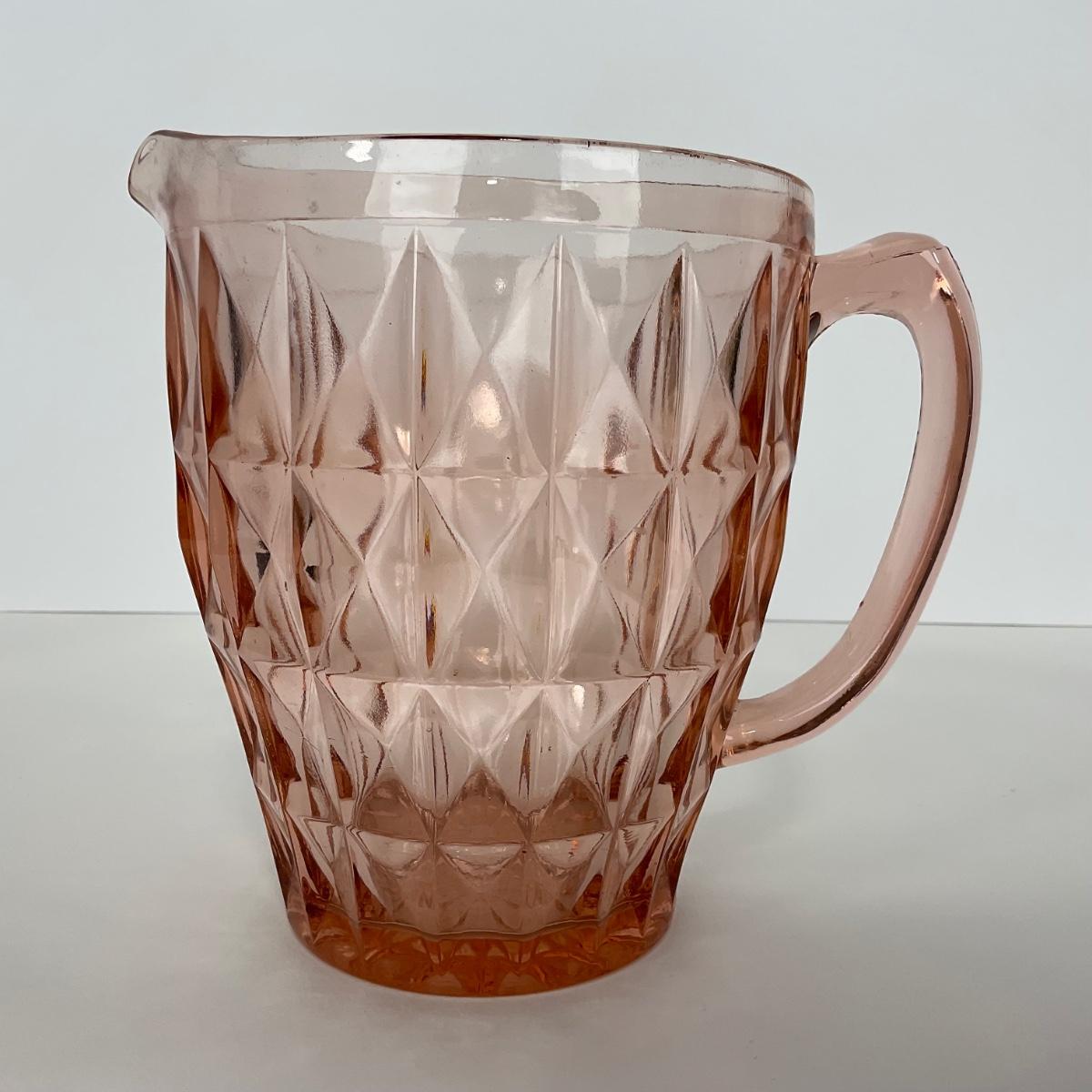 One pink Windsor Diamond Jeanette Glass Co. (1932-1946) Pitcher. Please see photos for details and condition. ::: Shipping is available on this lot. If you require shipping you must let us know at the close of the auction. We will coordinate with you after the item has been won. Shipping fees will include insurance up to or exceeding the value of all items being mailed. If you have any questions regarding this lot please contact the auctioneer either via this website, by direct email or by phone. PICK UP TIMES and other important information can be found in the TERMS and DESCRIPTION of the auction. Please take a look for pertinent information. Thanks!