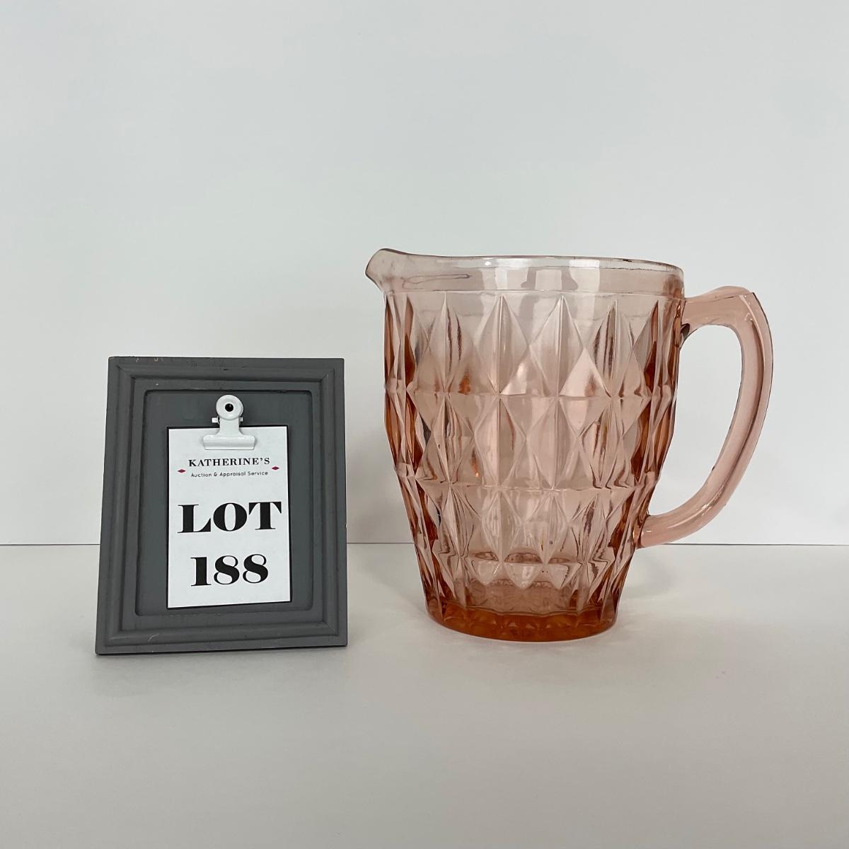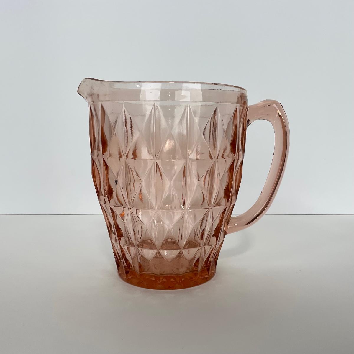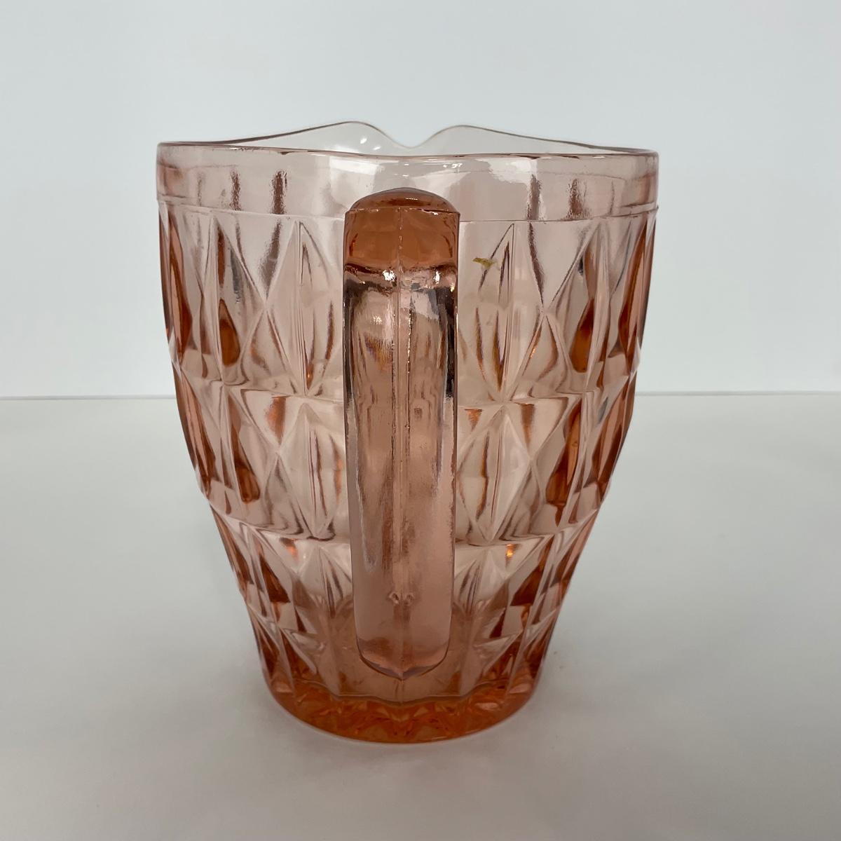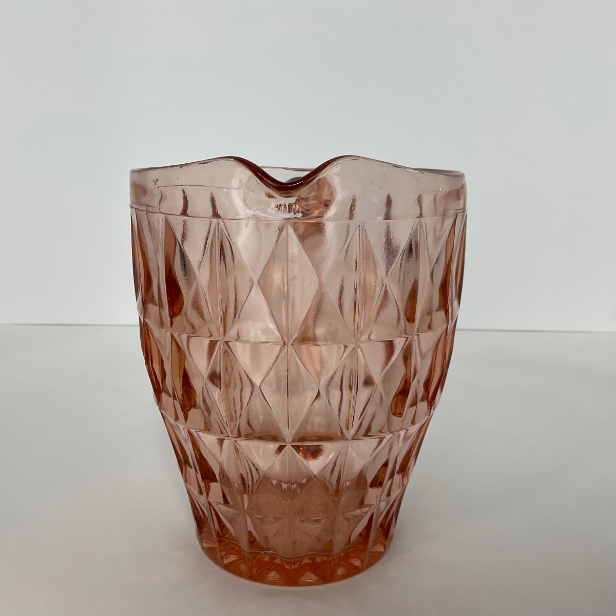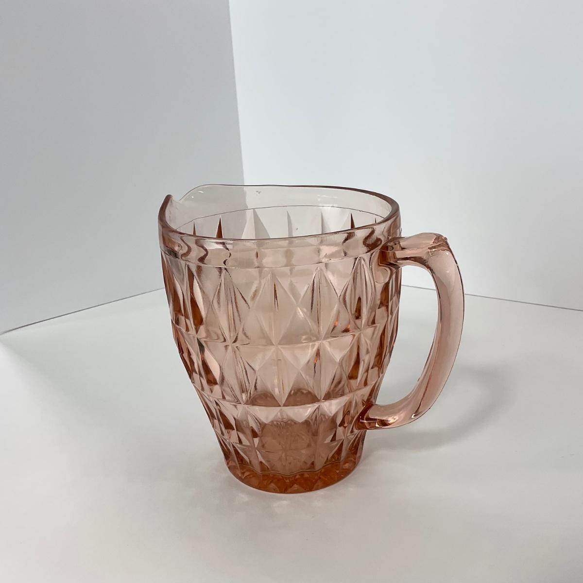 One pink Windsor Diamond Jeanette Glass Co. (1932-1946) Pitcher. Please see photos for details and condition. ::: Shipping is available on this lot. If you require shipping you must let us know at the close of the auction. We will coordinate with you after the item has been won. Shipping fees will include insurance up to or exceeding the value of all items being mailed. If you have any questions regarding this lot please contact the auctioneer either via this website, by direct email or by phone. PICK UP TIMES and other important information can be found in the TERMS and DESCRIPTION of the auction. Please take a look for pertinent information. Thanks!