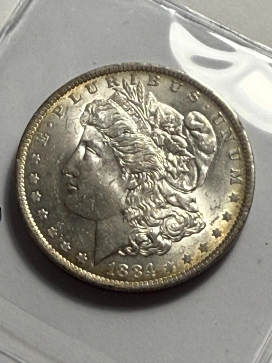 1884-O MS62 QUALITY TAPE LINE TONED MORGAN SILVER DOLLAR COIN #23 AS PICTURED. $5 DOMESTIC SHIPPING.