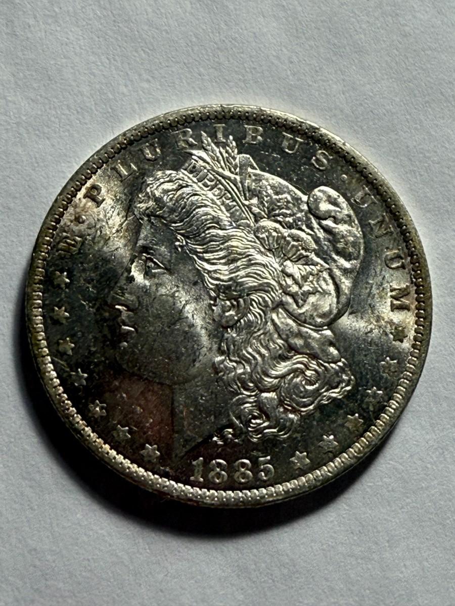 1885-O UNCIRCULATED CONDITION LIGHTLY TONED OBV MORGAN SILVER DOLLAR. $5 DOMESTIC SHIPPING.