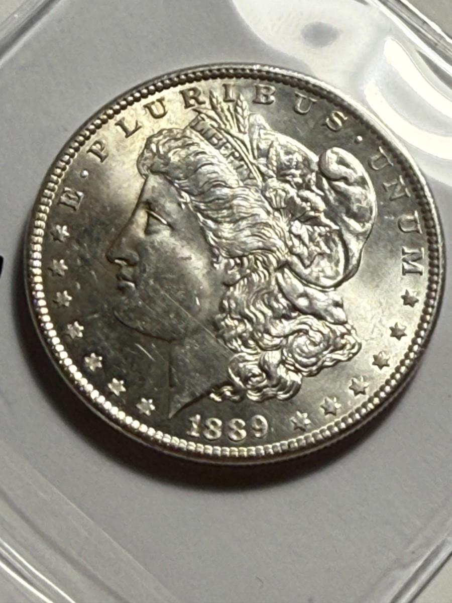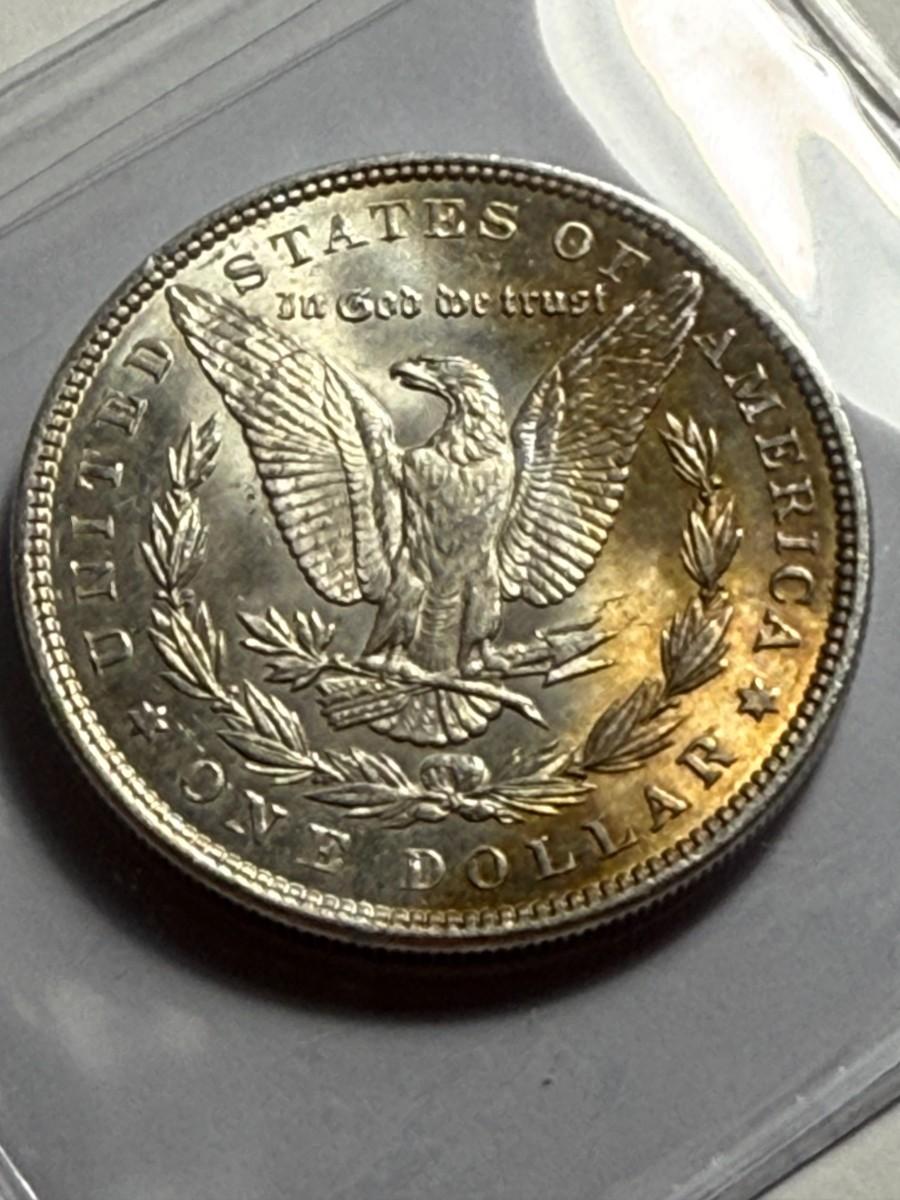1889-P MS63 QUALITY GOLD CRESCENT TONED MORGAN SILVER DOLLAR COIN #21 AS PICTURED. $5 DOMESTIC SHIPPING.