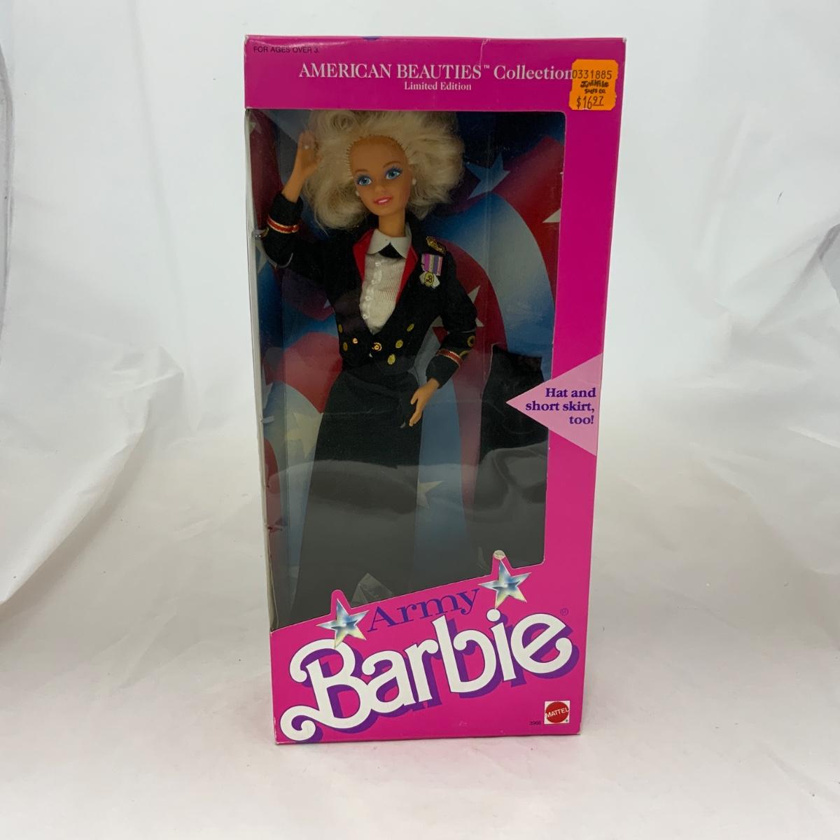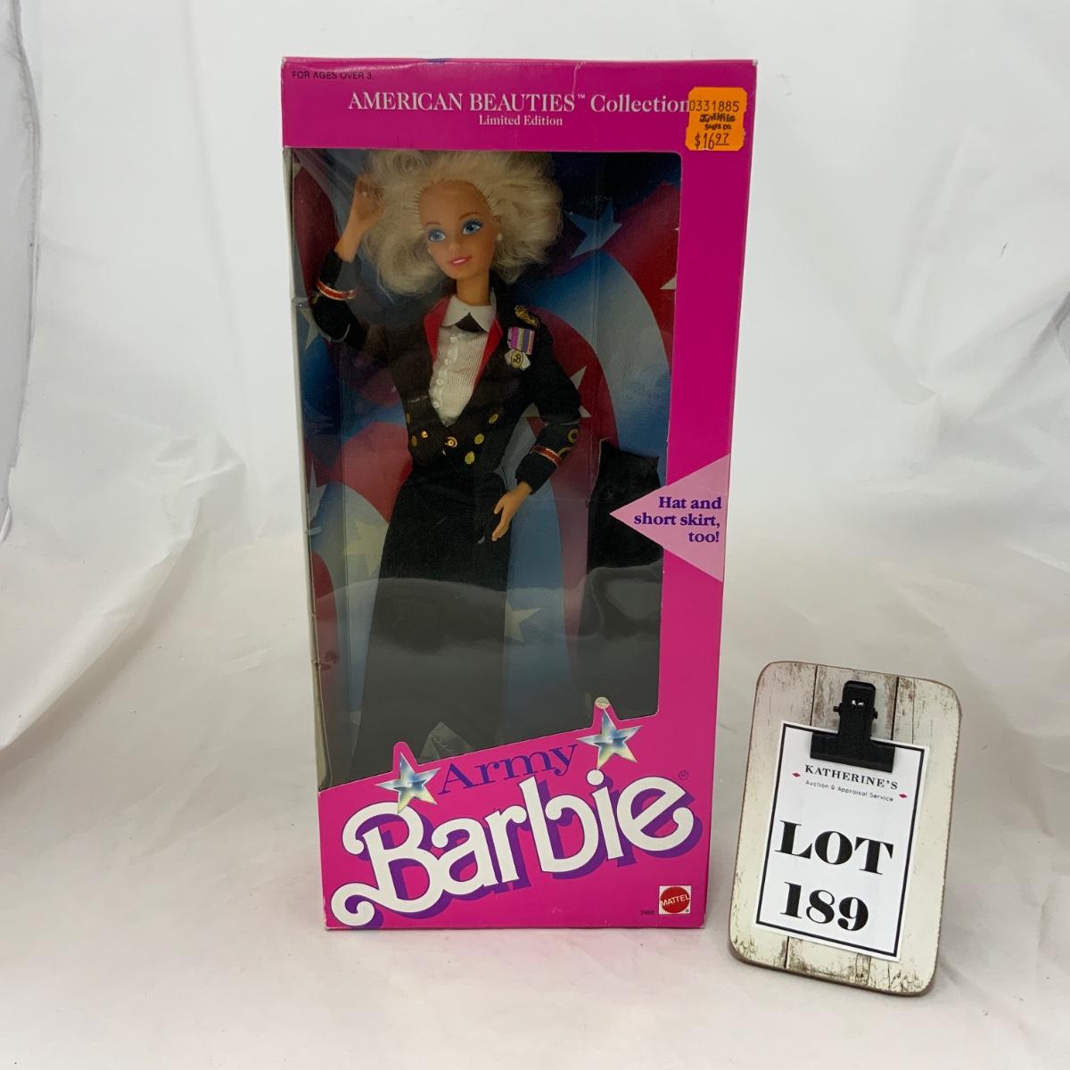 Army Barbie, part of the American Beauties Collection, released in 1989 by Mattel. Don’t worry, she comes with a shorter skirt too! Doll is new, in box. Please see photos for details and condition. !!! Proceeds from this auction will be donated to the NEW COMMUNITY SHELTER in Green Bay, Wisconsin. Please see Sale Description to the Left for more information. !!! ::: Shipping is available on this lot. If you require shipping you must let us know at the close of the auction. We will coordinate with you after the item has been won. Shipping fees will include insurance up to or exceeding the value of all items being mailed. If you have any questions regarding this lot please contact the auctioneer either via this website, by direct email or by phone. PICK UP TIMES and other important information can be found in the TERMS and DESCRIPTION of the auction. Please take a look for pertinent information. Thanks!