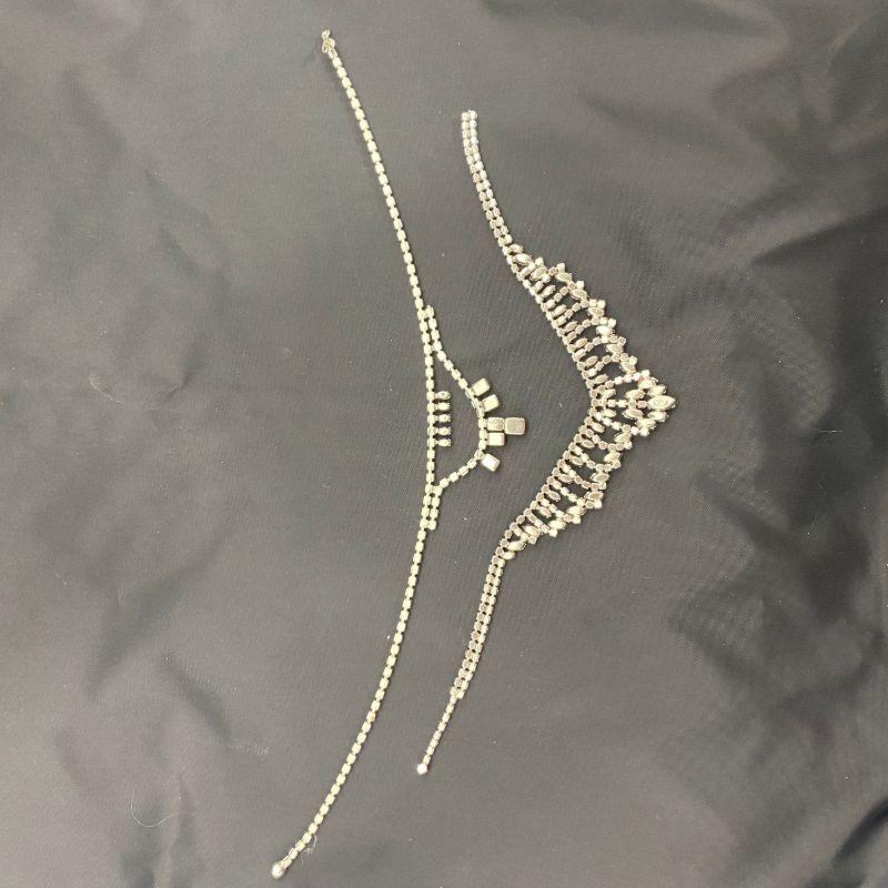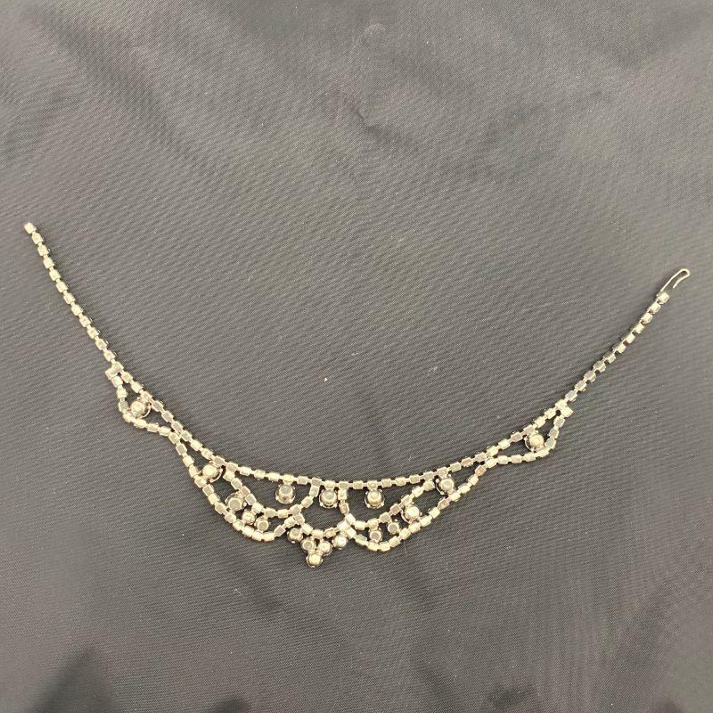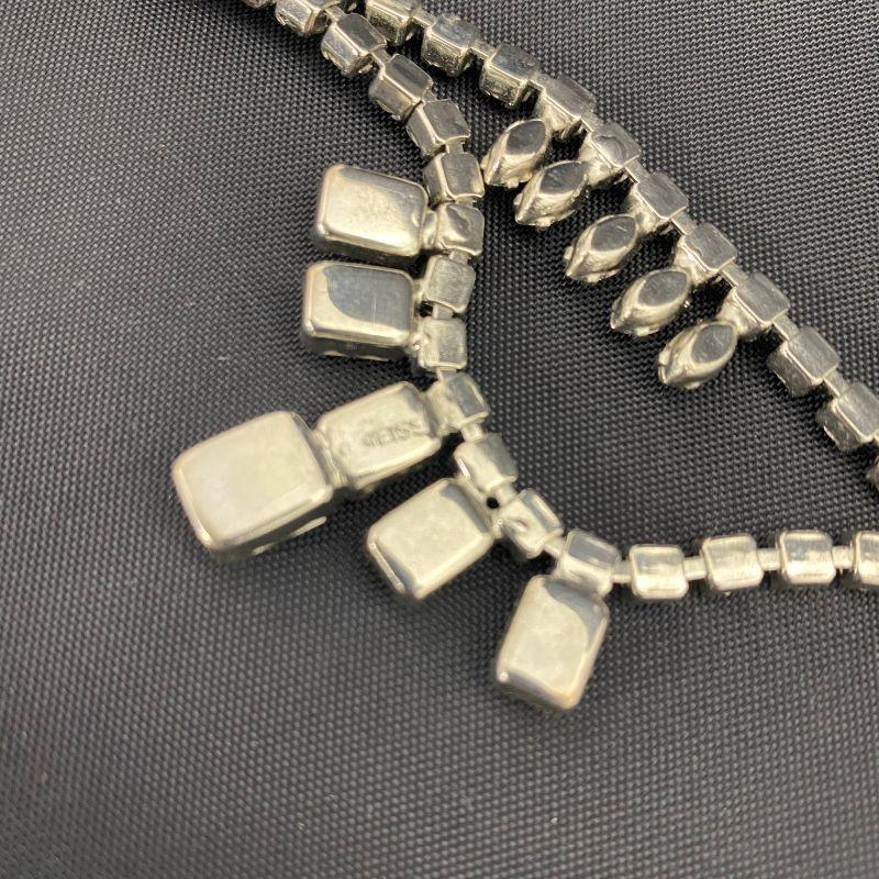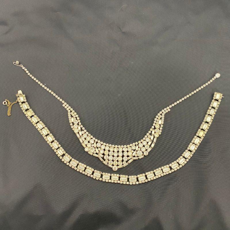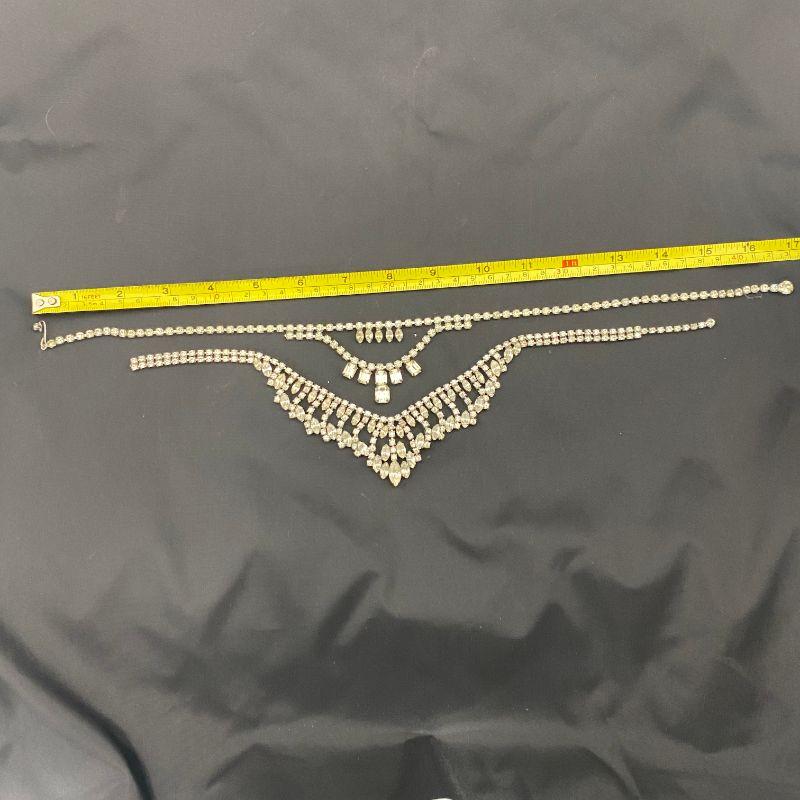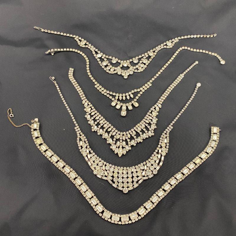 Five gorgeous Rhinestone Necklaces to add to your collection! Who needs a special occasion to wear them?! Vacuum in your sparkles! Third from the bottom marked Coro, Fourth from the bottom marked Weiss. No missing stones noted. Minimal to no discoloration throughout as expected with the age of the jewelry.
