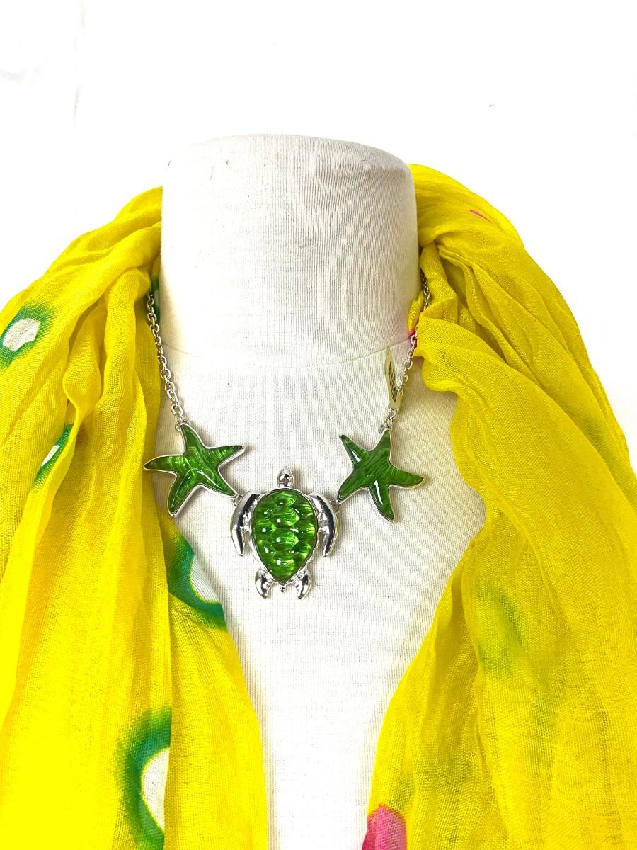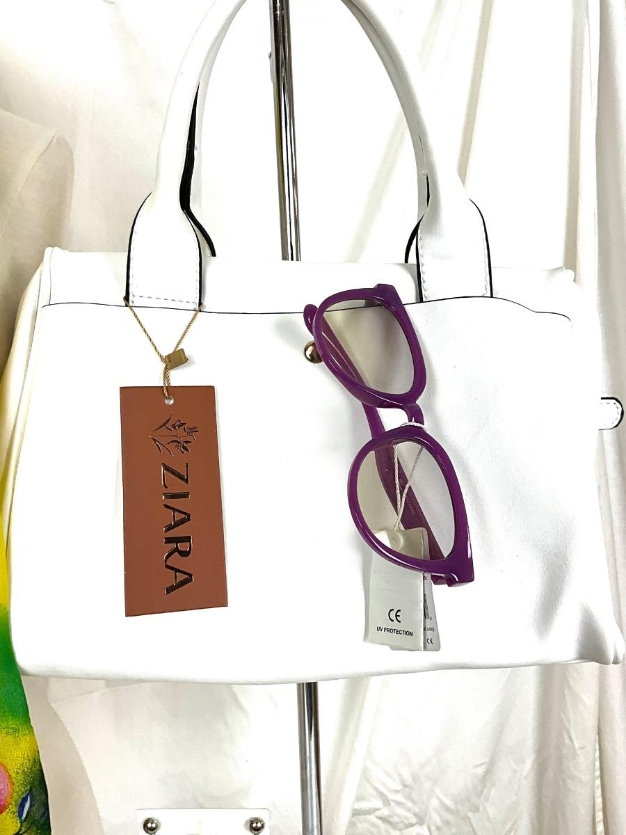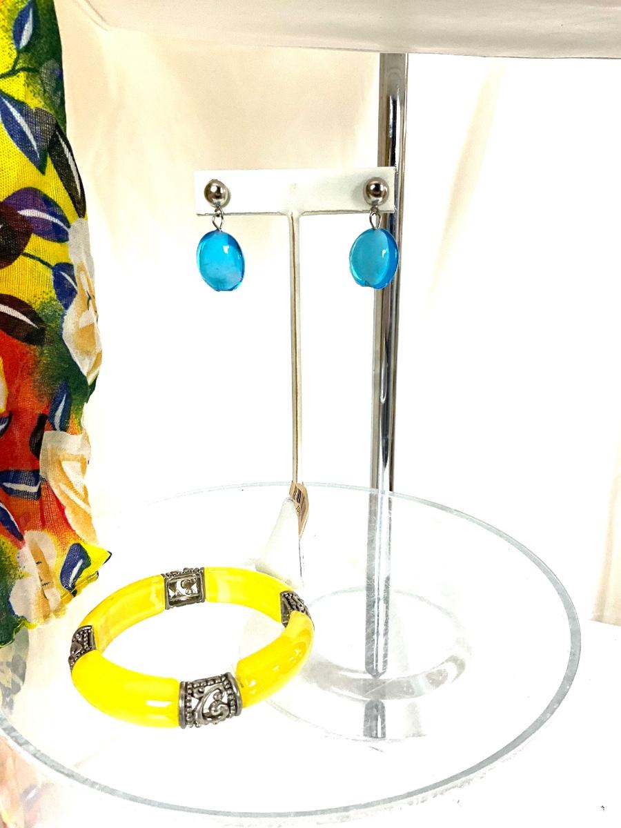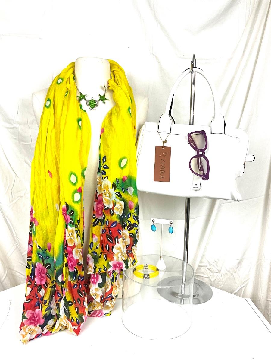 189 Yellow Floral Shawl with White Handbag, Purple Sunglasses, Yellow Bracelet, and Aqua Earrings