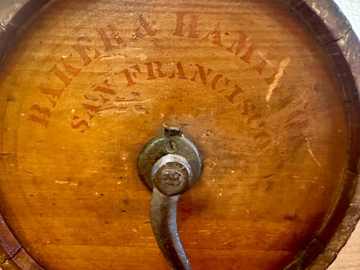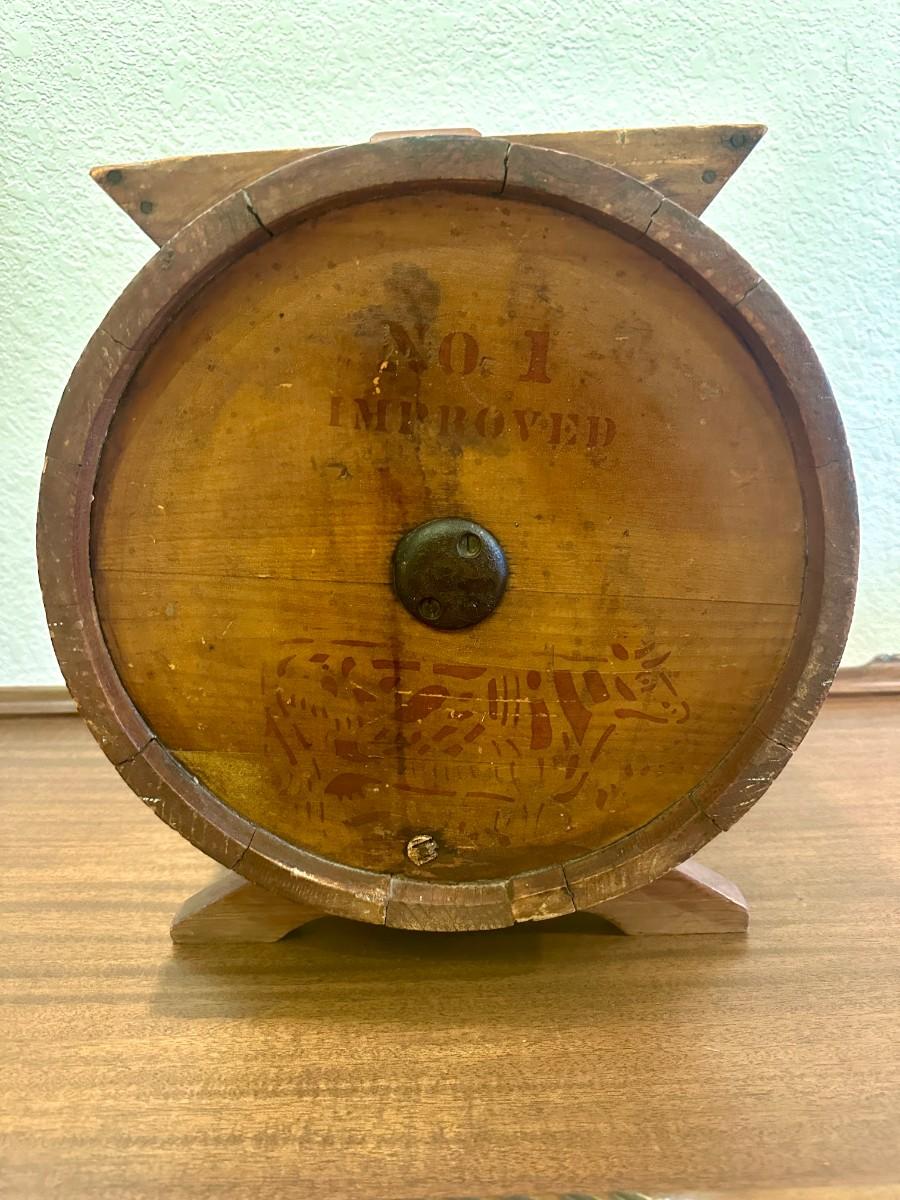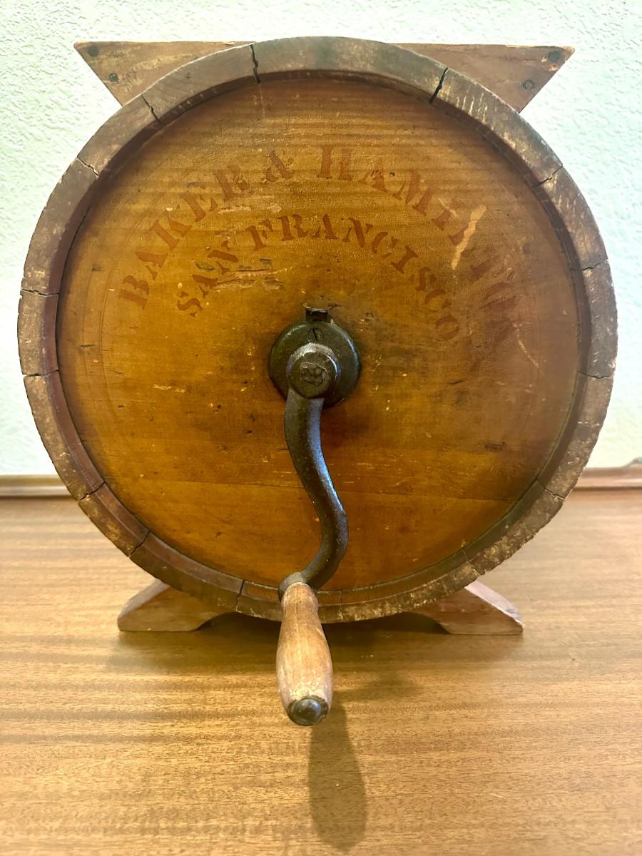 Home use butter churn from approximately 1890. Crank side reads Baker & Hamilton, San Francisco. Front reads No. 1 Improved with a cow stencil that was popular on several brands in the late 1800's. Shows wear as a working appliance and some stain fading and scratches.