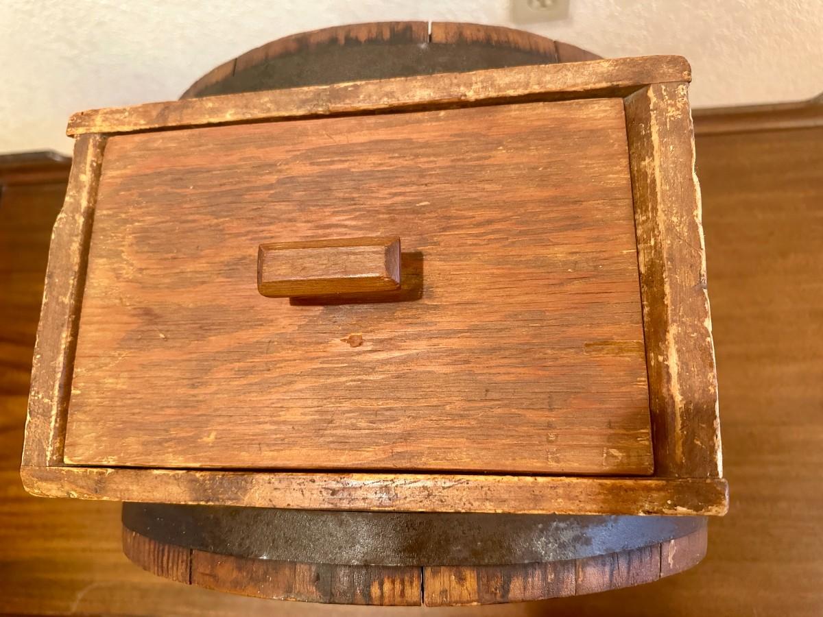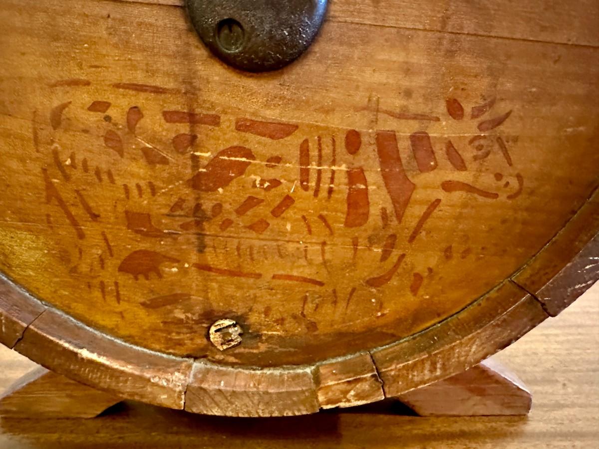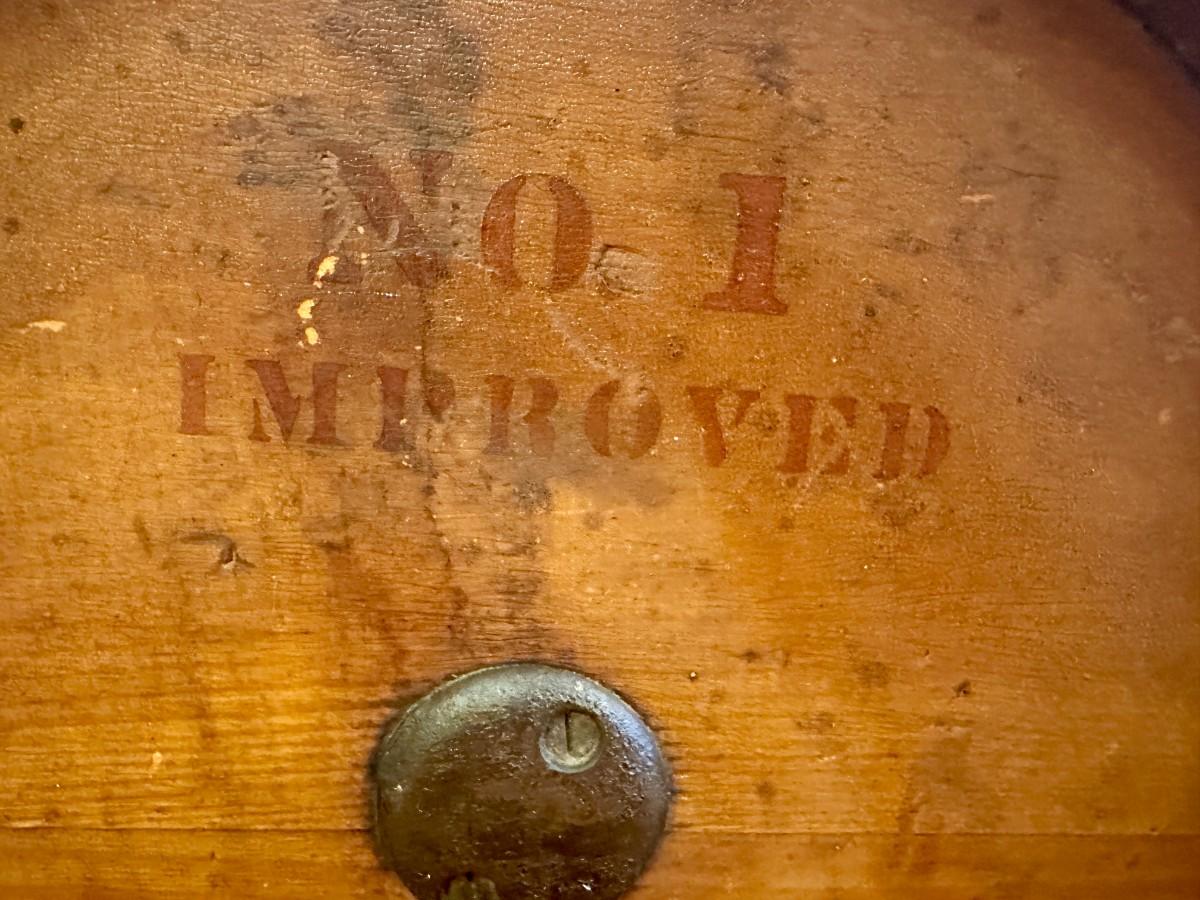 Home use butter churn from approximately 1890. Crank side reads Baker & Hamilton, San Francisco. Front reads No. 1 Improved with a cow stencil that was popular on several brands in the late 1800's. Shows wear as a working appliance and some stain fading and scratches.