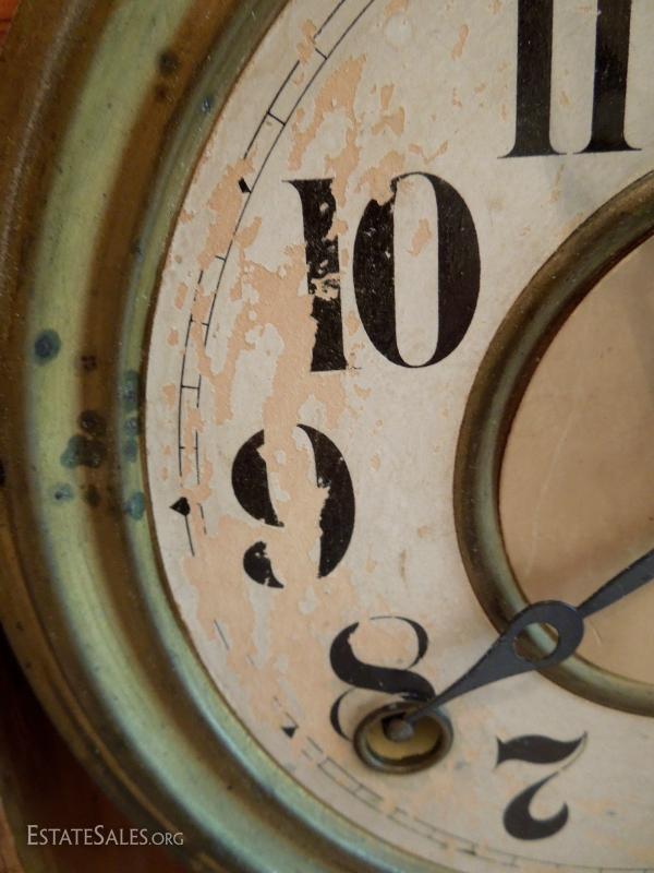 Clock is not working. Case is dusty. Face of clock has peeling paint. Comes with two keys. No broken parts. Spring is touching side of case which may be why it is not working.