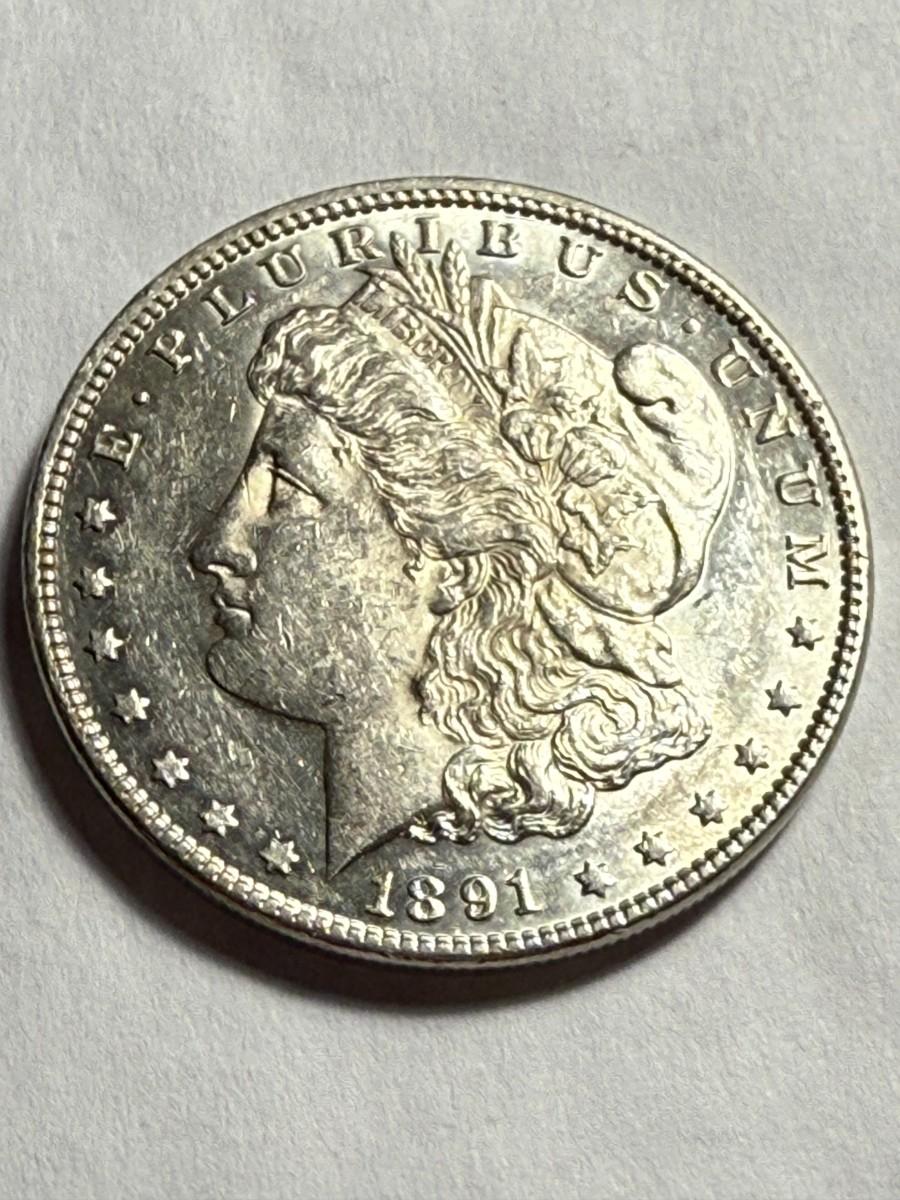 1891-P AU CONDITION LIGHTLY CLEANED MORGAN SILVER DOLLAR. $5 DOMESTIC SHIPPING.
