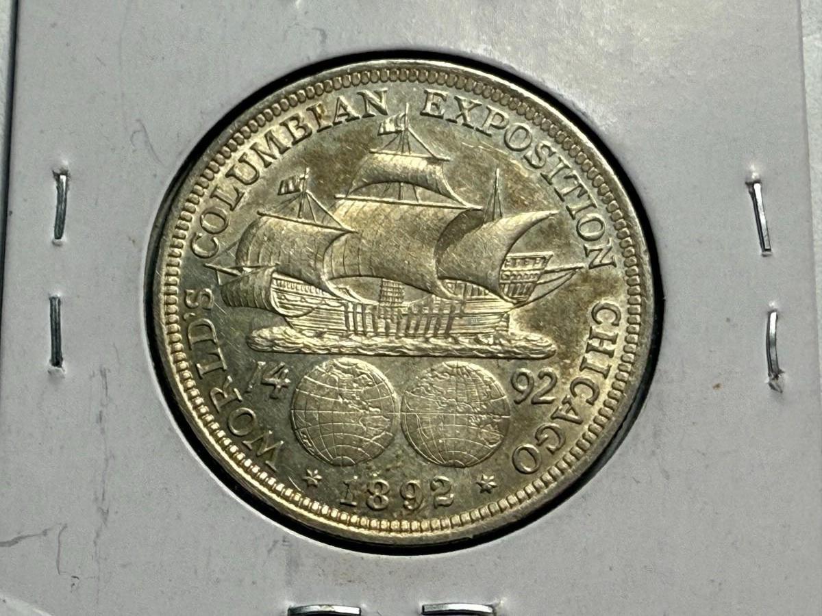 1892 AU COLUMBIAN EXPOSITION SILVER COMMEMORATIVE HALF DOLLAR AS PICTURED. $5 DOMESTIC SHIPPING.